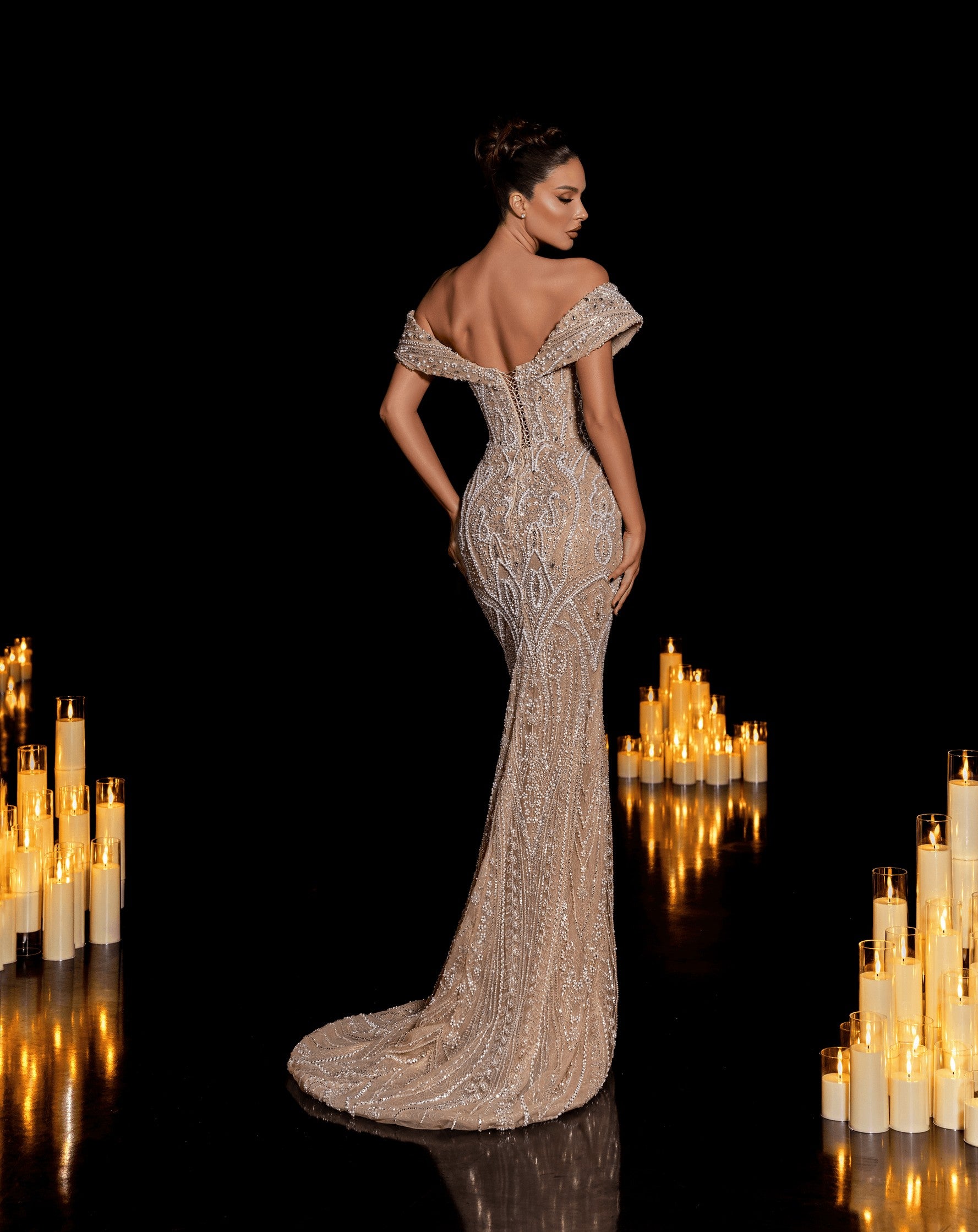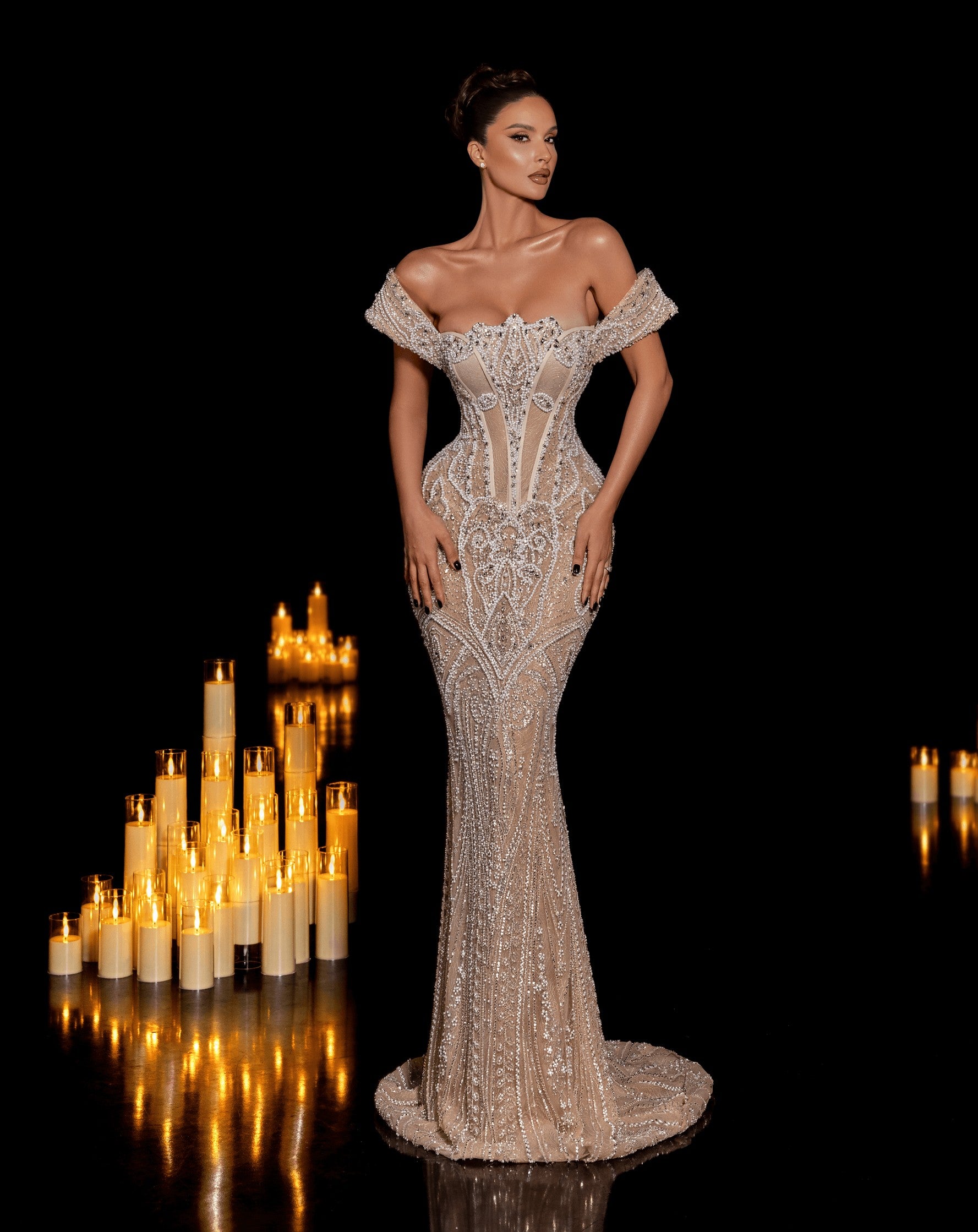 - Figure-sculpting mermaid silhouette with sweeping train, perfect for galas and red-carpet glamour