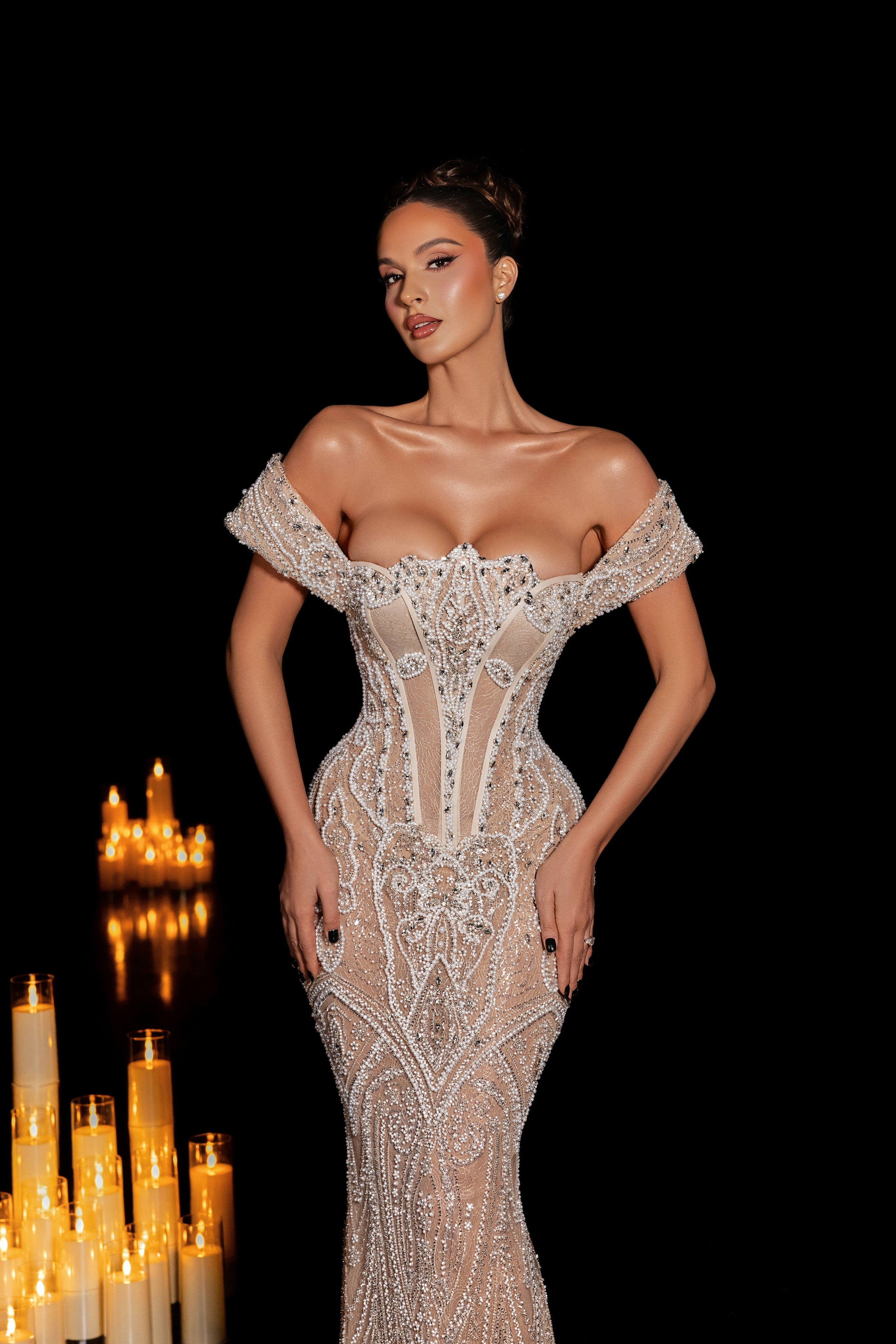 - Dramatic off-shoulder neckline with structured corset bodice and illusion panels for bold sophistication