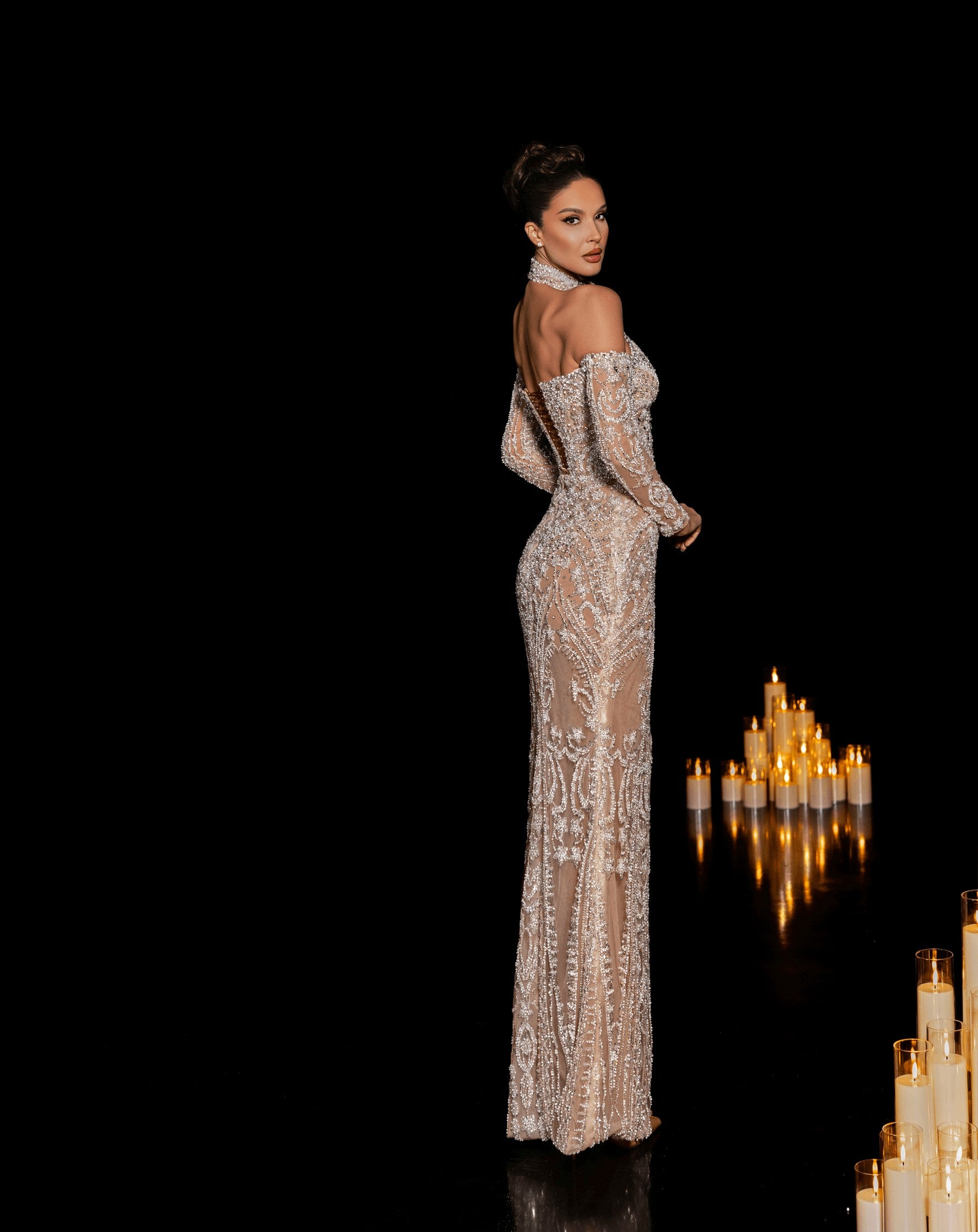 - Dramatic high halter neckline with cold shoulder cutouts and long illusion sleeves for modern sophistication