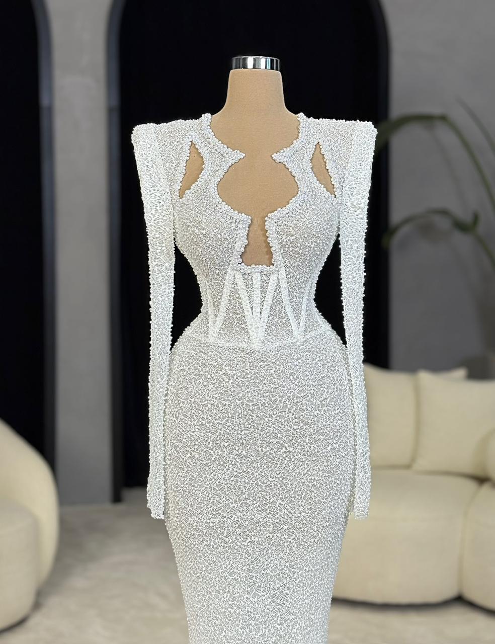 Bold architectural design meets luxurious beadwork in this statement-making ivory gown. Dramatic structured shoulder details and a plunging corset bodice create an unforgettable silhouette, while allover crystal beading adds shimmer. The figure-hugging mermaid cut flows into a graceful train. Perfect for avant-garde weddings, galas, and high-fashion events.