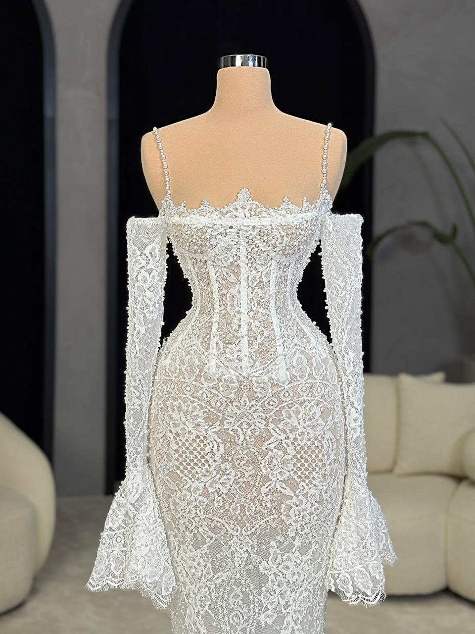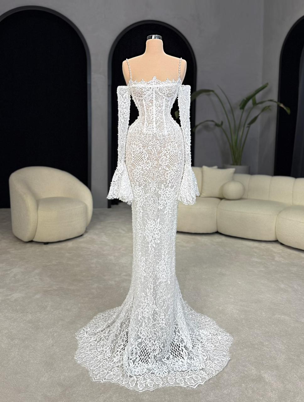 Romantic elegance meets modern sophistication in this exquisite ivory lace gown. Delicate off-shoulder straps and dramatic bell sleeves frame a structured corset bodice, while intricate lace cascades over the figure-hugging mermaid silhouette. The gown flows into a graceful train with scalloped lace edges. Perfect for luxury weddings, romantic galas, and timeless celebrations.
