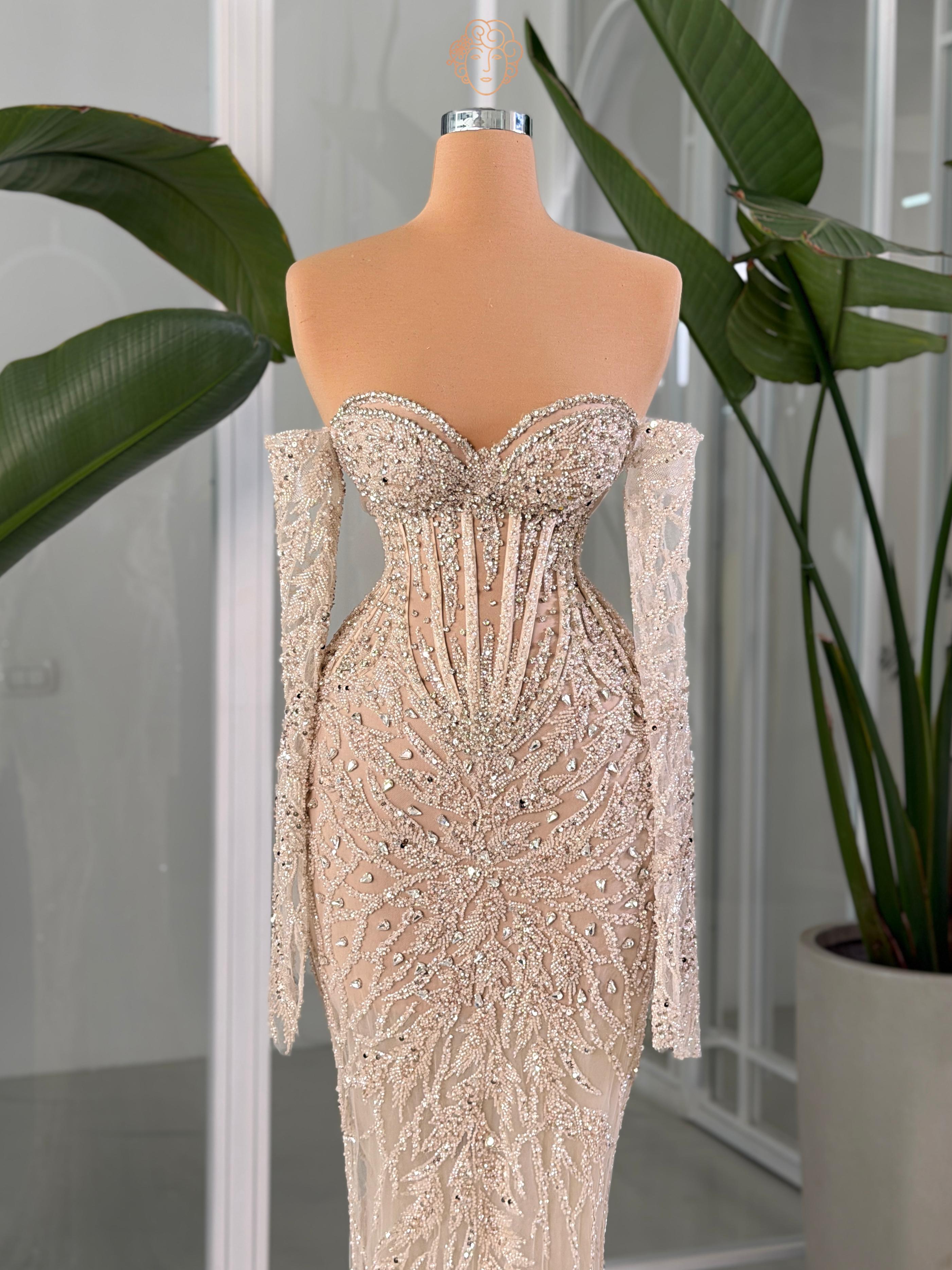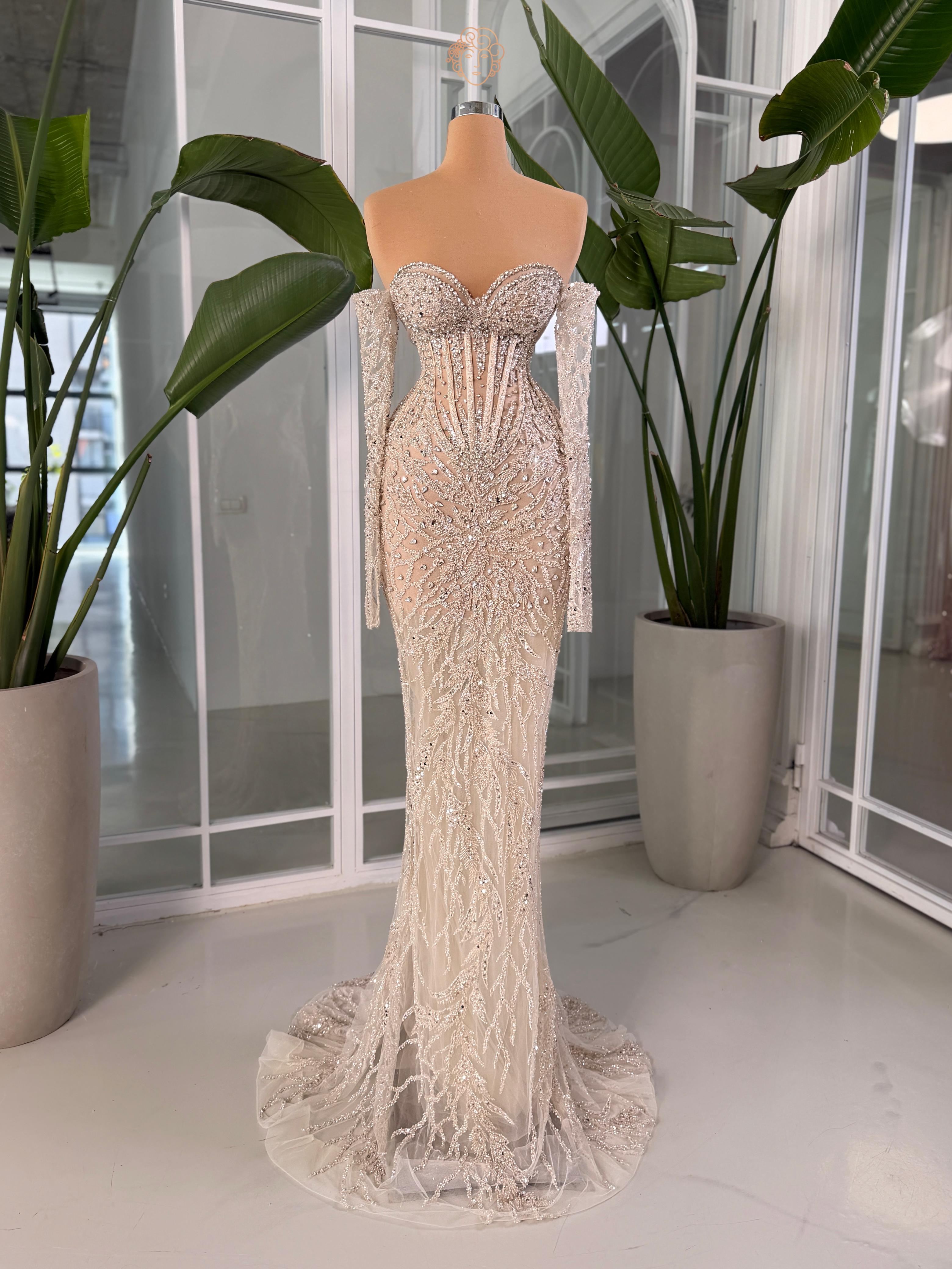 Radiate timeless elegance in this champagne beaded masterpiece. The structured corset bodice features a romantic sweetheart neckline adorned with intricate crystal embellishments, while sheer off-shoulder sleeves add ethereal sophistication. The fitted mermaid silhouette is lavishly embellished with shimmering beadwork that flows into a graceful train, creating pure red-carpet magic.