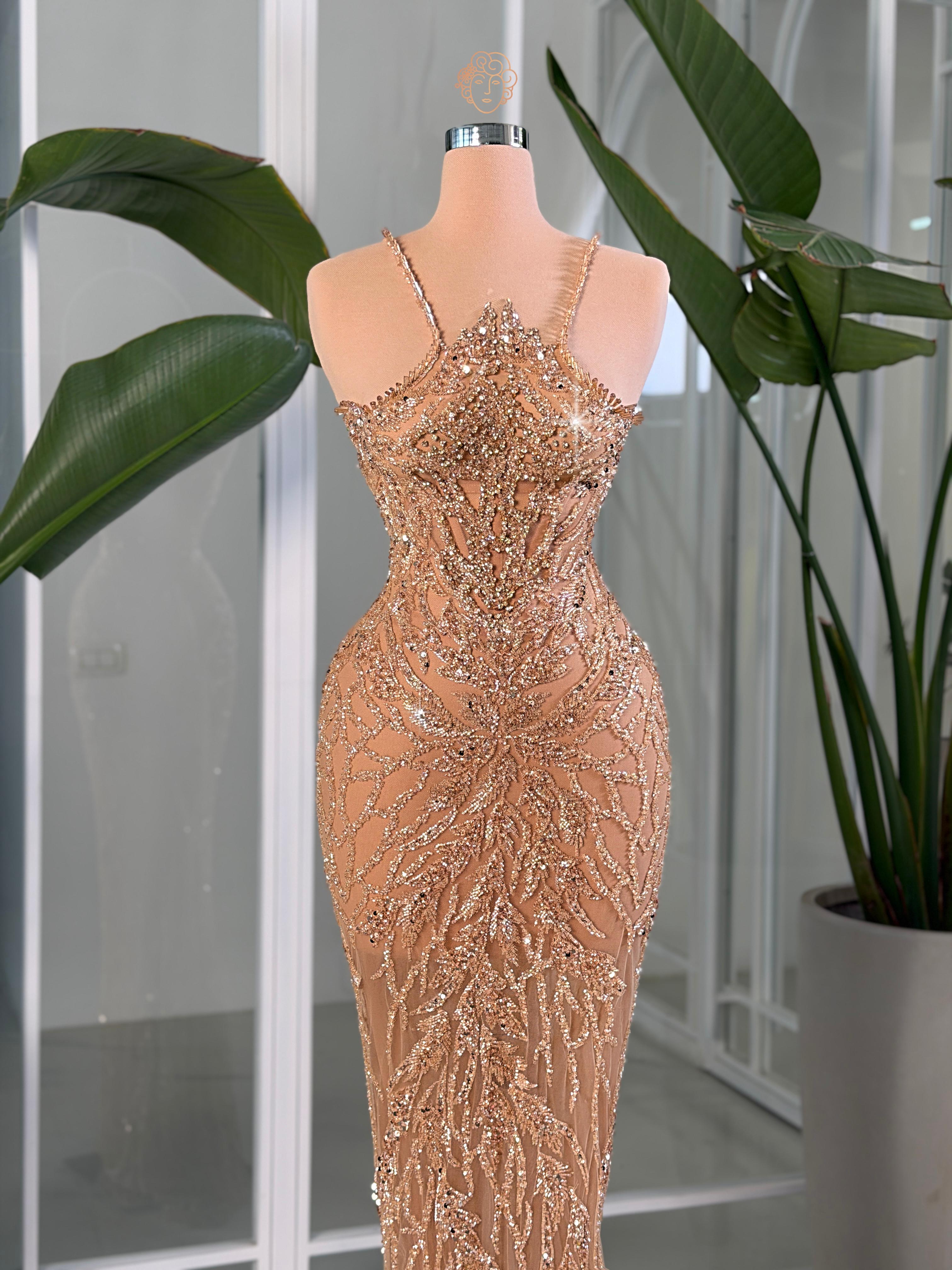 Shimmer like pure gold in this breathtaking beaded column gown. Intricate crystal embellishments create stunning geometric patterns across the sleek silhouette, while delicate chain straps add a touch of modern glamour. The figure-skimming fit and luxurious beadwork ensure you'll captivate from every angle at your next gala or red-carpet moment.