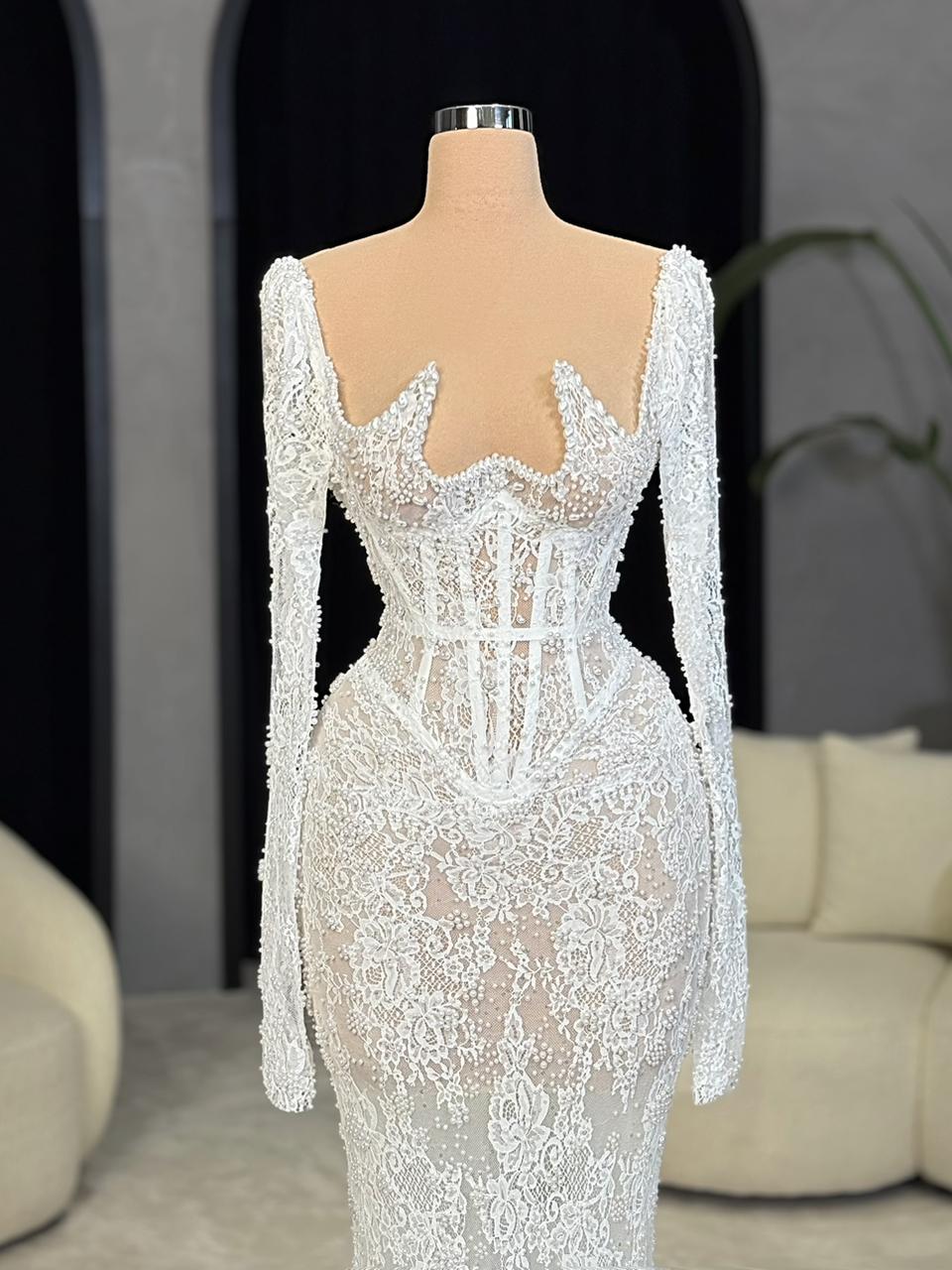 Dramatic elegance meets couture craftsmanship in this show-stopping ivory gown. Intricate lace adorns sheer long sleeves and a structured corset bodice with a daring plunge neckline. The figure-hugging mermaid silhouette flows into a breathtaking lace train. Perfect for luxury weddings, white-tie galas, and unforgettable celebrations.