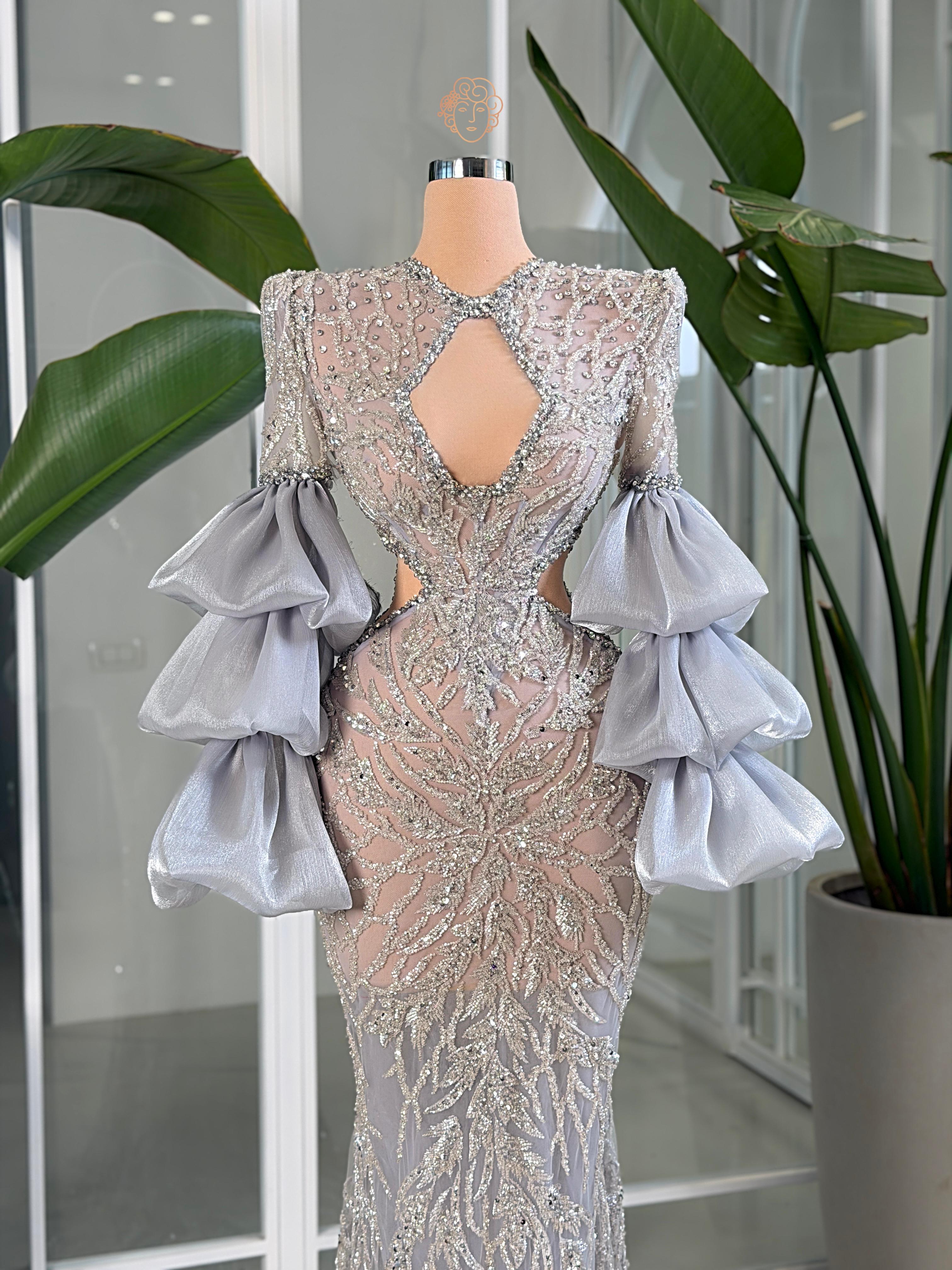 Make a breathtaking entrance in this show-stopping mermaid gown. Lavishly embellished with intricate beadwork and shimmering crystals, the fitted silhouette features dramatic statement sleeves with cascading satin bows. A sultry keyhole cutout at the bodice adds modern allure, while the sweeping train ensures unforgettable red-carpet presence.