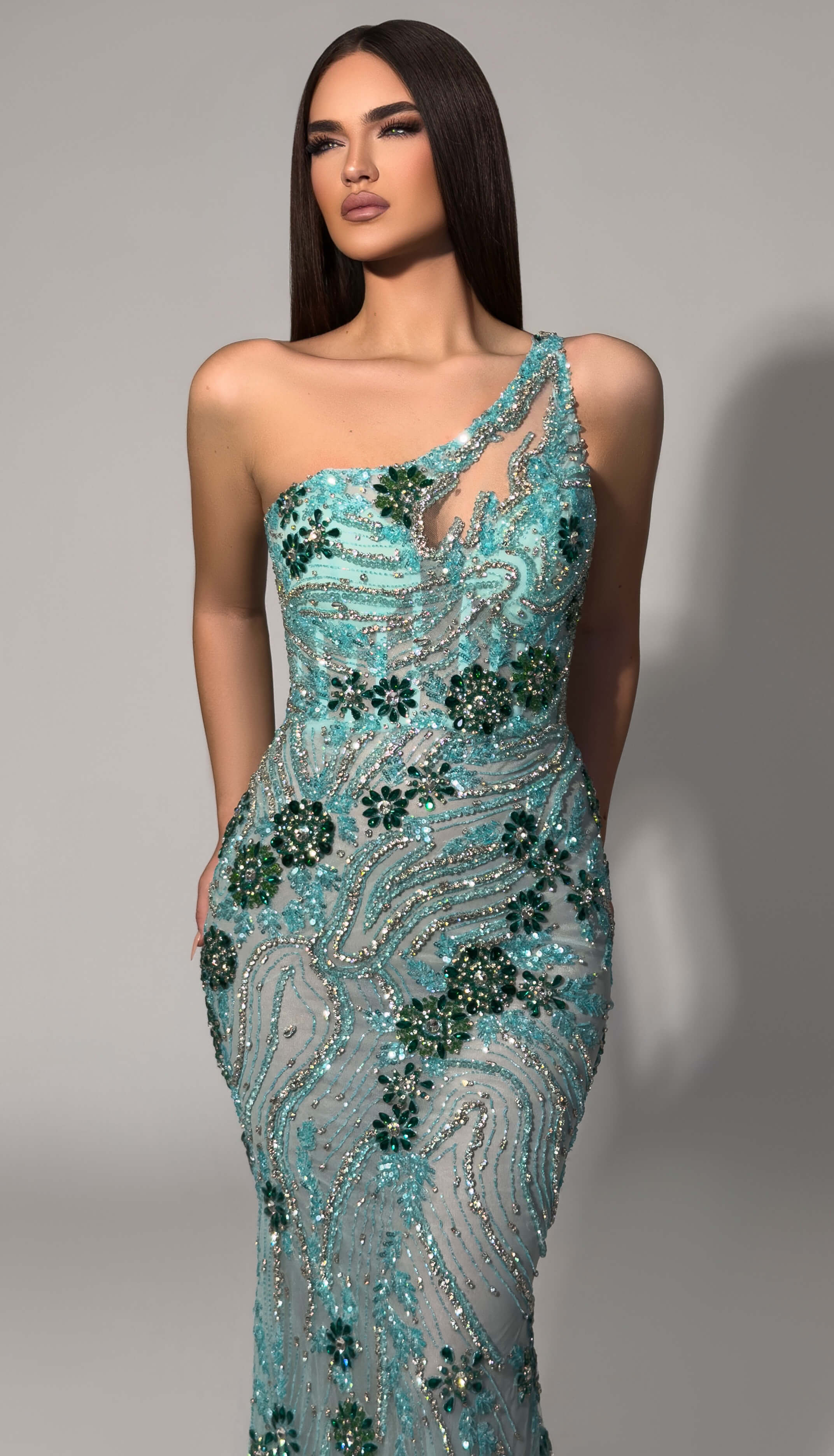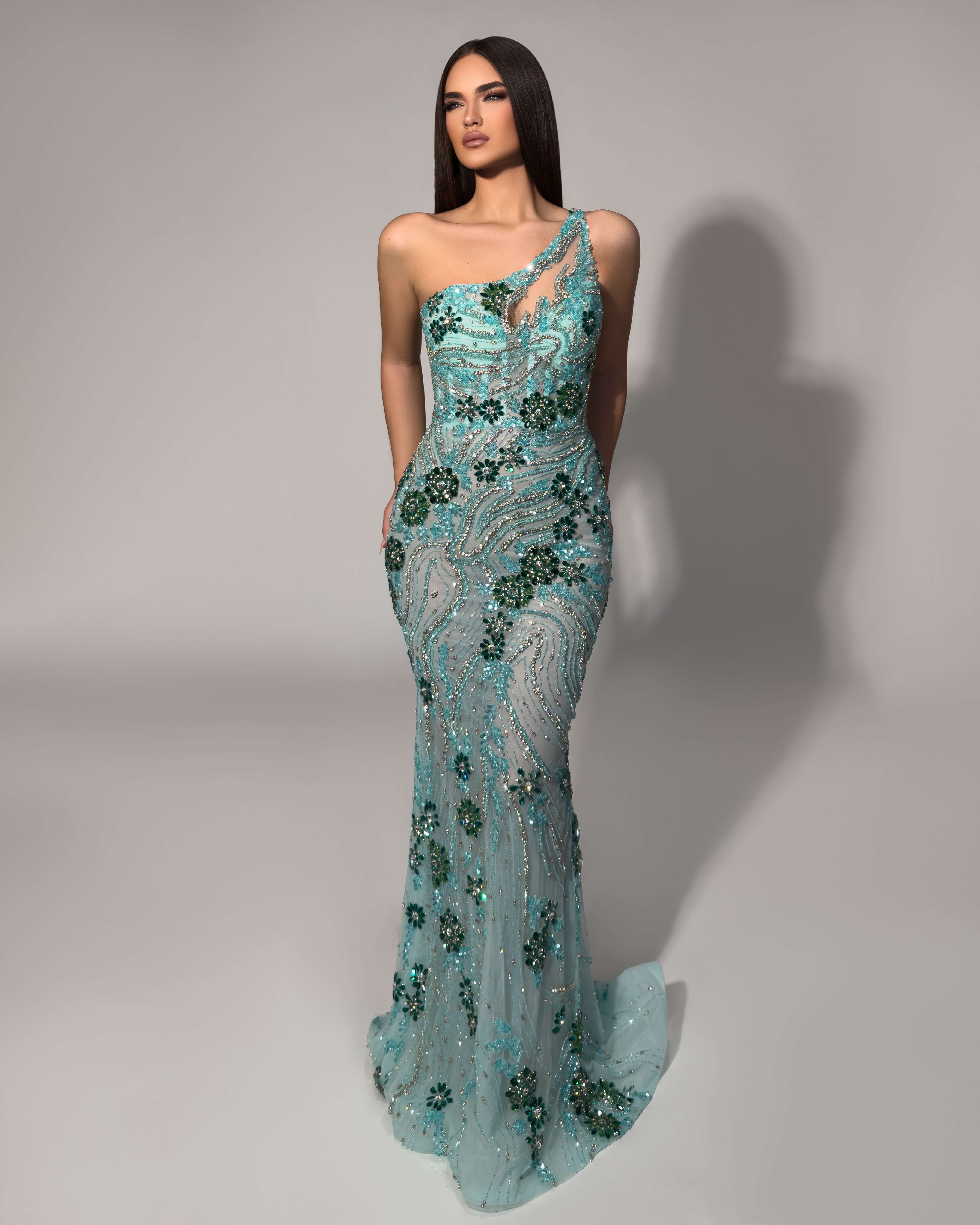 Enchant in this breathtaking aqua evening gown that captures the essence of oceanic elegance. The one-shoulder silhouette features exquisite hand-beaded embellishments in swirling patterns with emerald and turquoise accents that create a mesmerizing dimensional effect. Delicate illusion panels enhance the romantic aesthetic, while the fitted silhouette flows into a graceful floor-length skirt. Perfect for destination weddings, galas, and sophisticated evening affairs.