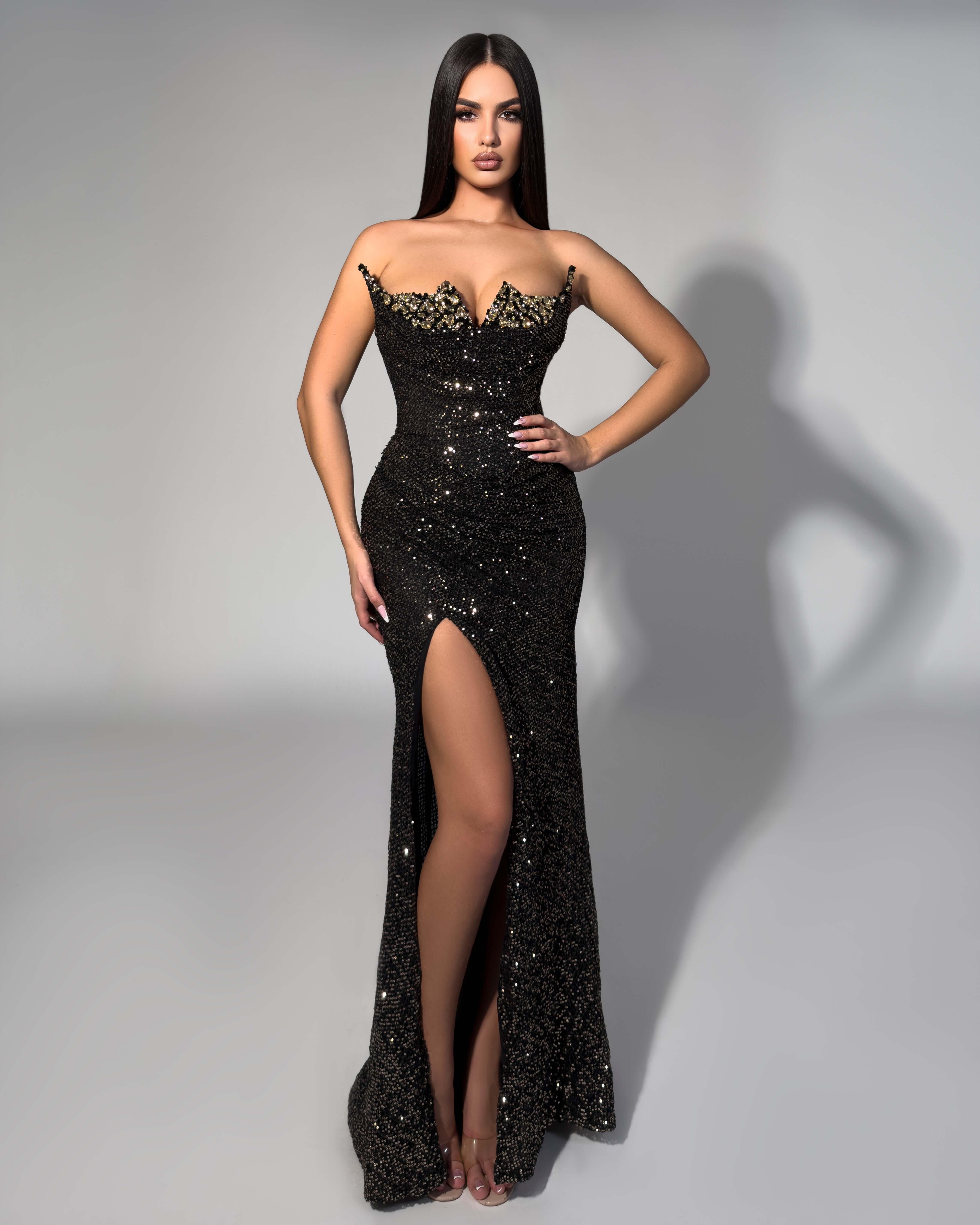 Strapless black gown with a corset-style bodice and crystal-embellished neckline.