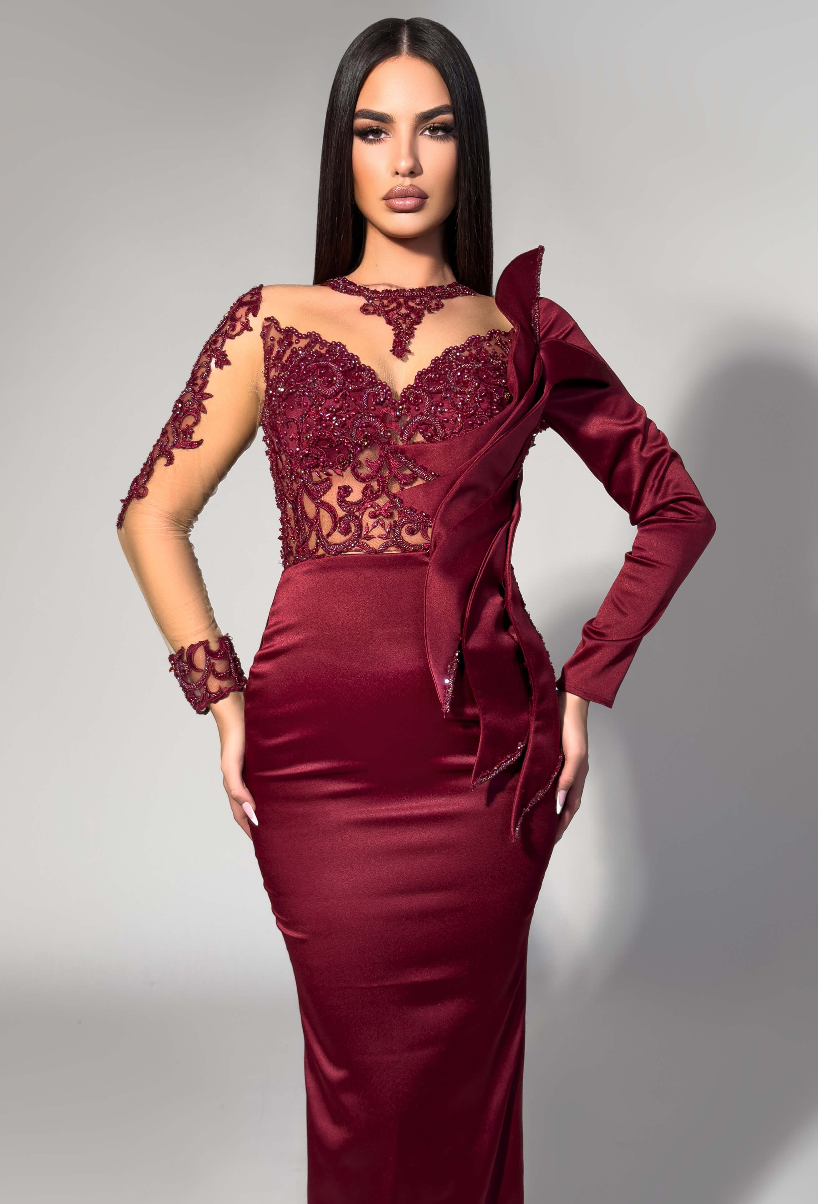 Exude timeless elegance in this sophisticated burgundy gown that masterfully blends romance with modern refinement. The illusion bodice features intricate beaded lace appliqués that create a stunning second-skin effect, while luxurious satin drapes the body in a sleek, floor-length silhouette. Dramatic bow detailing at the hip adds sculptural interest and a couture touch.