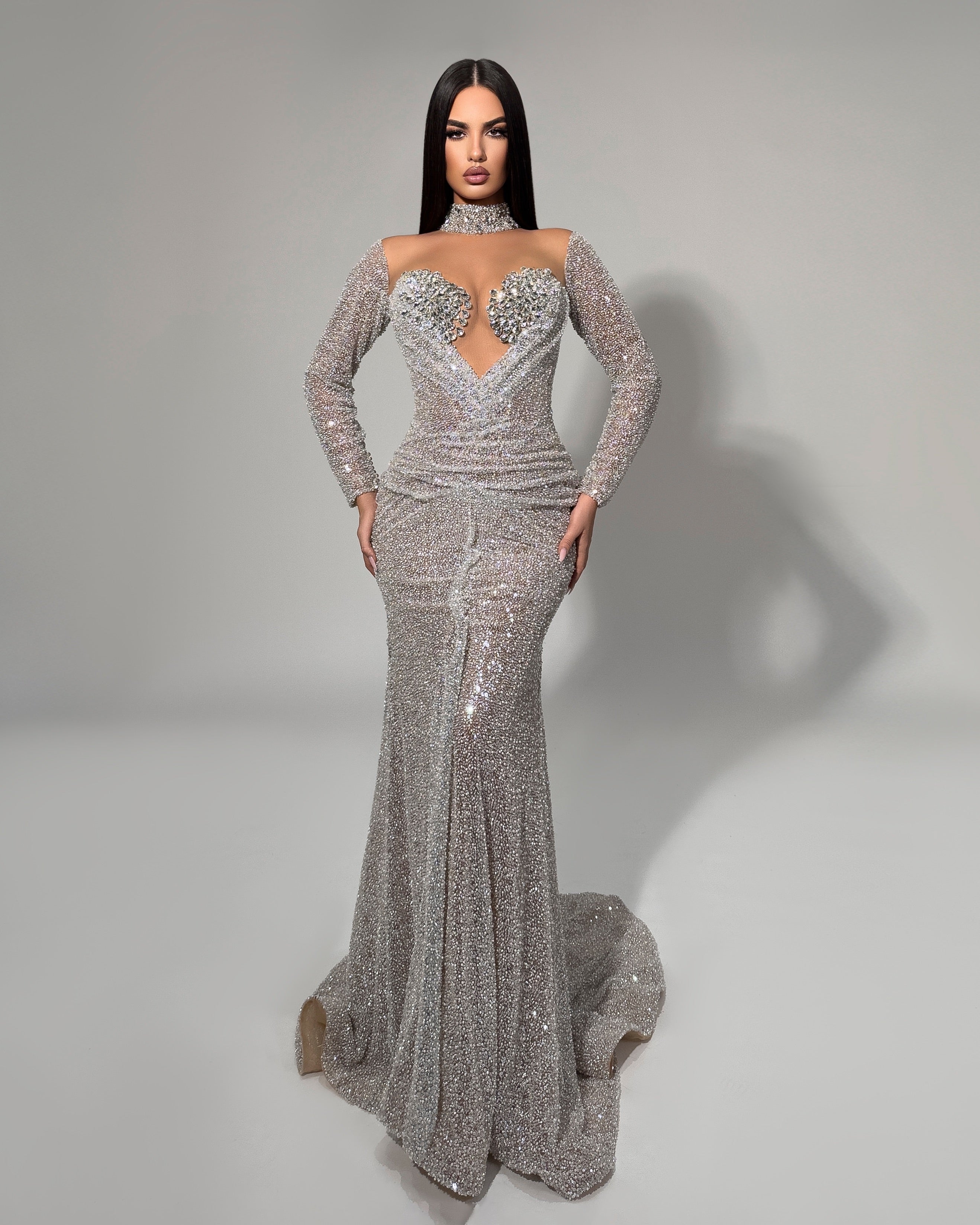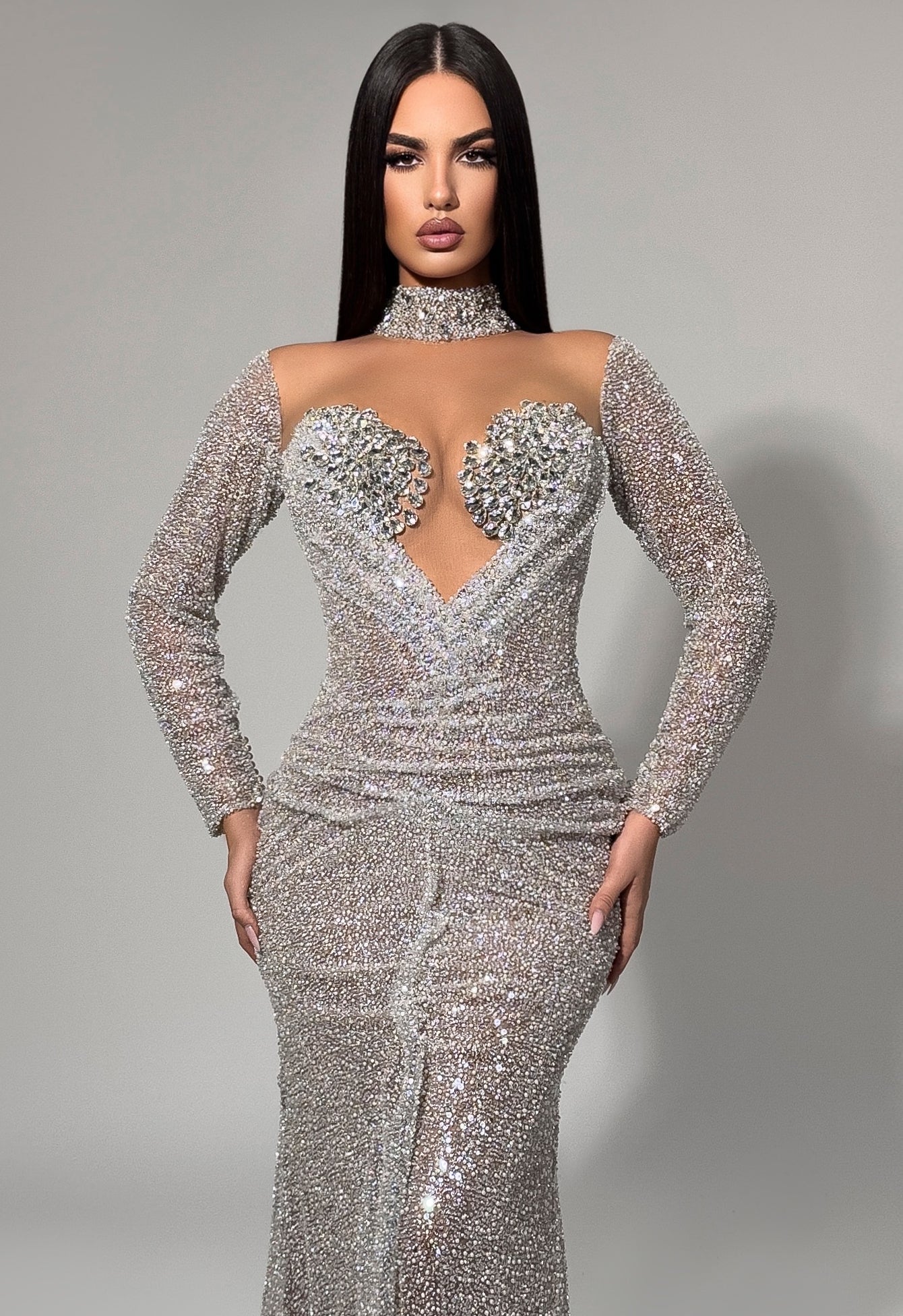 A full sparkle gown with long sleeves, heart shaped crystal details, and a fitted silhouette.