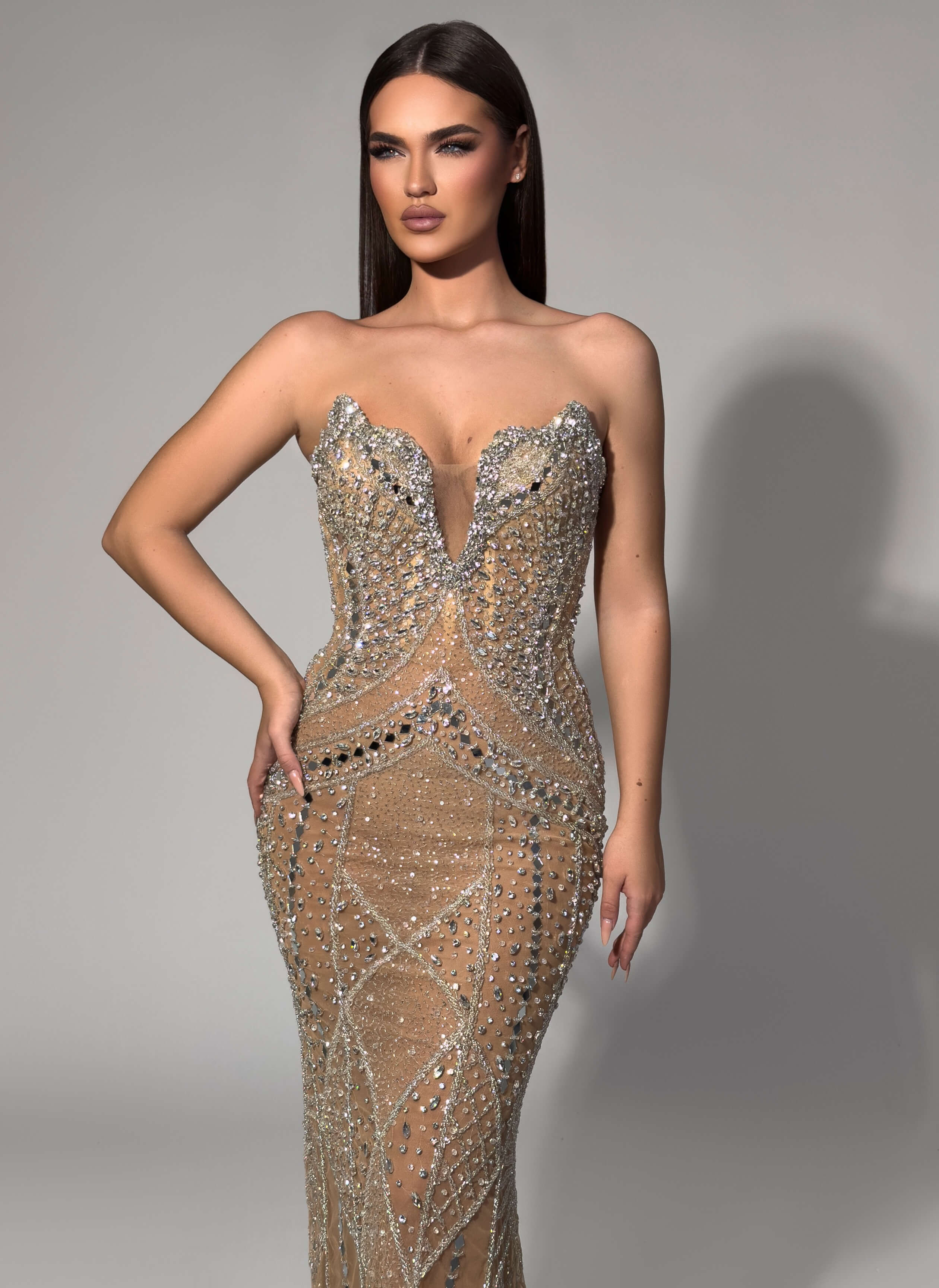 Captivating champagne gown with intricate beaded embellishments throughout. Features a plunging sweetheart neckline with sheer illusion panels and a figure-hugging mermaid silhouette. Perfect for red carpet events and glamorous evenings.