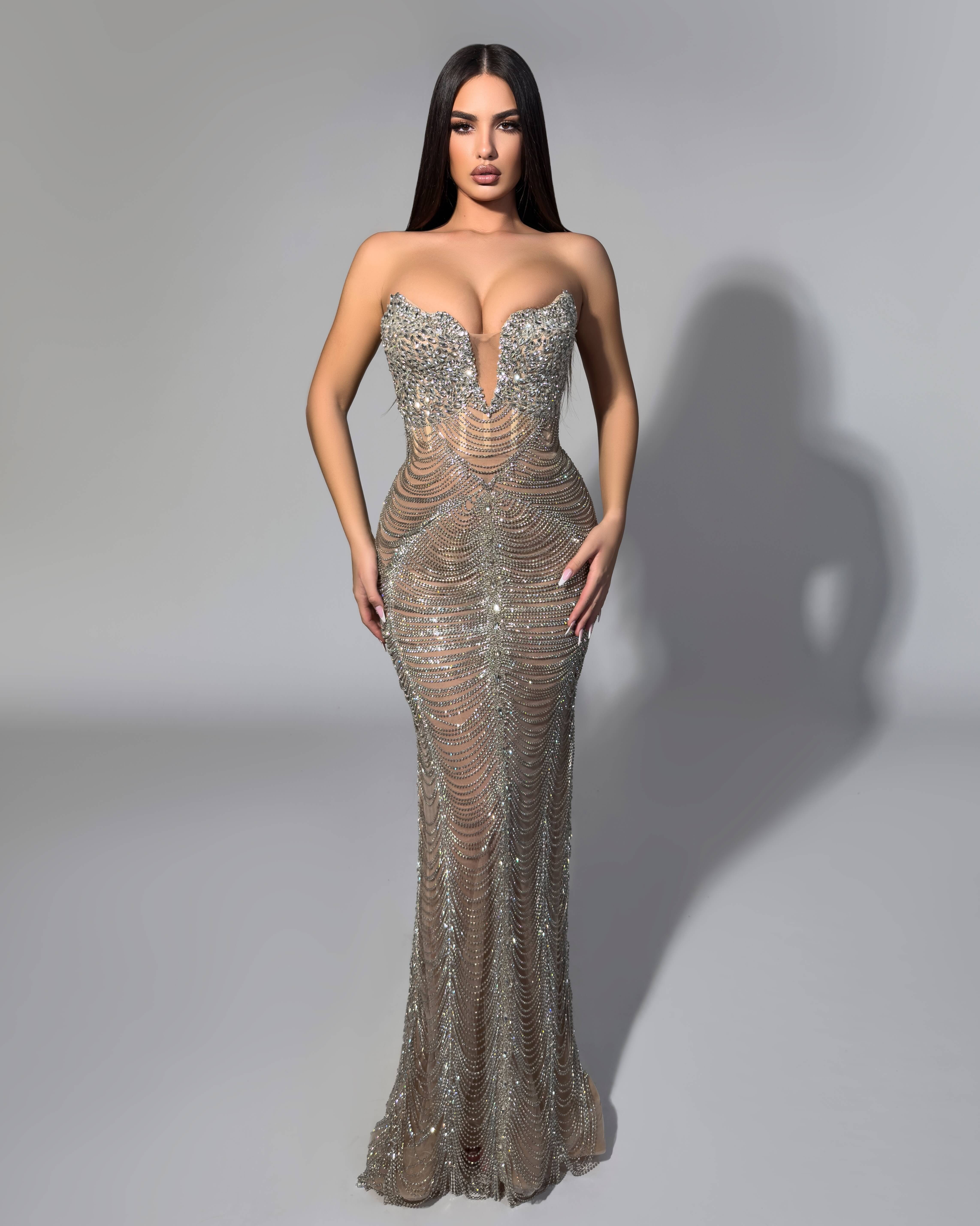 Turn heads in this breathtaking champagne gown that redefines red carpet glamour. Thousands of hand-placed crystals create a dazzling wave pattern across sheer illusion fabric, sculpting the body in pure radiance. The strapless sweetheart neckline frames the décolletage beautifully, while the figure-hugging silhouette flows into a graceful floor-length hem.