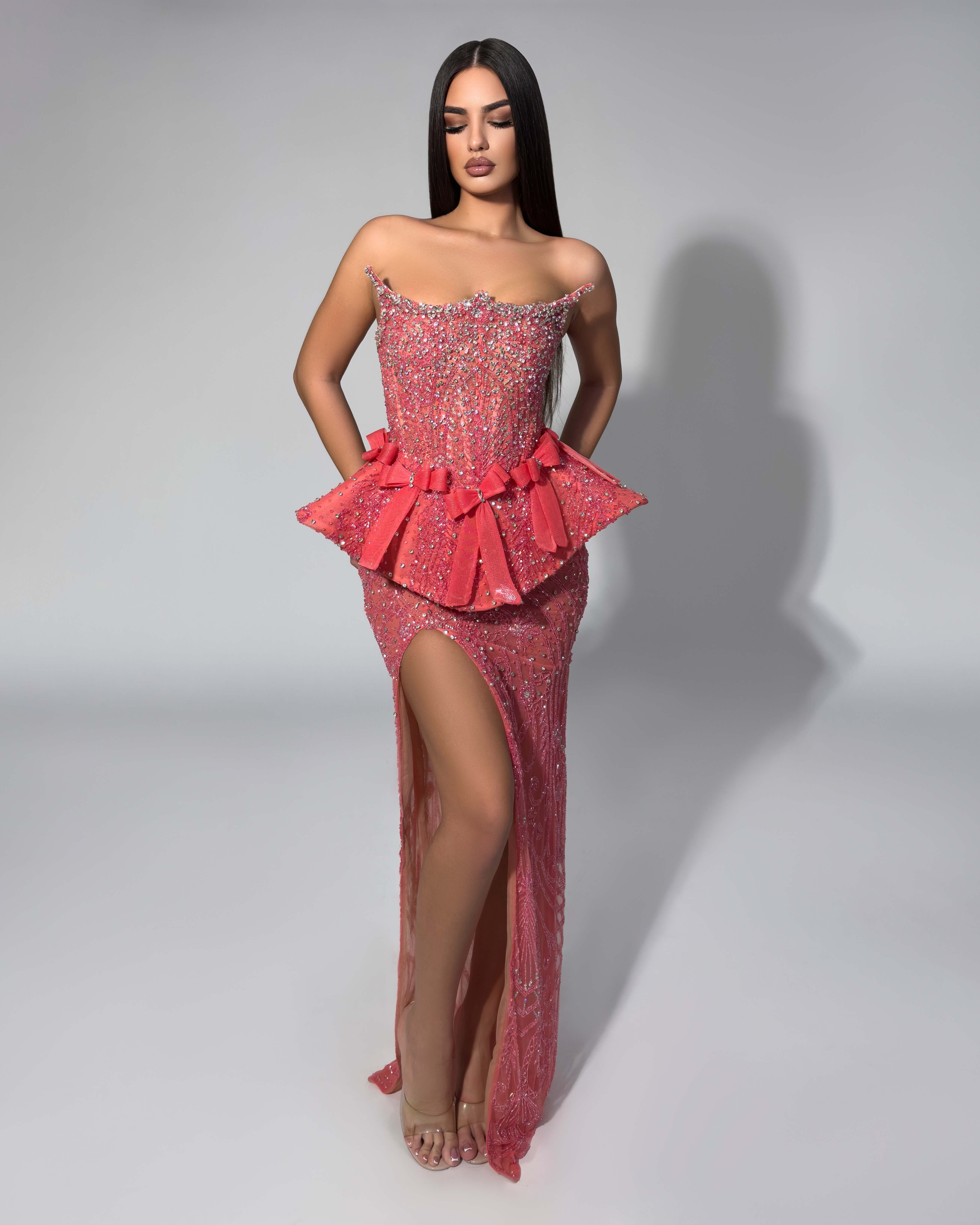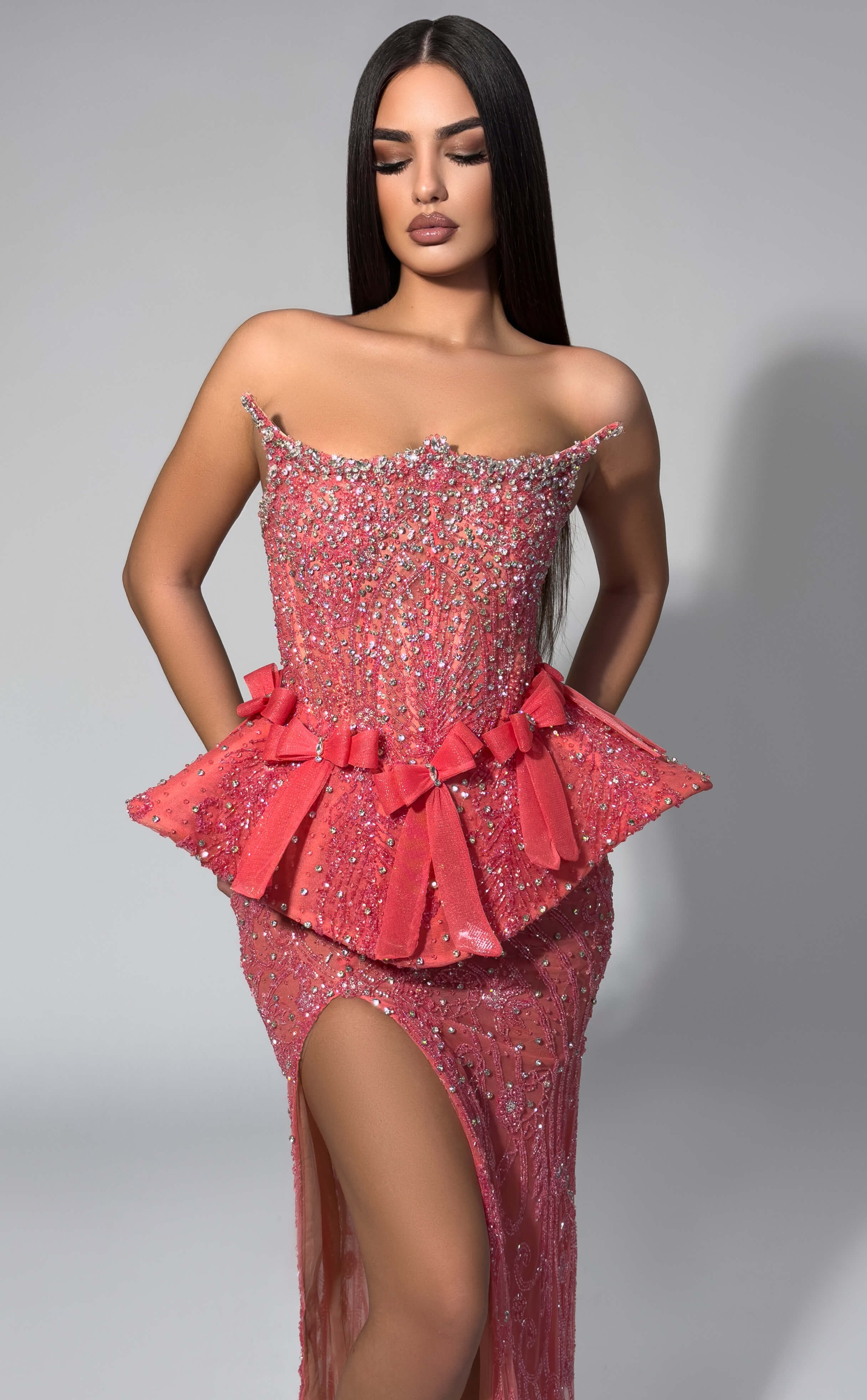 Stand out in this bold coral pink evening gown that masterfully blends structure with glamour. The strapless beaded bodice features shimmering embellishments throughout, while a dramatic sculptural peplum at the waist creates a striking silhouette. A daring high slit adds modern edge to the floor-length skirt. Perfect for fashion-forward events, galas, and occasions where you want to make an unforgettable statement.