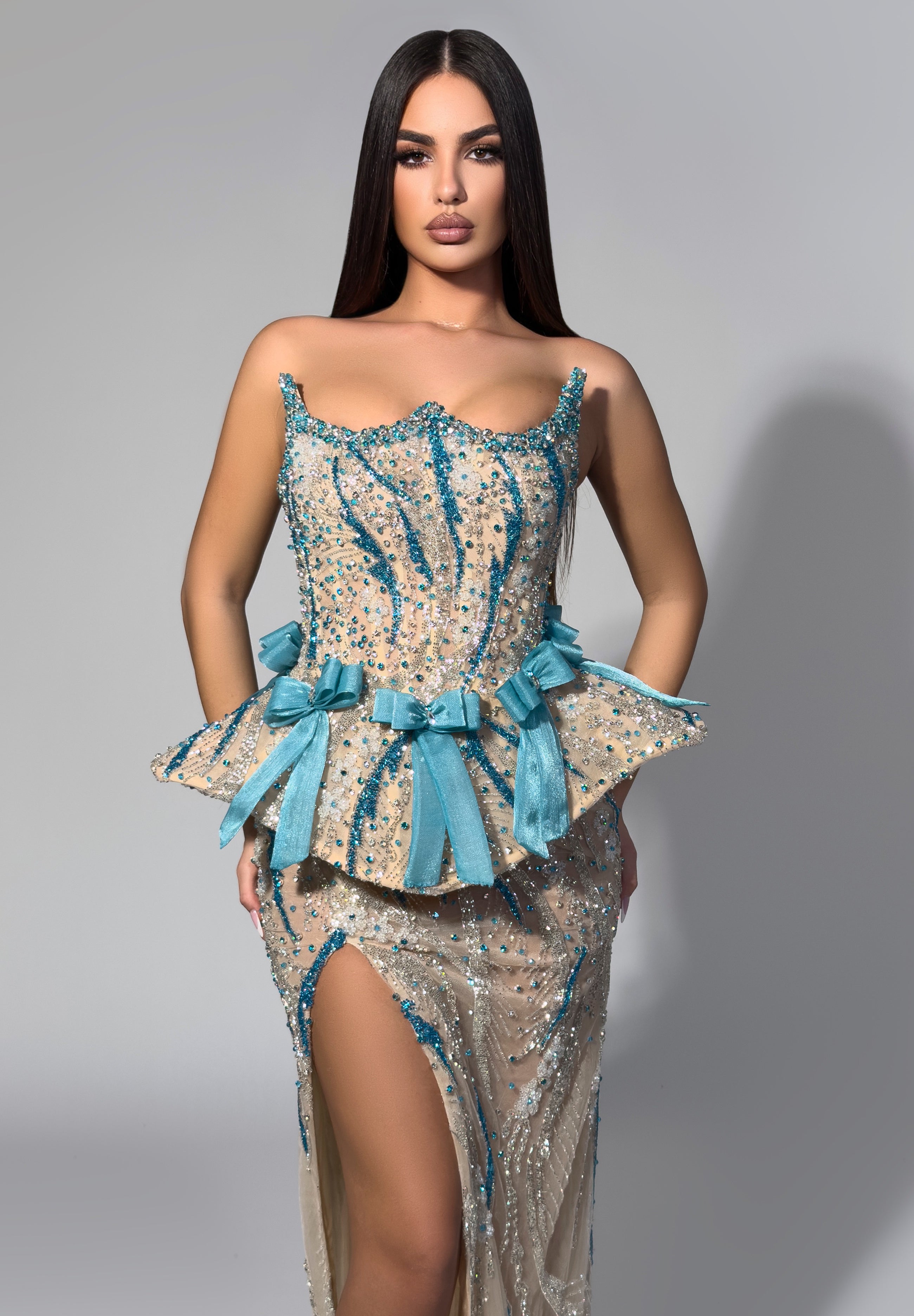 Stand out in this bold aqua evening gown that masterfully blends structure with glamour. The strapless beaded bodice features shimmering embellishments throughout, while a dramatic sculptural peplum at the waist creates a striking silhouette. A daring high slit adds modern edge to the floor-length skirt. Perfect for fashion-forward events, galas, and occasions where you want to make an unforgettable statement.