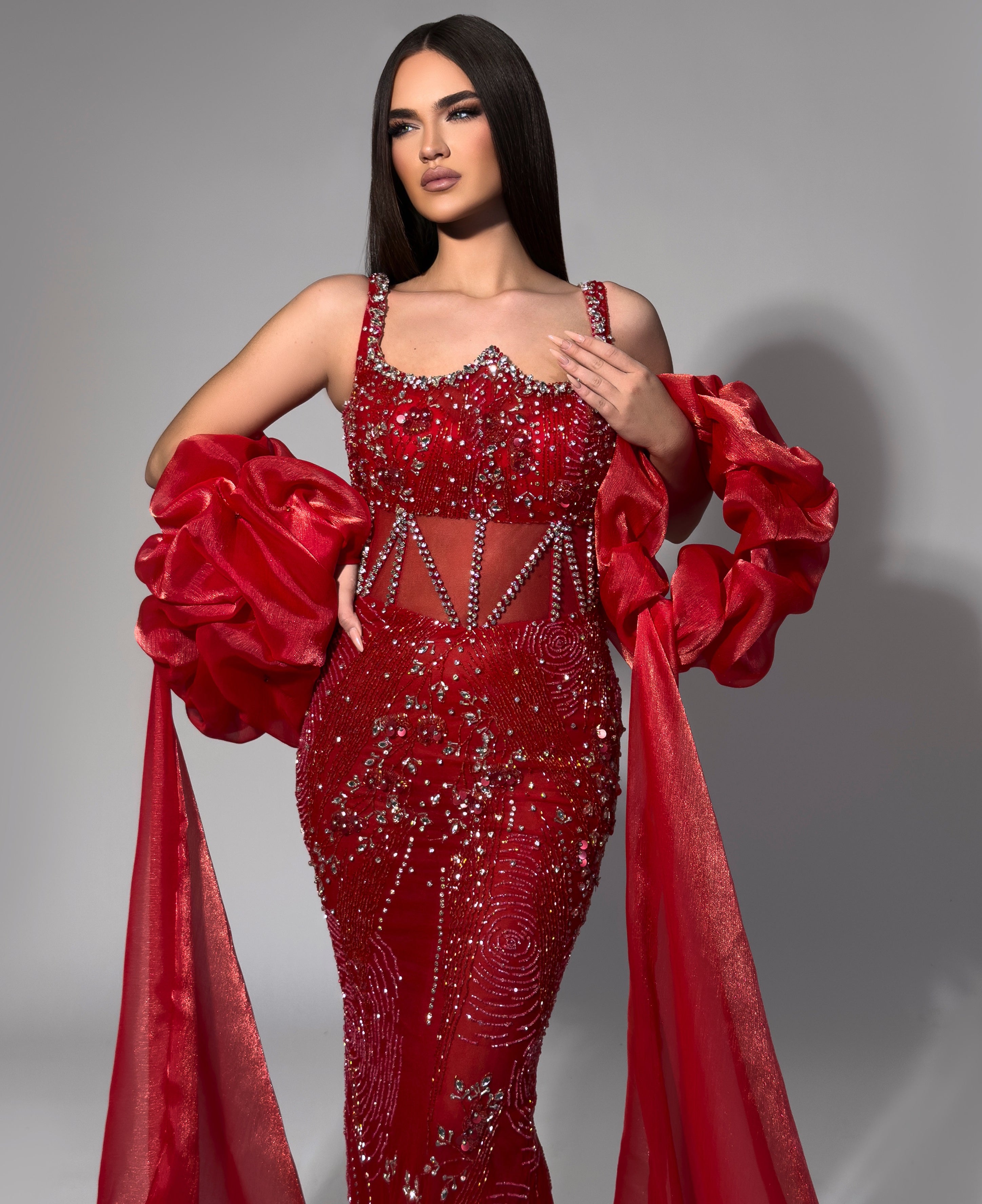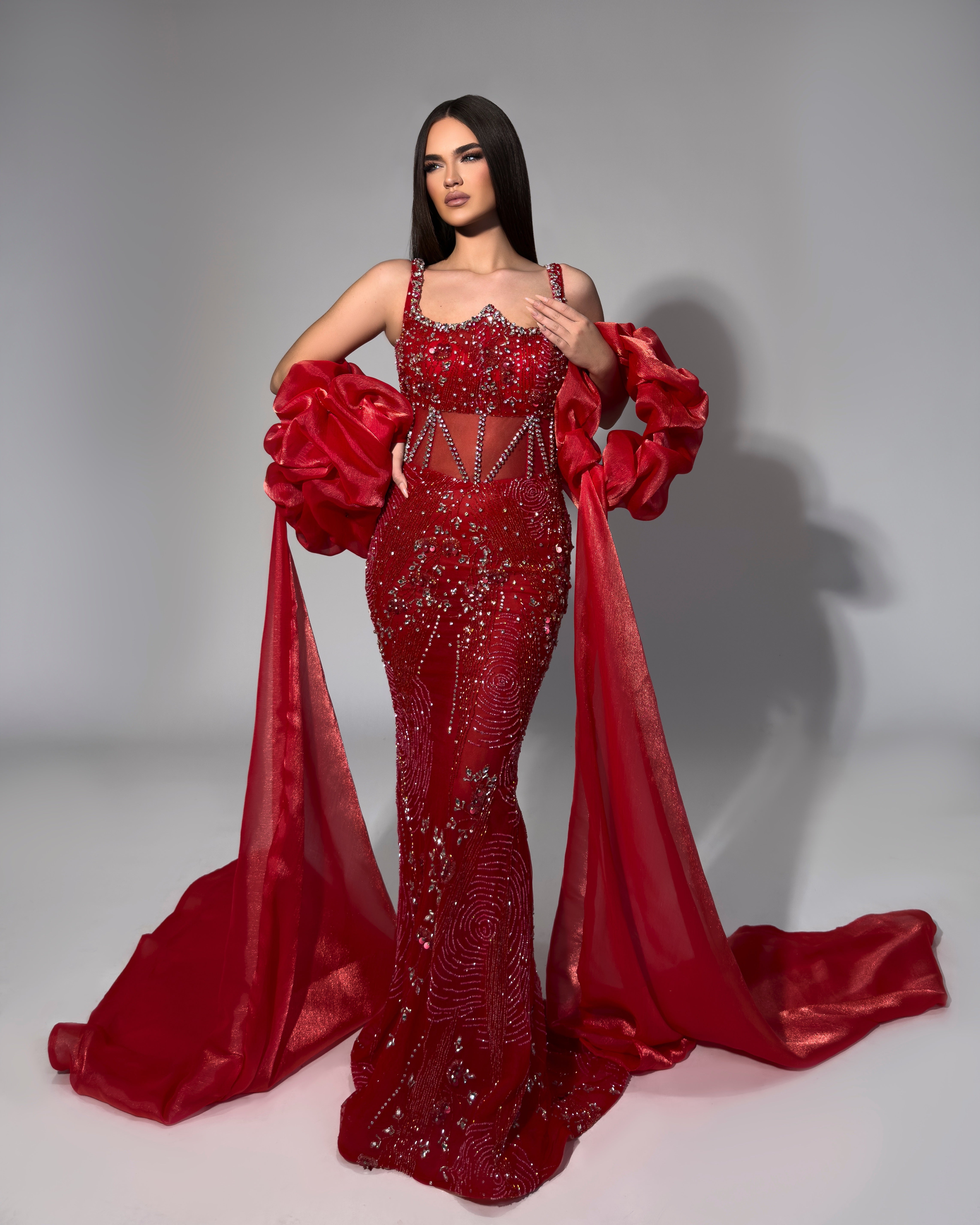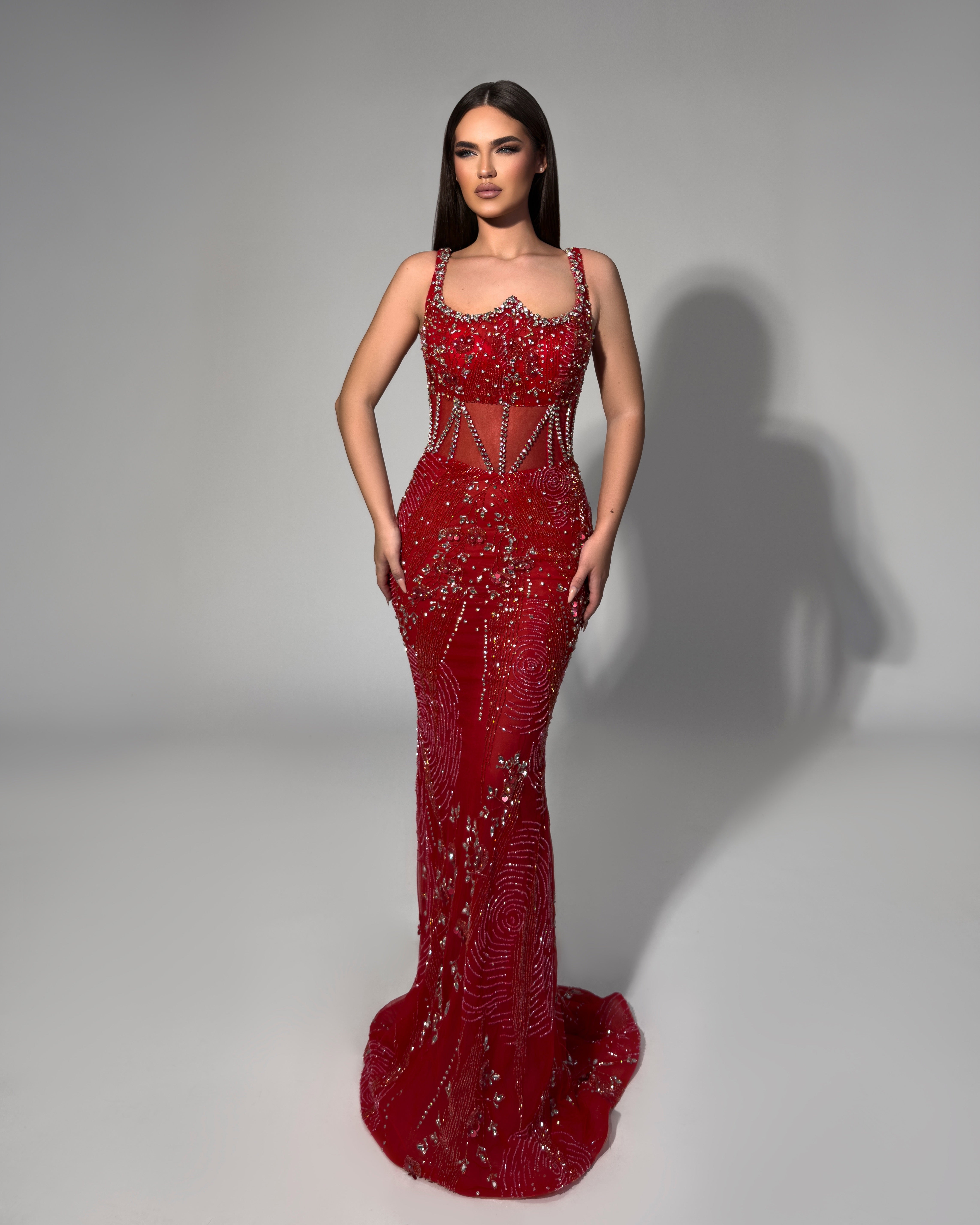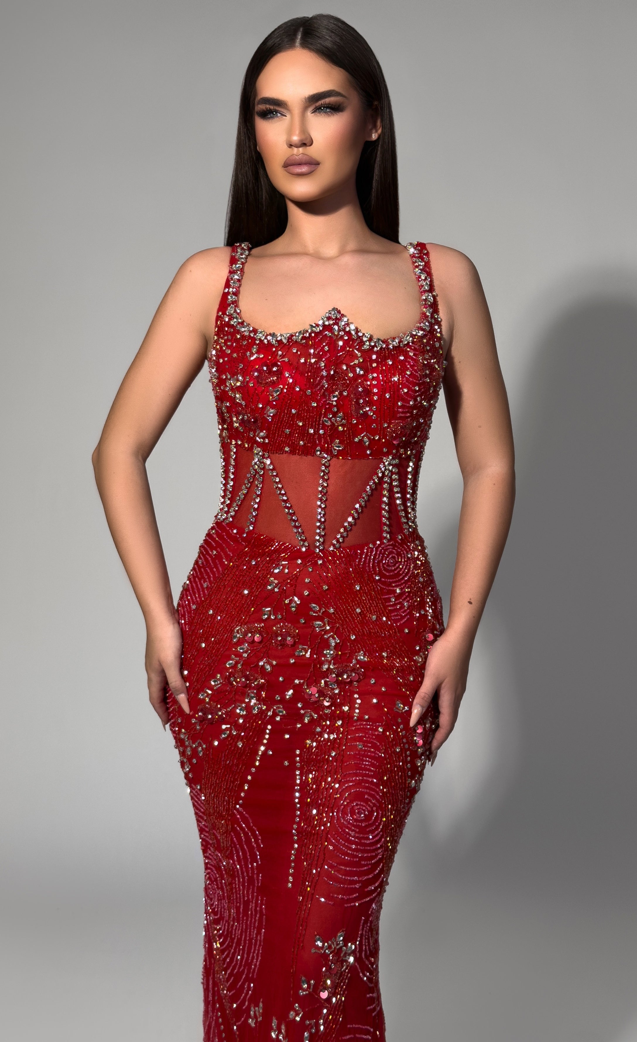 Command the room in this breathtaking crimson gown, meticulously hand-embellished with thousands of shimmering beads and sequins. The figure-hugging silhouette features a sweetheart neckline with jeweled straps, while intricate beadwork creates mesmerizing patterns that catch the light with every movement.