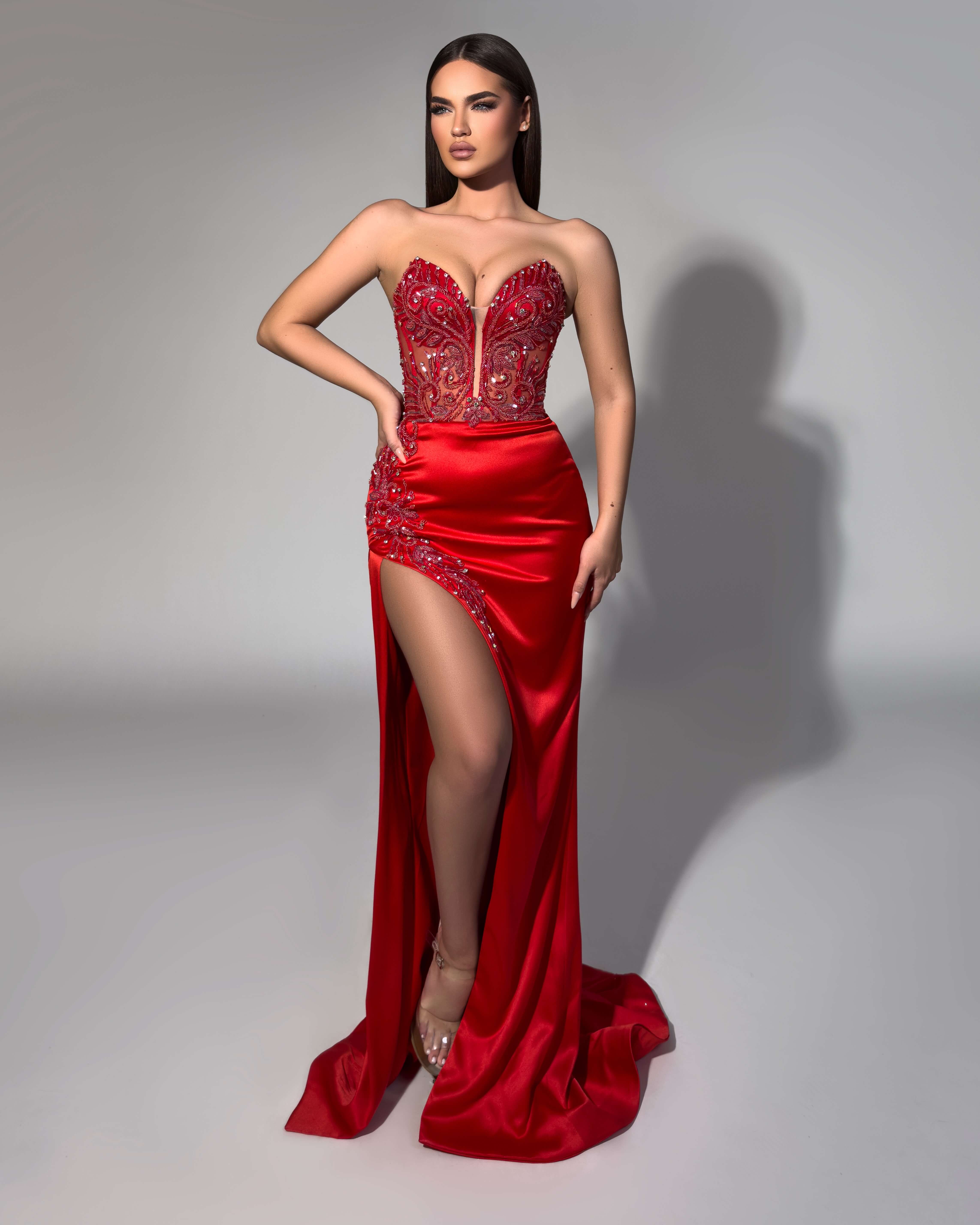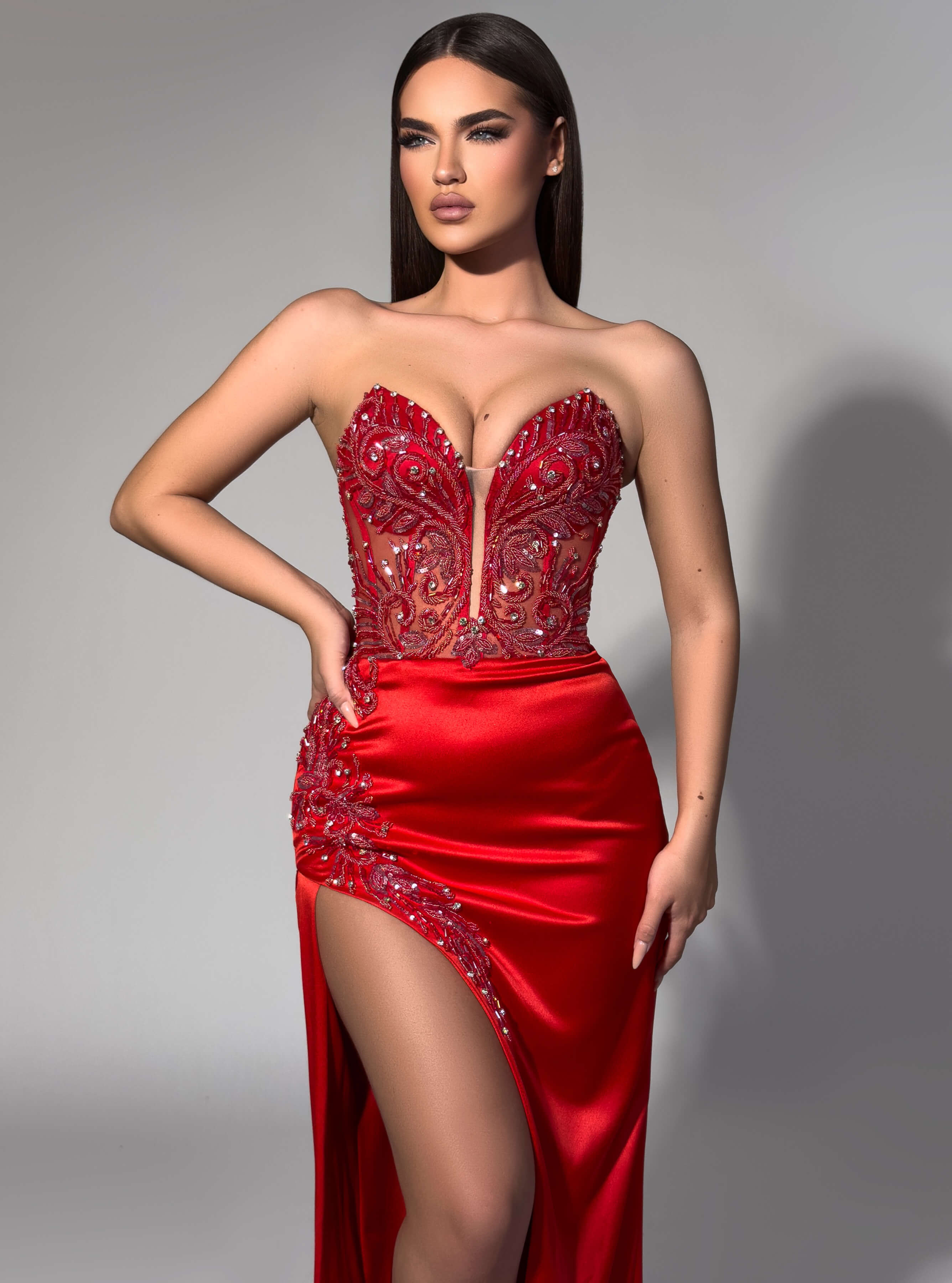 A striking red satin gown featuring an intricately beaded illusion bodice and dramatic thigh-high slit. The luxurious satin skirt flows effortlessly while the hand-embellished corset creates a captivating silhouette for unforgettable evenings.