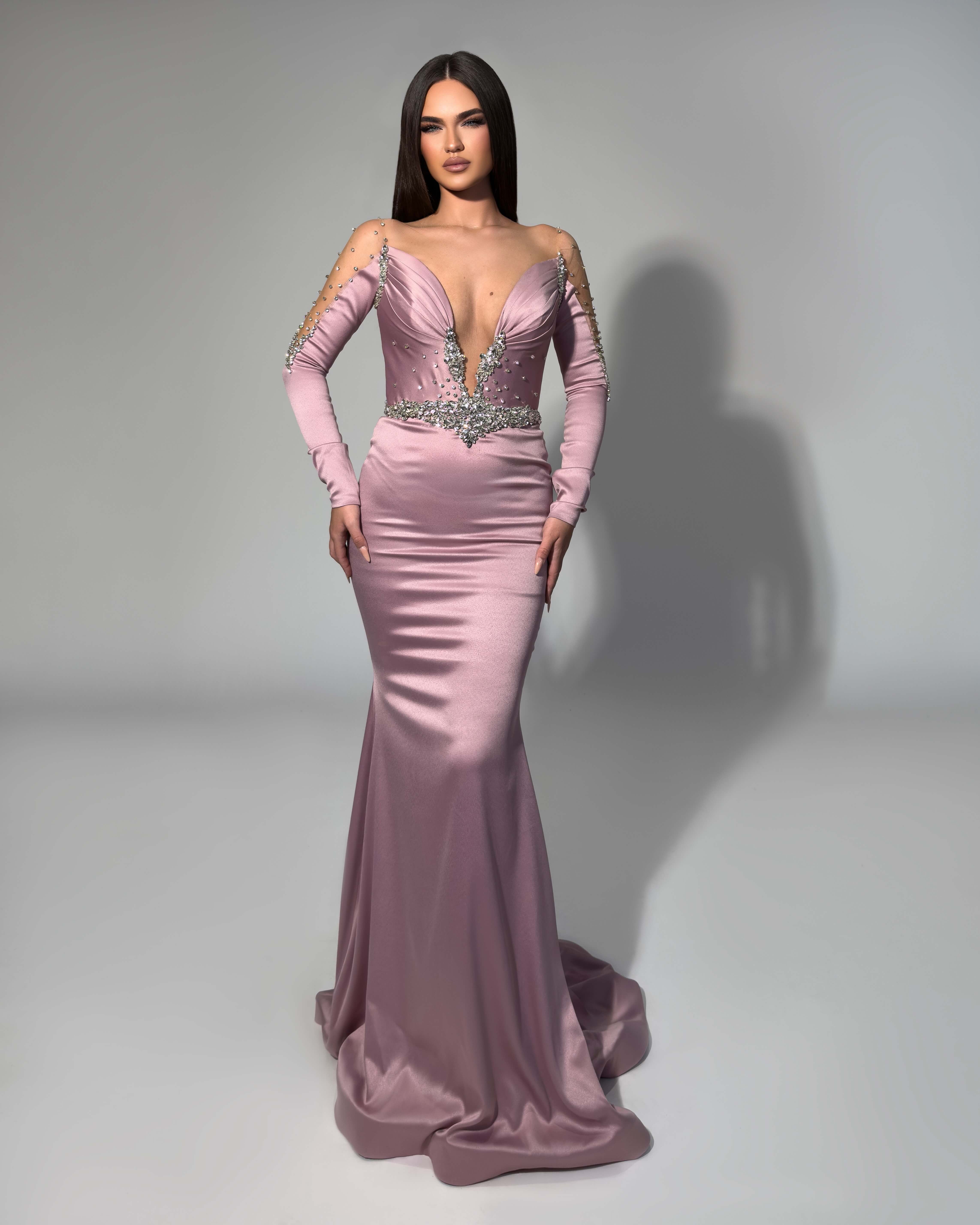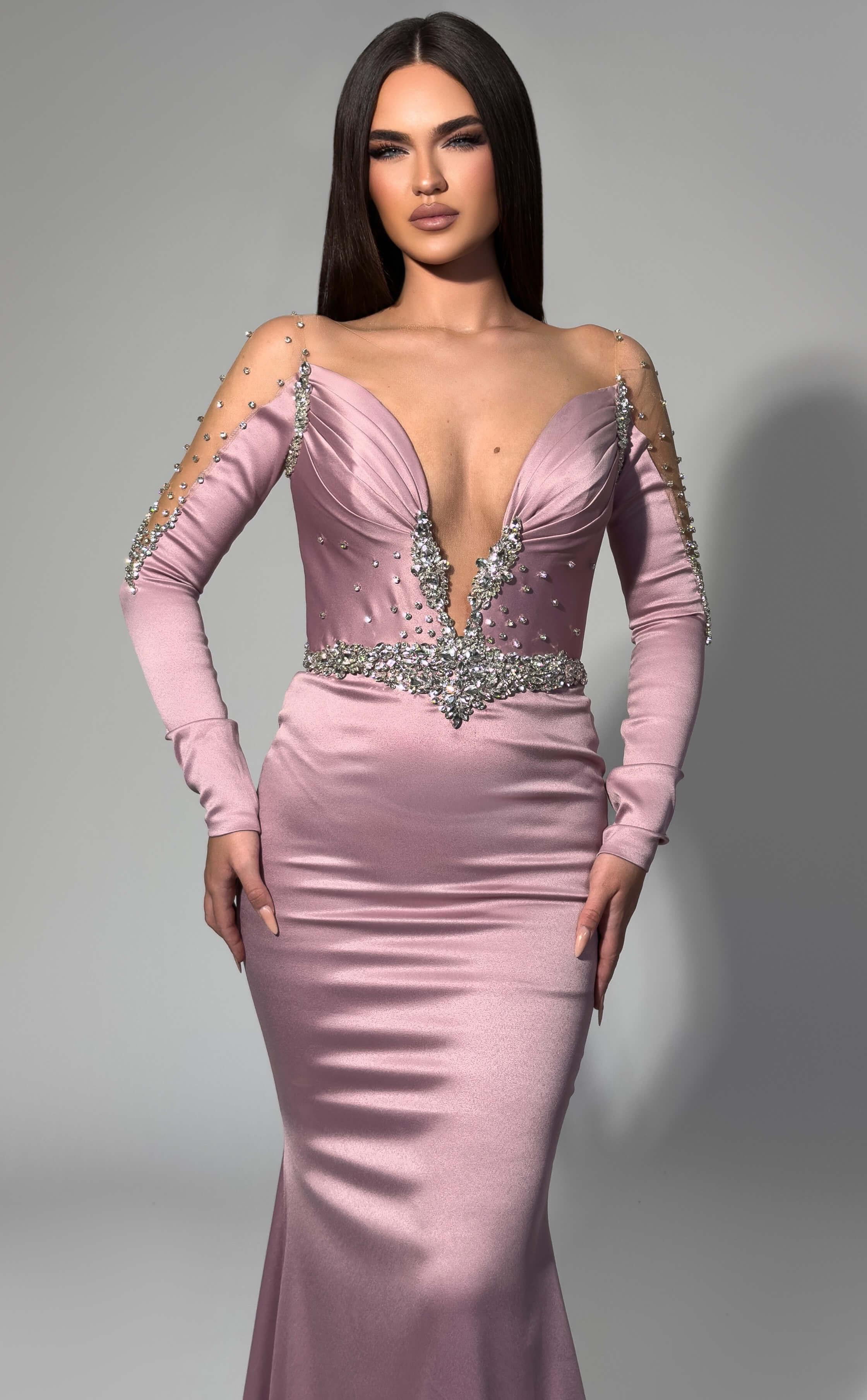Romantic elegance meets daring sophistication in this exquisite dusty rose satin gown, featuring a dramatic plunging neckline adorned with sheer illusion sleeves embellished with delicate beadwork. The luxurious satin bodice is beautifully draped and cinched at the waist with an ornate jeweled belt that creates a stunning focal point.