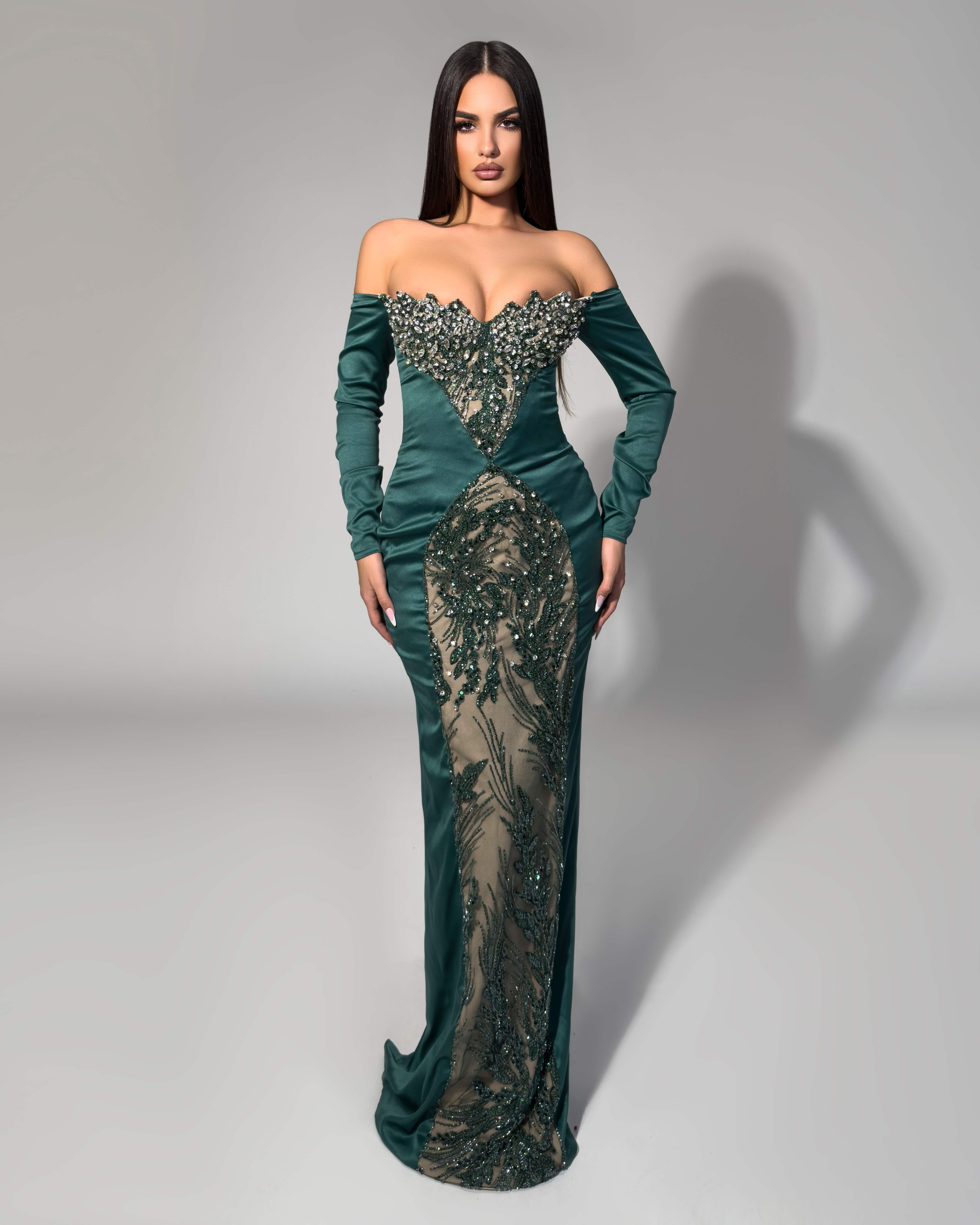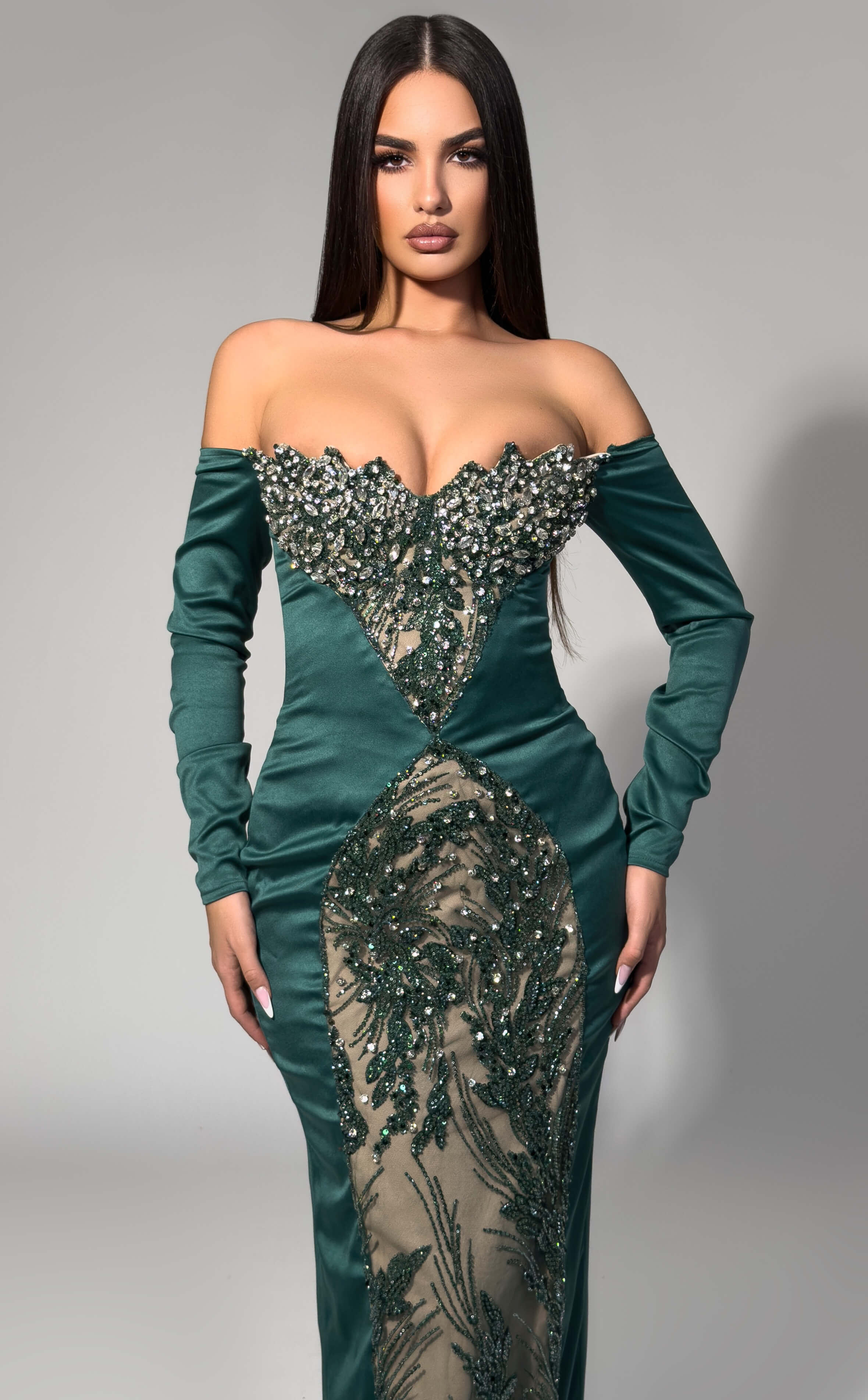 Exude regal elegance in this luxurious forest green gown, featuring a stunning off-shoulder design with long sleeves in rich satin. The sweetheart bodice is adorned with an opulent cascade of crystal and bead embellishments that create an intricate jeweled effect, while sheer beaded panels at the waist and skirt add an alluring touch of drama.
