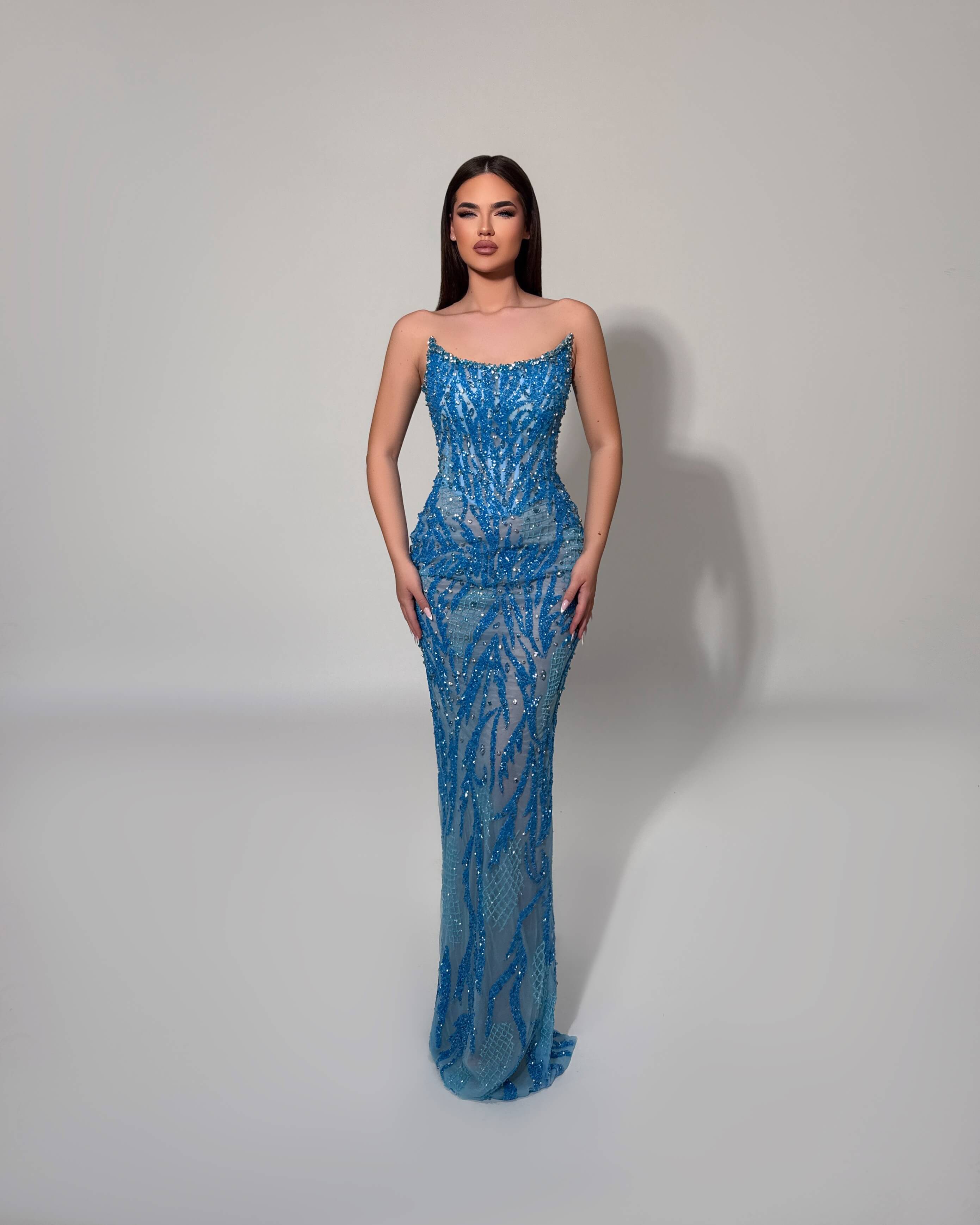 • Figure-hugging floor-length design in gradient ocean blue, perfect for beach weddings and seaside galas