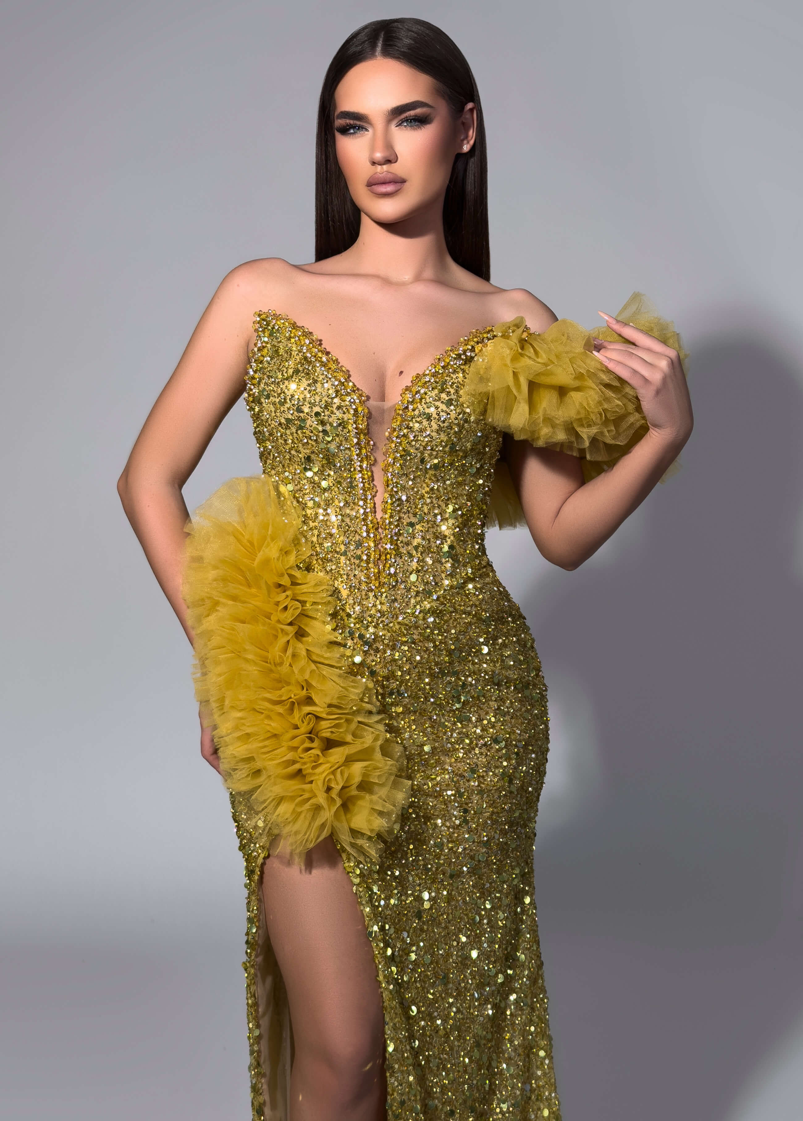 A show-stopping gold sequin gown with dramatic feather detailing and a daring thigh-high slit. Fully beaded bodice with plunging neckline creates an unforgettable silhouette for your most important evenings.