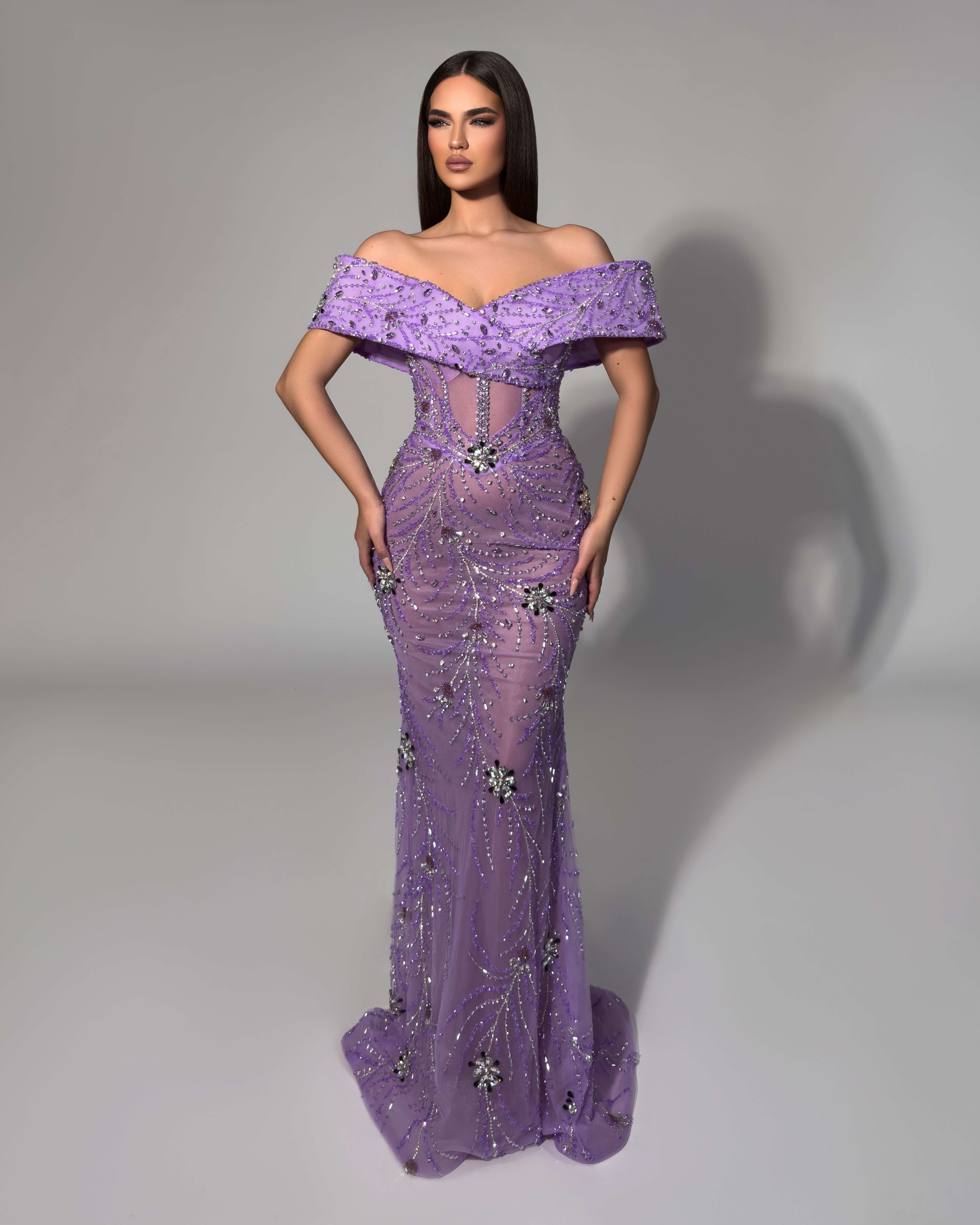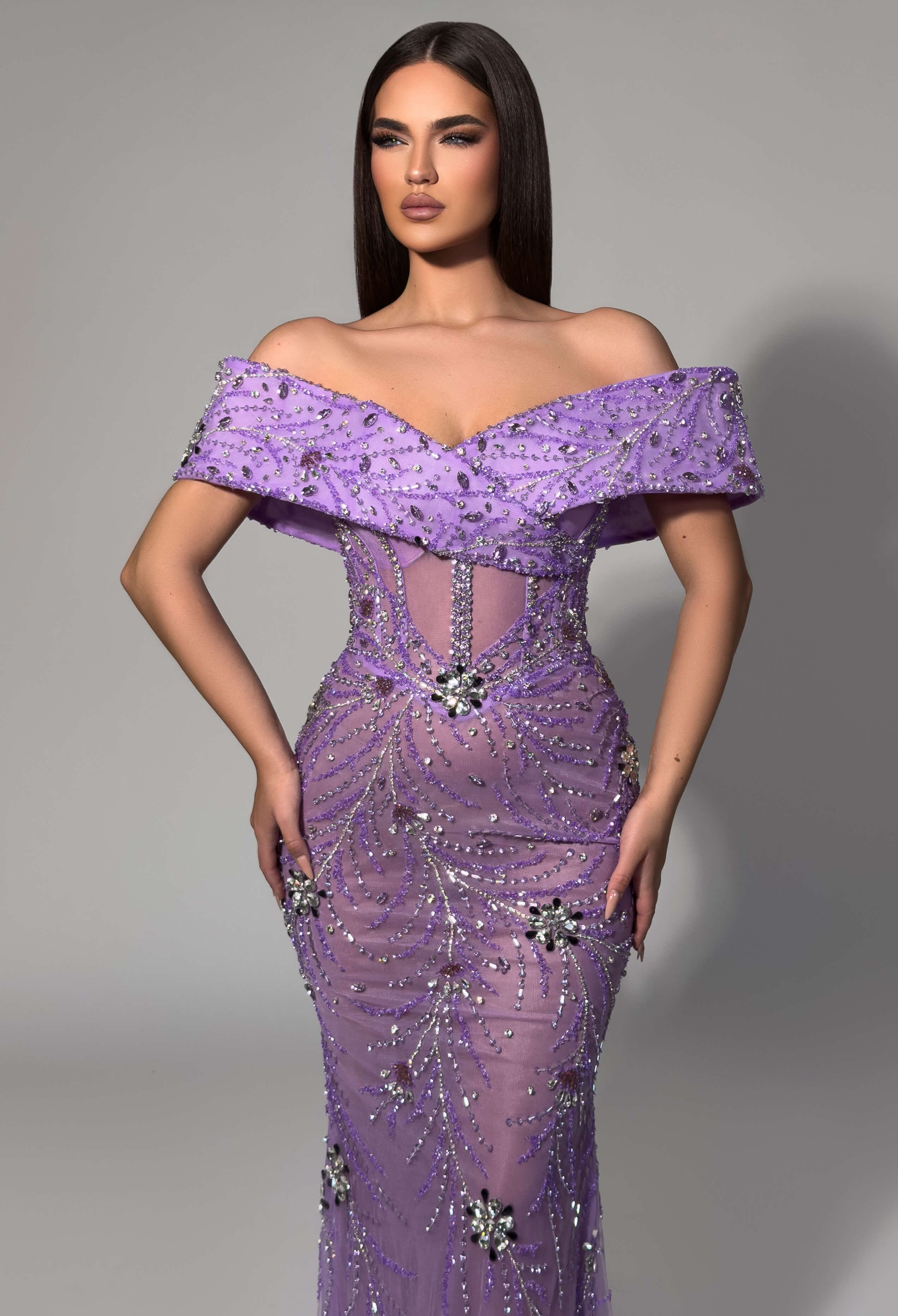 Make an unforgettable entrance in this exquisite lavender evening gown. Featuring a romantic off-shoulder neckline with beaded cap sleeves, this show-stopping piece showcases intricate hand-beaded embellishments and shimmering sequins cascading down the fitted silhouette.
