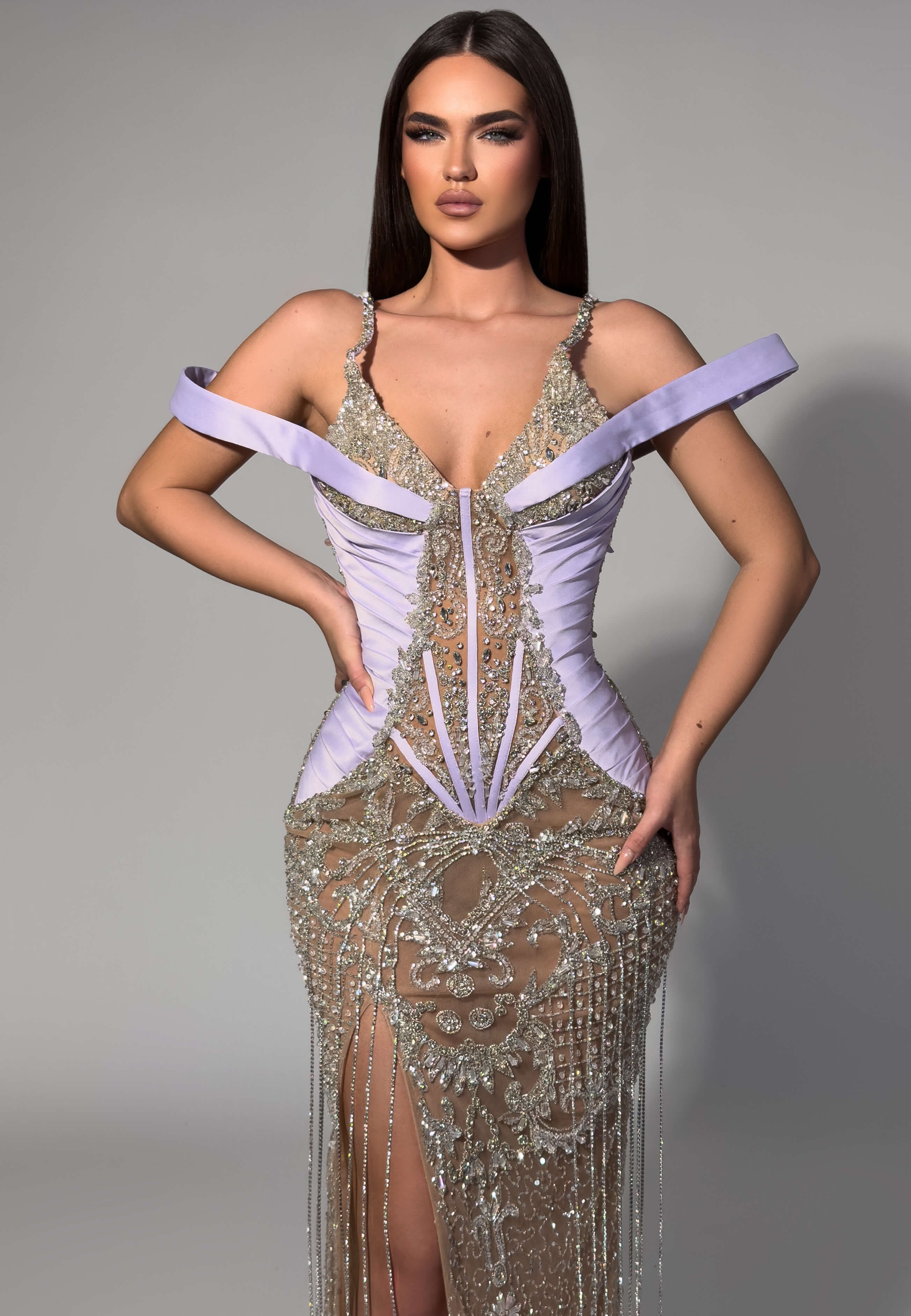 Captivate in this ethereal lavender gown featuring a structured off-shoulder corset bodice and a sheer gold-beaded skirt with cascading fringe details. The striking contrast of soft satin and intricate embellishments creates a show-stopping look for the most prestigious galas and red-carpet moments.
