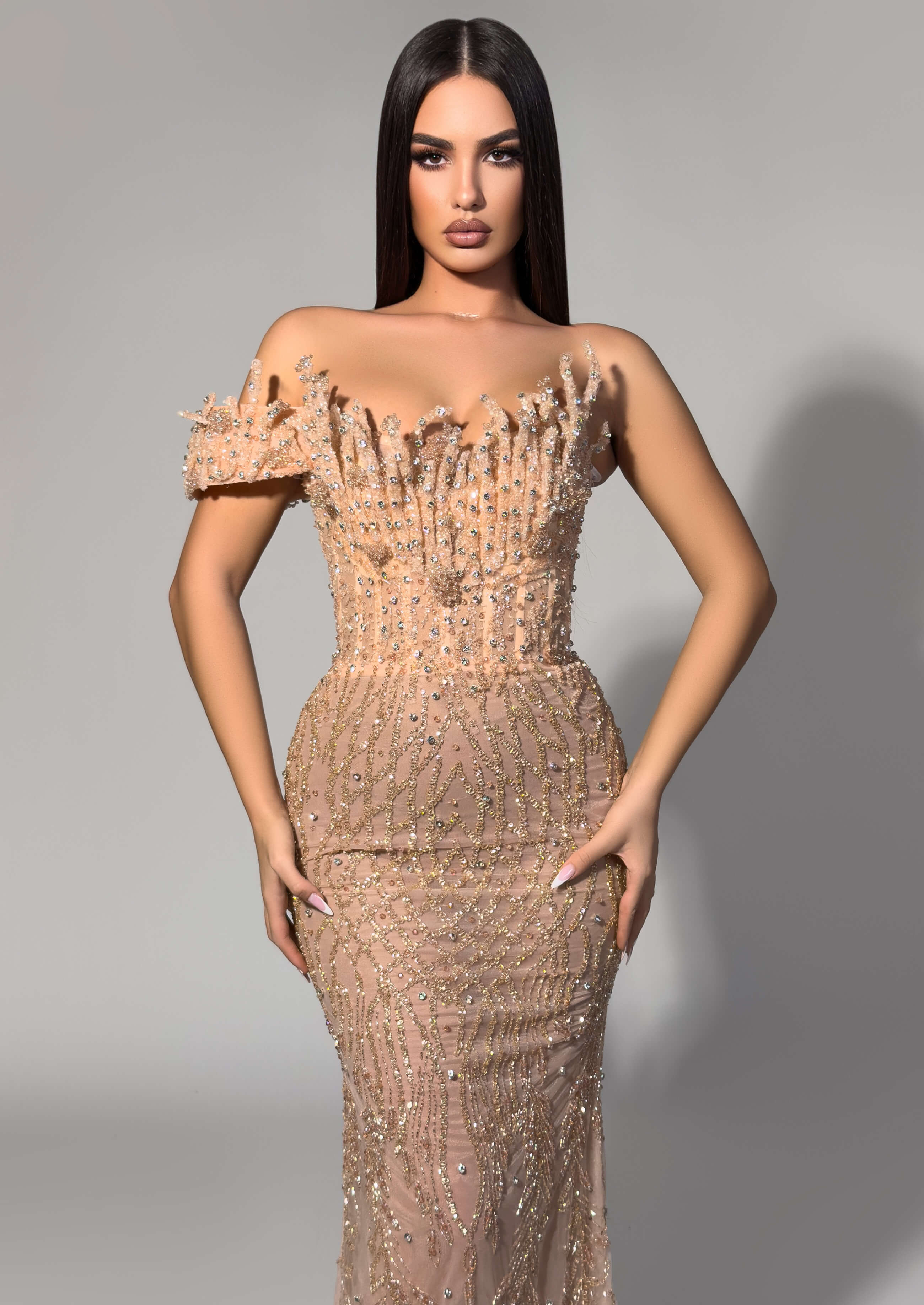 Embody ethereal elegance in this breathtaking nude gown that captures the essence of couture artistry. Meticulously hand-beaded with intricate crystal patterns, this masterpiece features a dramatic feather-adorned neckline that creates a stunning crown effect. The illusion bodice and figure-hugging silhouette are enhanced with shimmering embellishments that catch the light from every angle, while the flowing train adds regal sophistication.