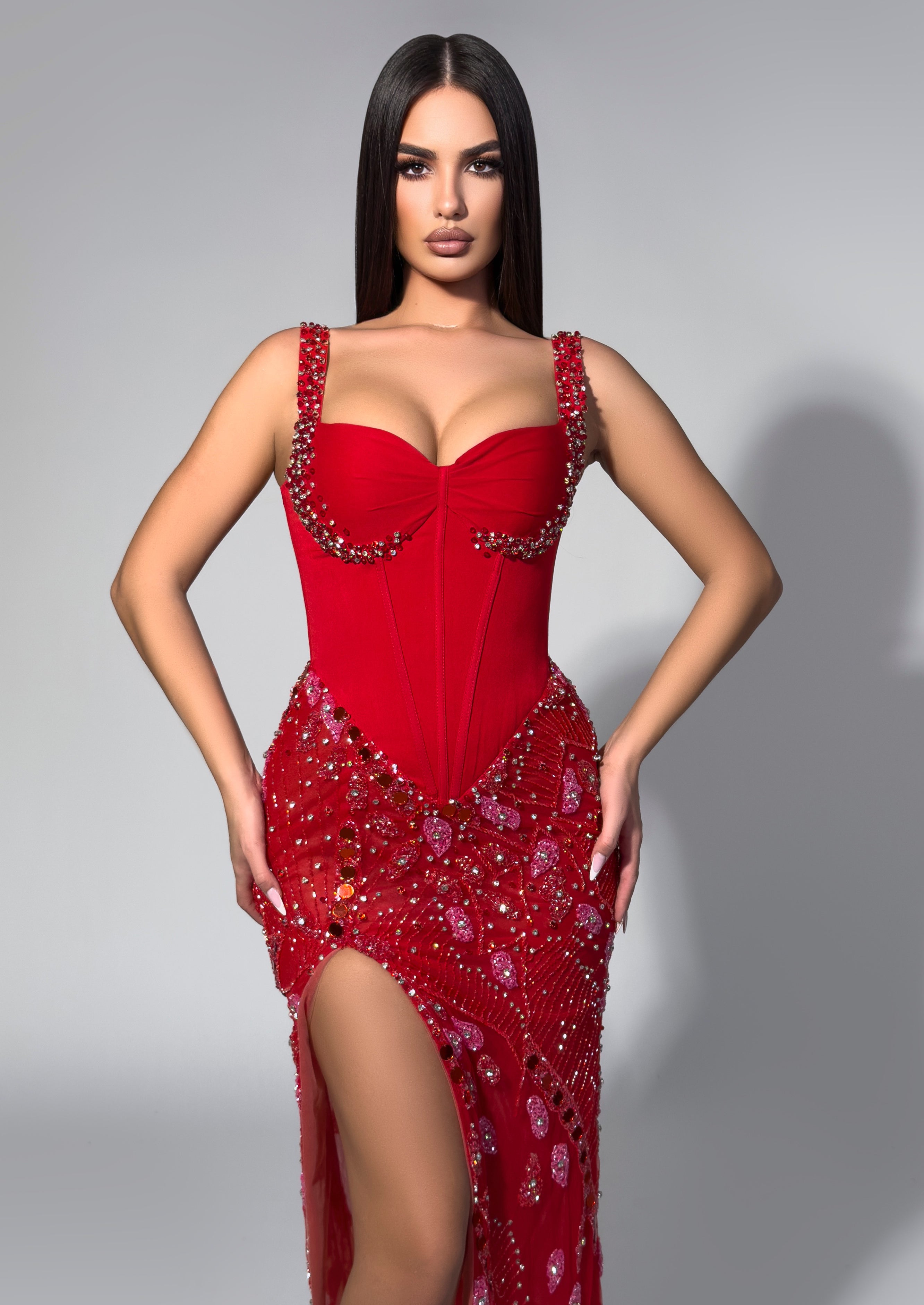 Exude elegance in this romantic red gown featuring a structured corset bodice and cascading crystal embellishments. The figure-flattering silhouette with jeweled straps and thigh-high slit creates a sophisticated, ethereal look for any formal occasion.