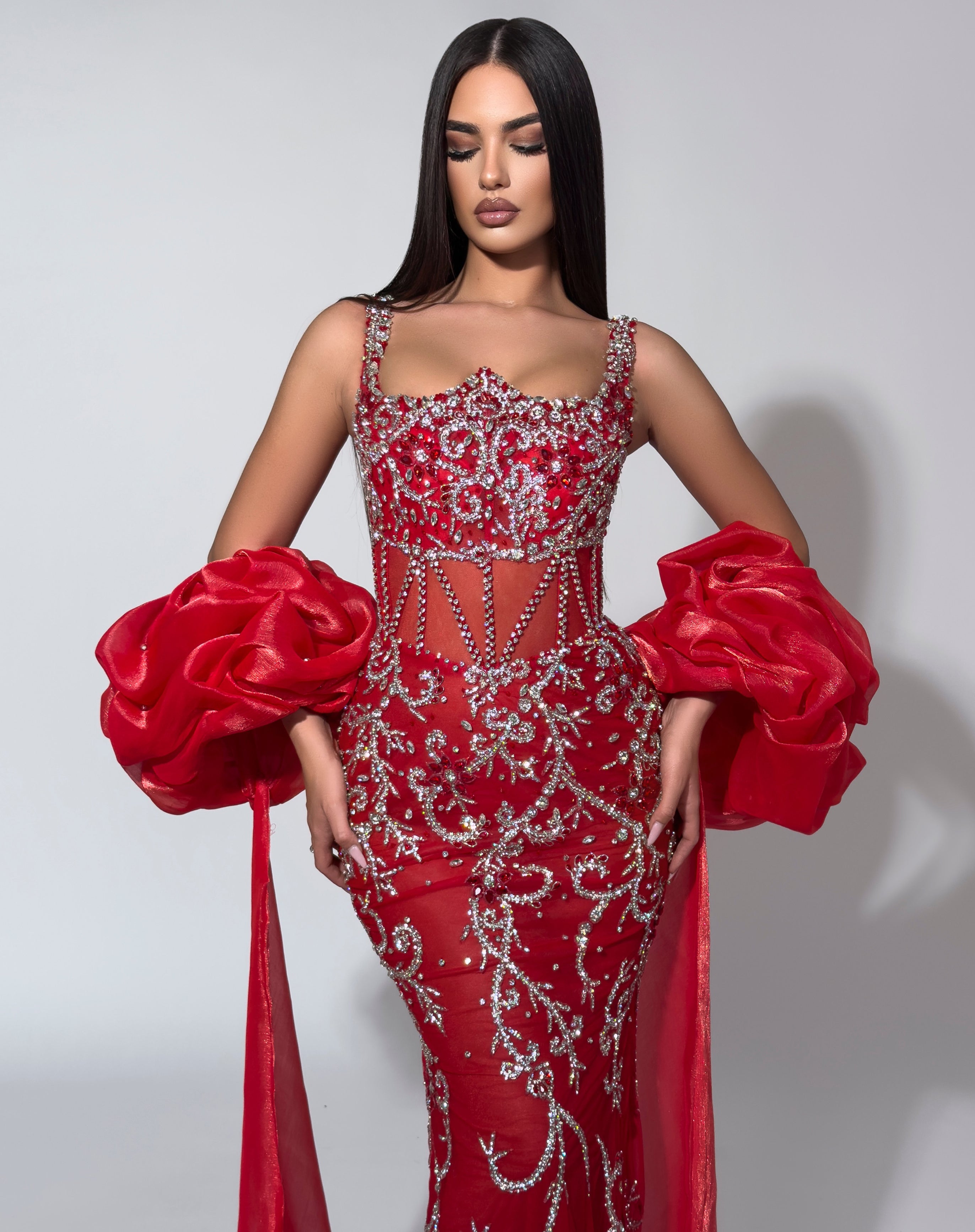 A breathtaking gown in vibrant red, featuring an illusion bodice with intricate silver crystal beading in ornate patterns and a sweetheart neckline. The figure-hugging silhouette is complemented by dramatic detachable organza puff sleeves and a sweeping train, creating the ultimate couture statement. Perfect for galas, award ceremonies, and unforgettable red-carpet moments.