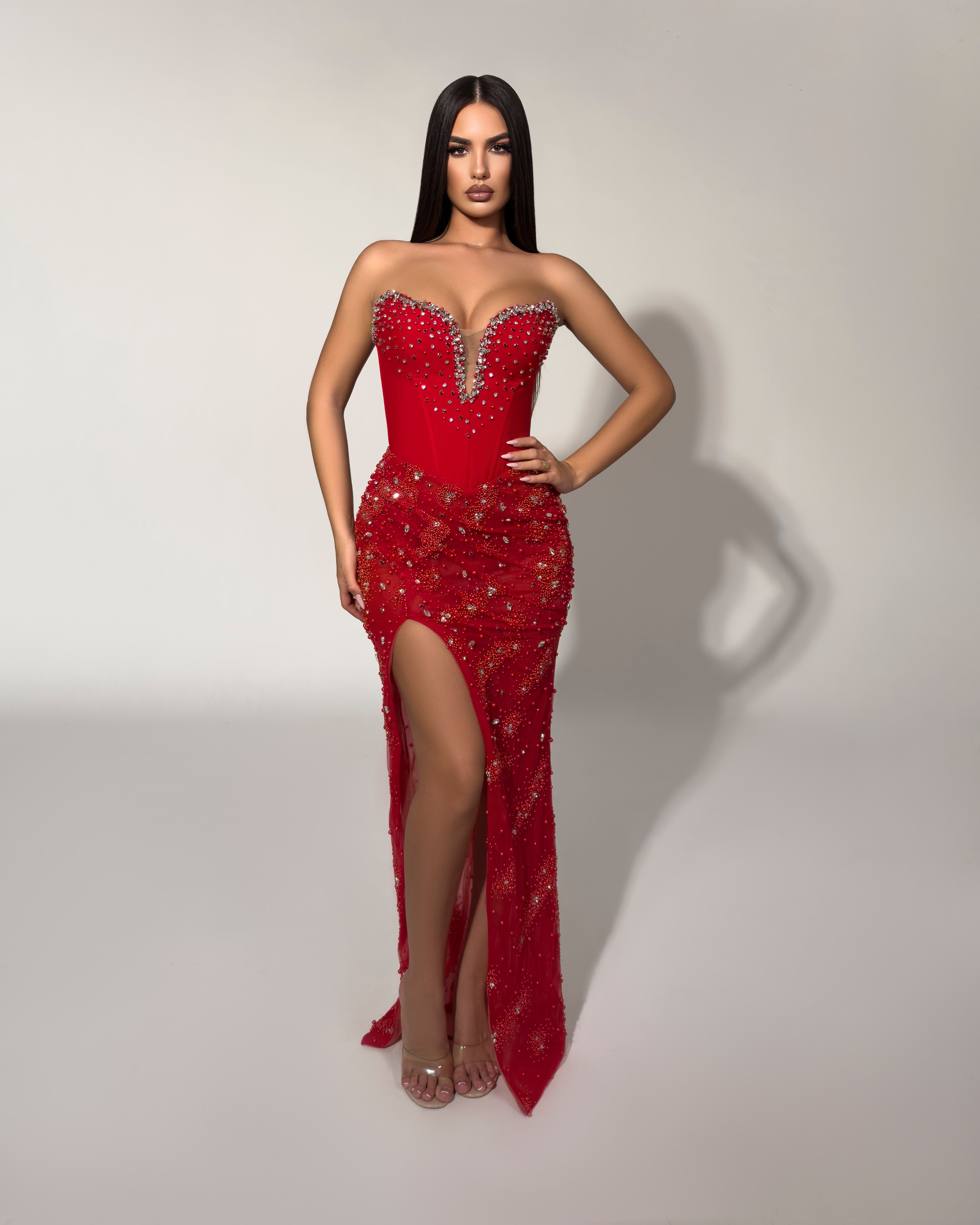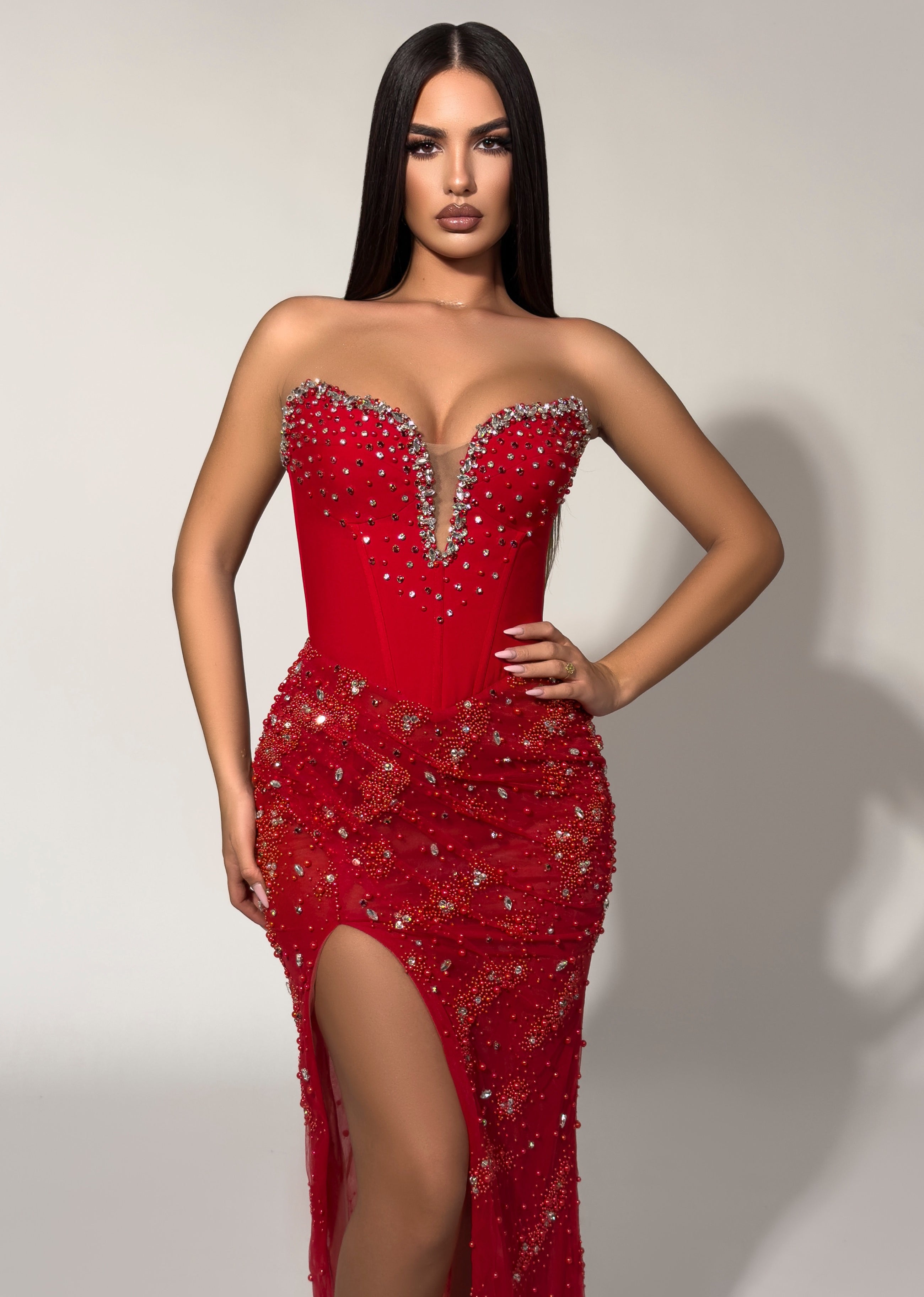A captivating strapless gown in rich ruby red, featuring a crystal-embellished sweetheart neckline with illusion detailing and intricate beaded appliqués throughout. The figure-hugging silhouette is enhanced by a dramatic thigh-high slit, creating a bold and glamorous look perfect for galas and red-carpet moments.