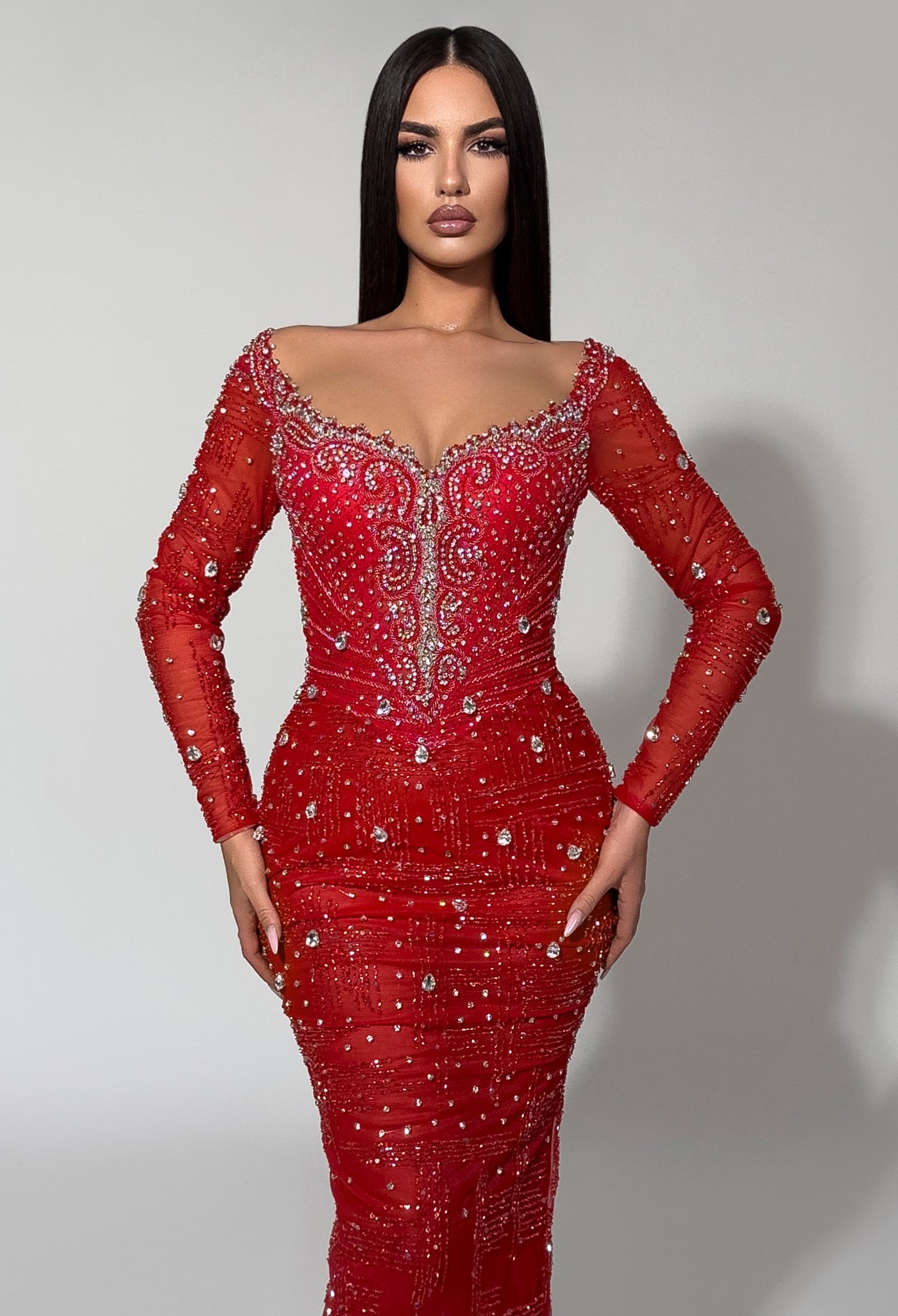 A stunning long-sleeve gown in vibrant red, featuring an all-over crystal and sequin embellishment that creates mesmerizing sparkle. The illusion bodice with a plunging neckline and sheer beaded sleeves adds allure, while the figure-hugging silhouette ensures a red-carpet-ready look for galas and prestigious events.