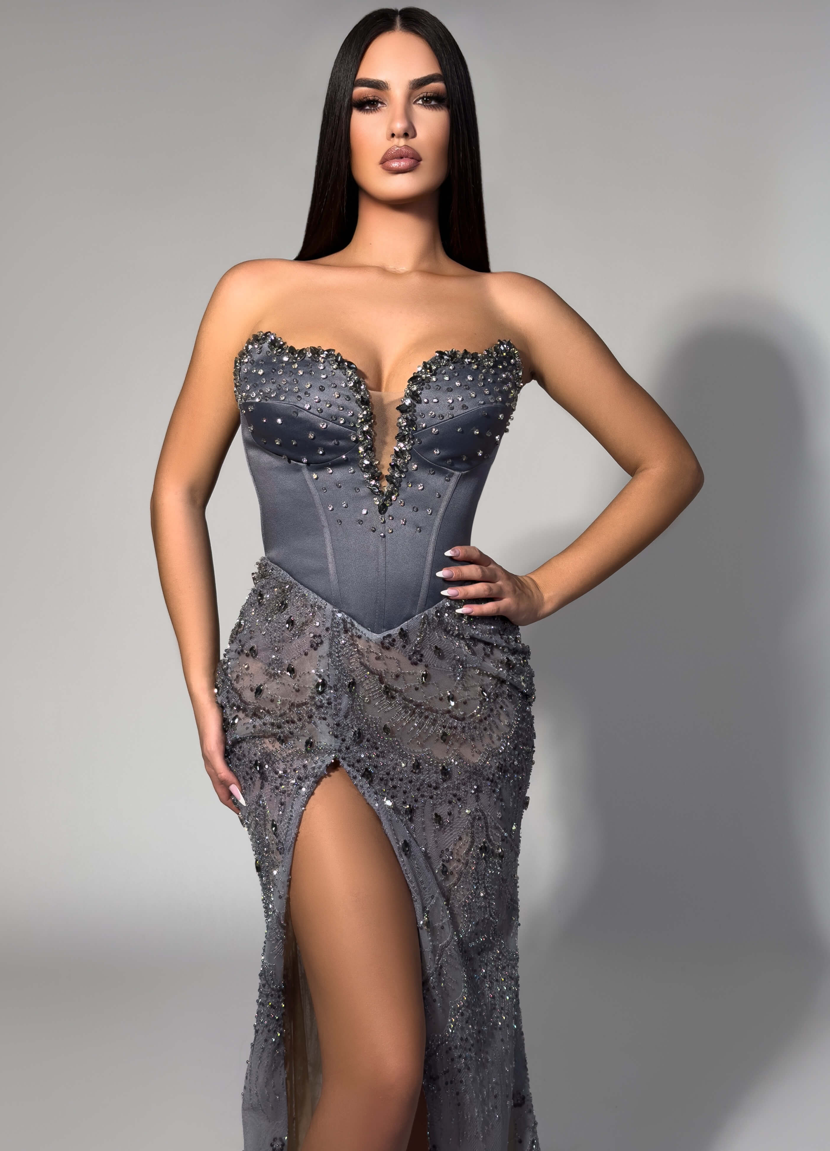 Each bead is meticulously hand-applied to create dimension and movement, ensuring you shimmer from every angle. The daring thigh-high slit adds modern edge to this sophisticated silhouette. Perfect for award ceremonies, high-profile galas, and moments when only the most extraordinary will do.