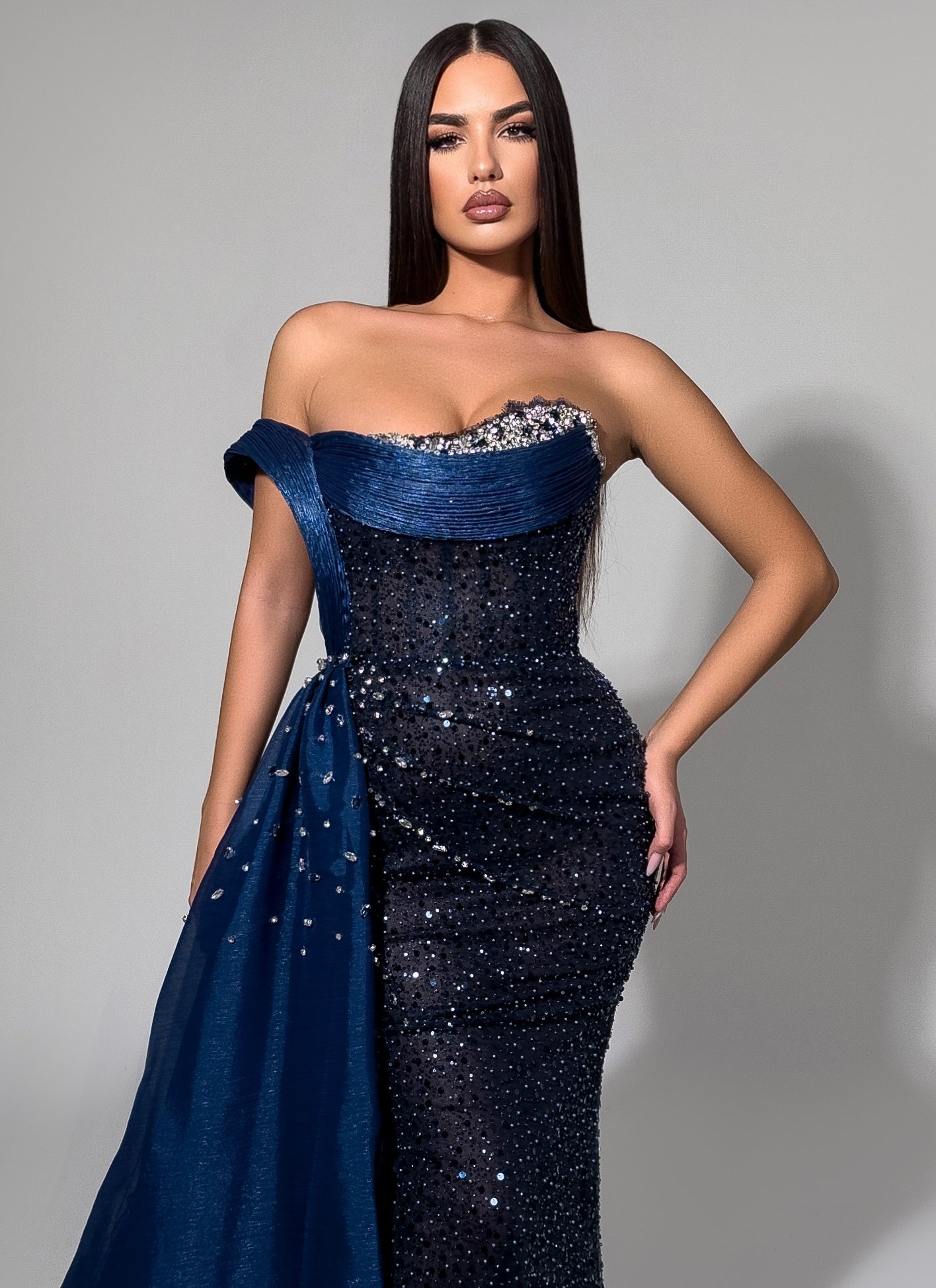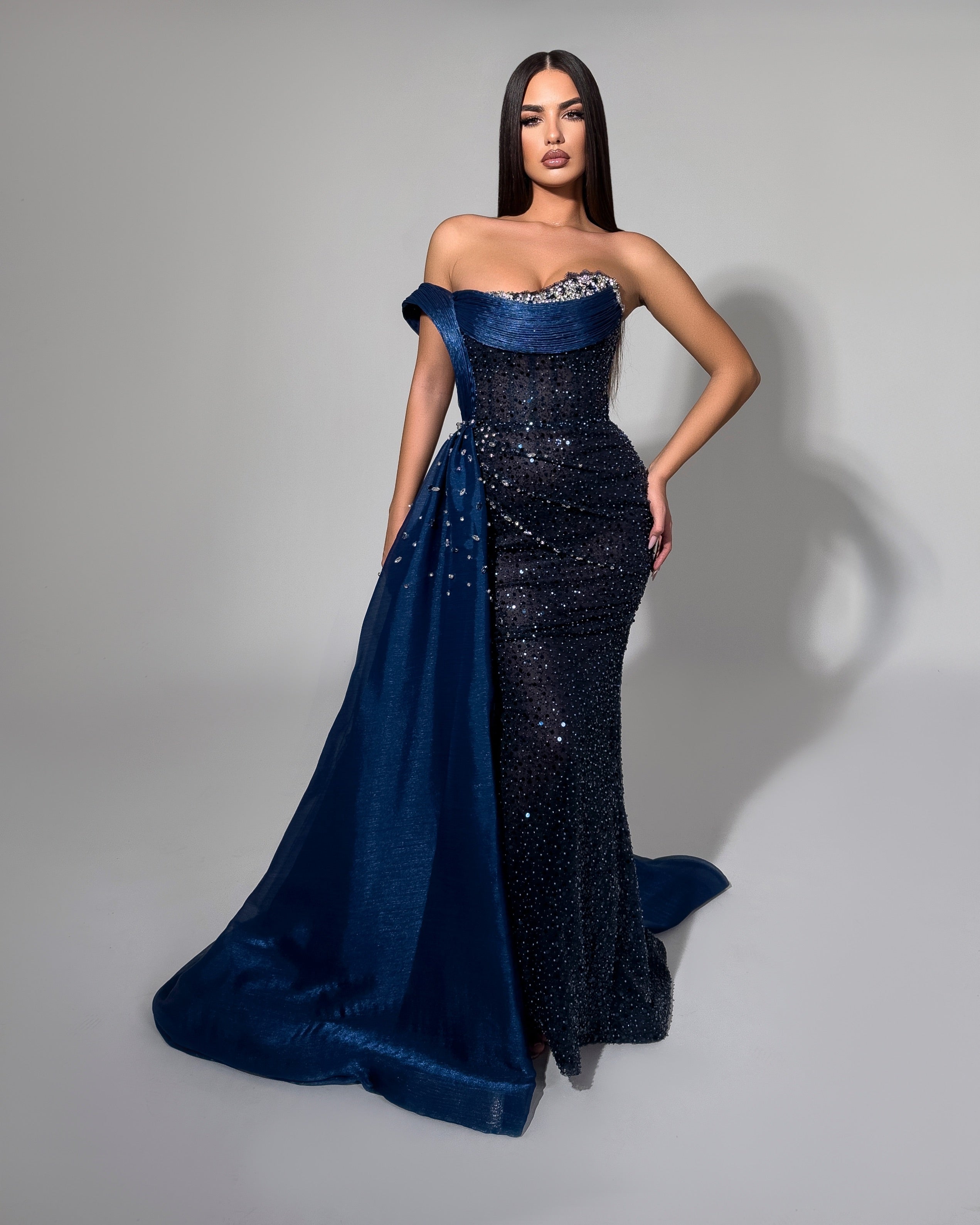 A striking strapless gown featuring a black sequined column silhouette with a dramatic navy blue overskirt adorned with scattered crystal embellishments. The crystal-trimmed sweetheart neckline and detachable train create versatile styling options, perfect for making a grand entrance at galas and black-tie events.