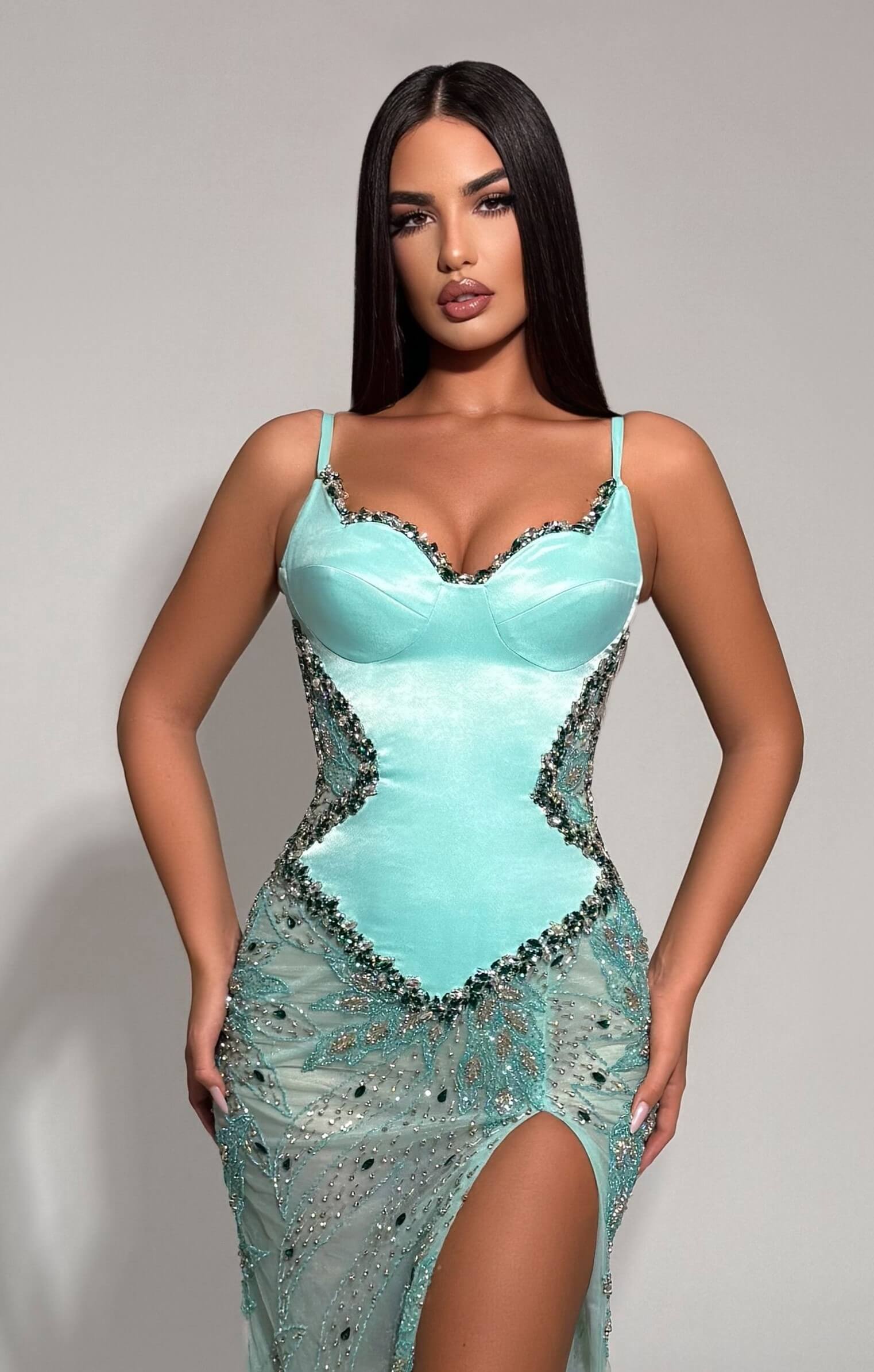 Sheer beaded skirt with a daring slit adds sophistication and allure.
