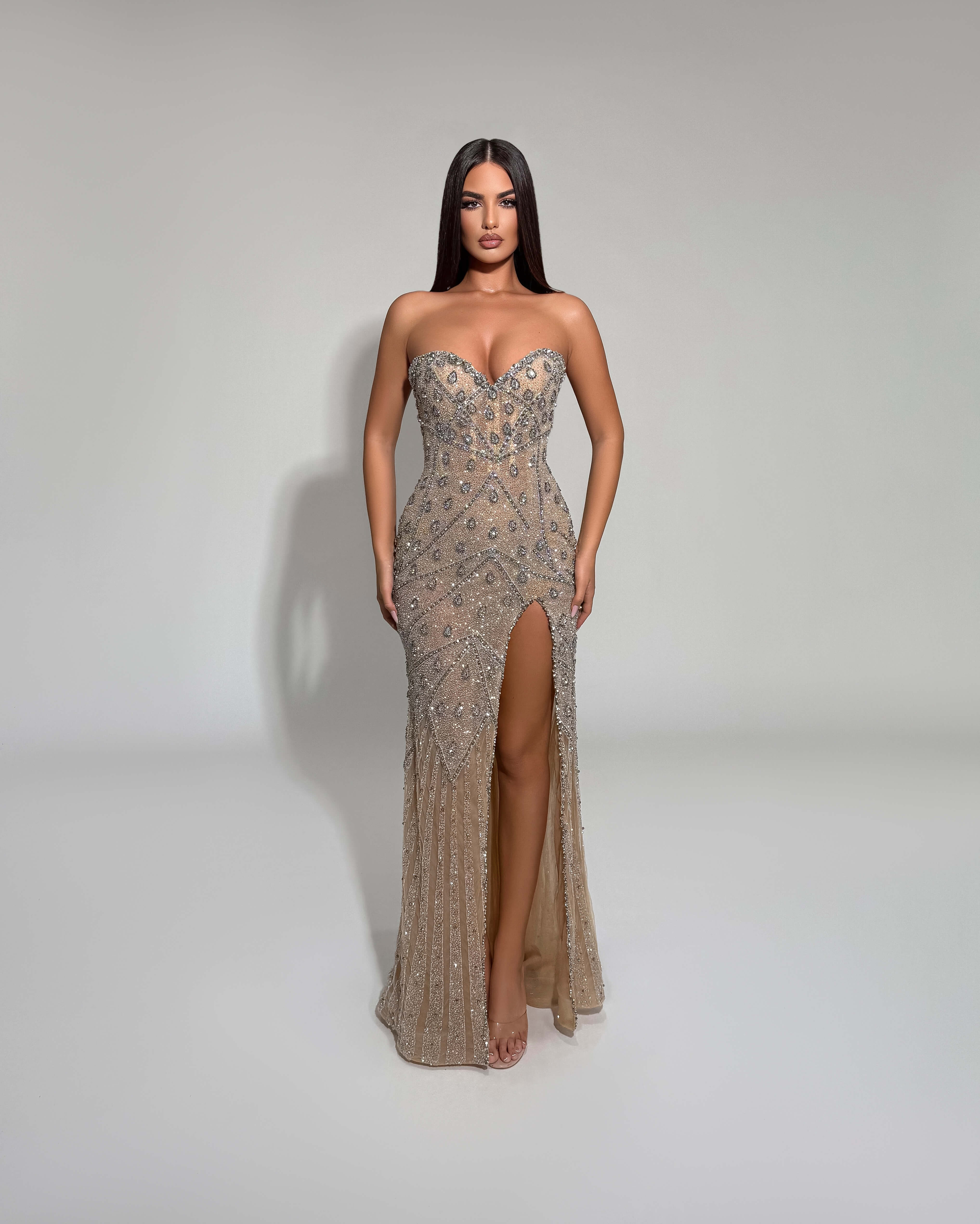Strapless gown with hand-applied crystals and intricate bead detailing.