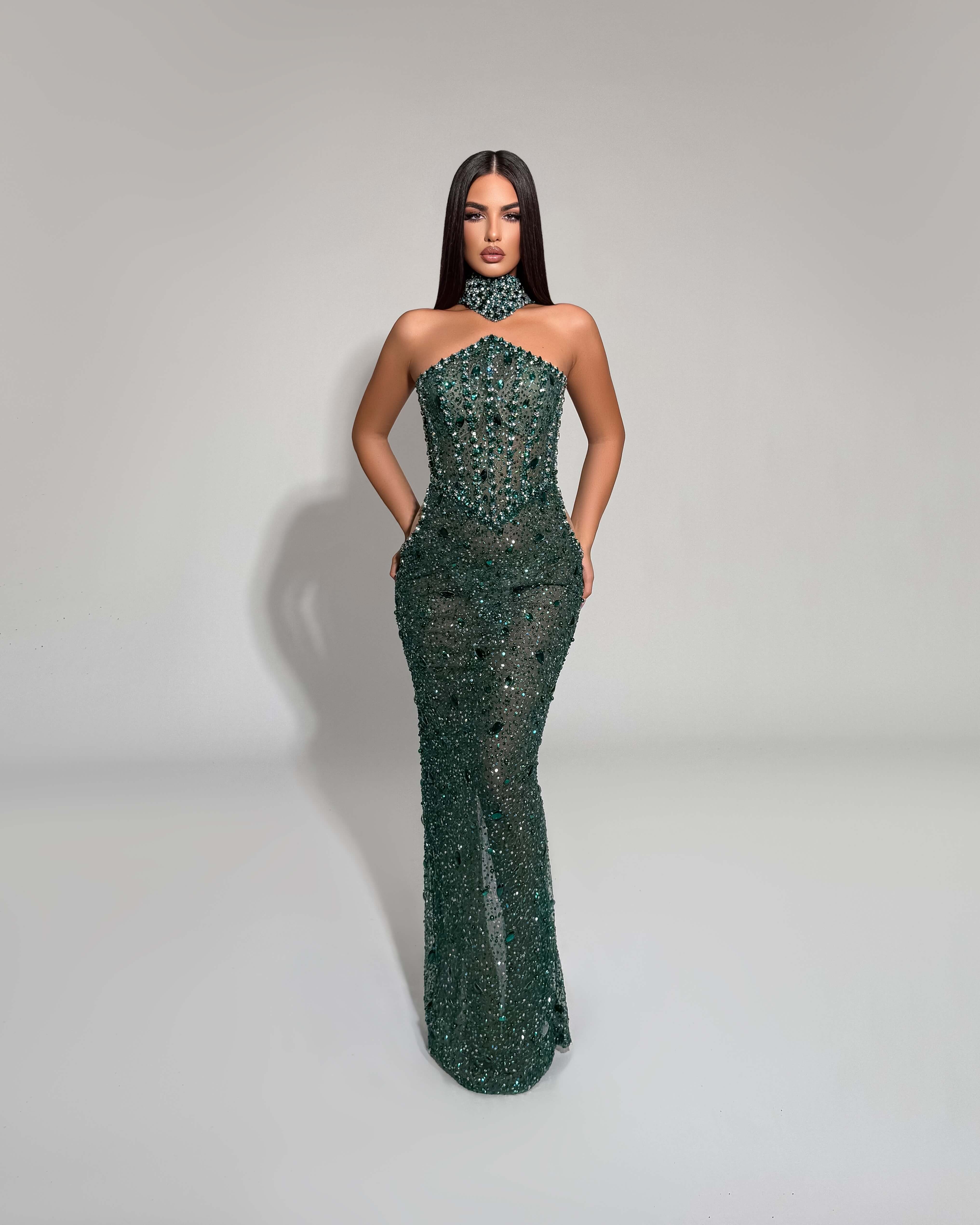 Emerald green gown featuring a high halter neckline and a figure-hugging silhouette.