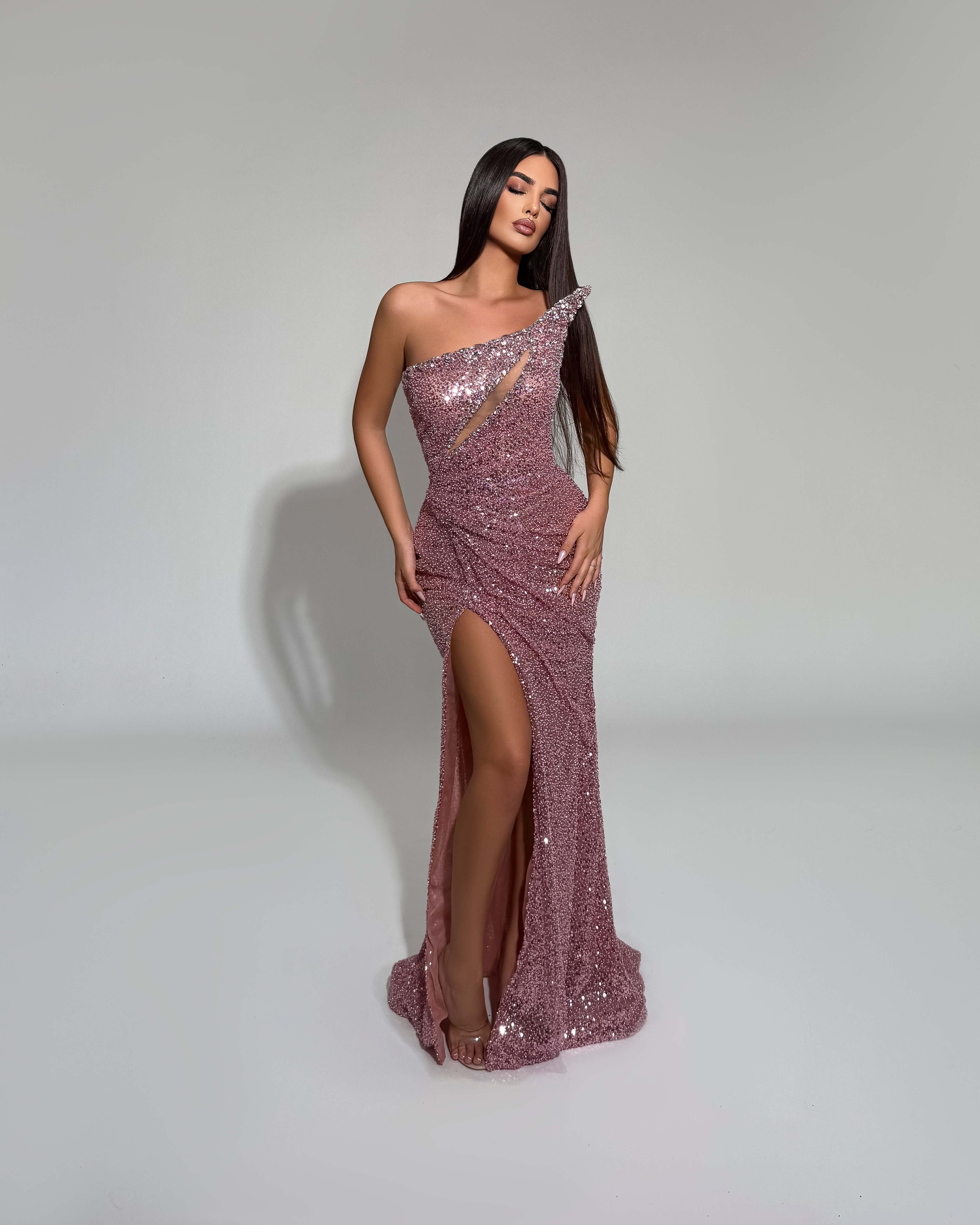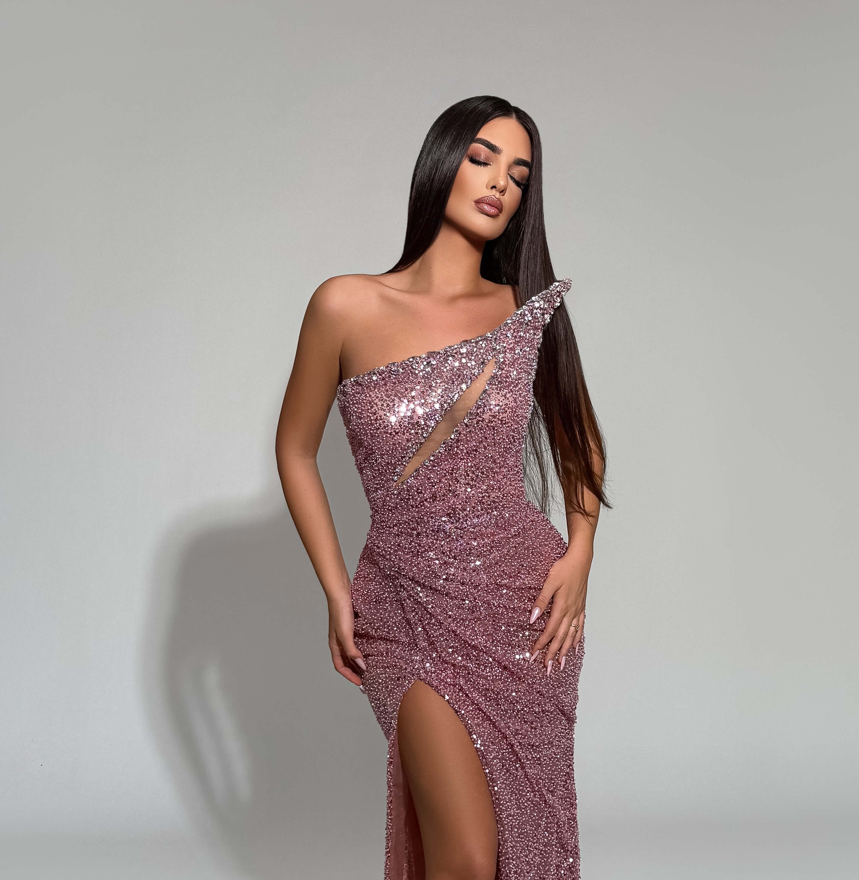 Radiant rose gown crafted from shimmering sequins with an elegant one-shoulder neckline.