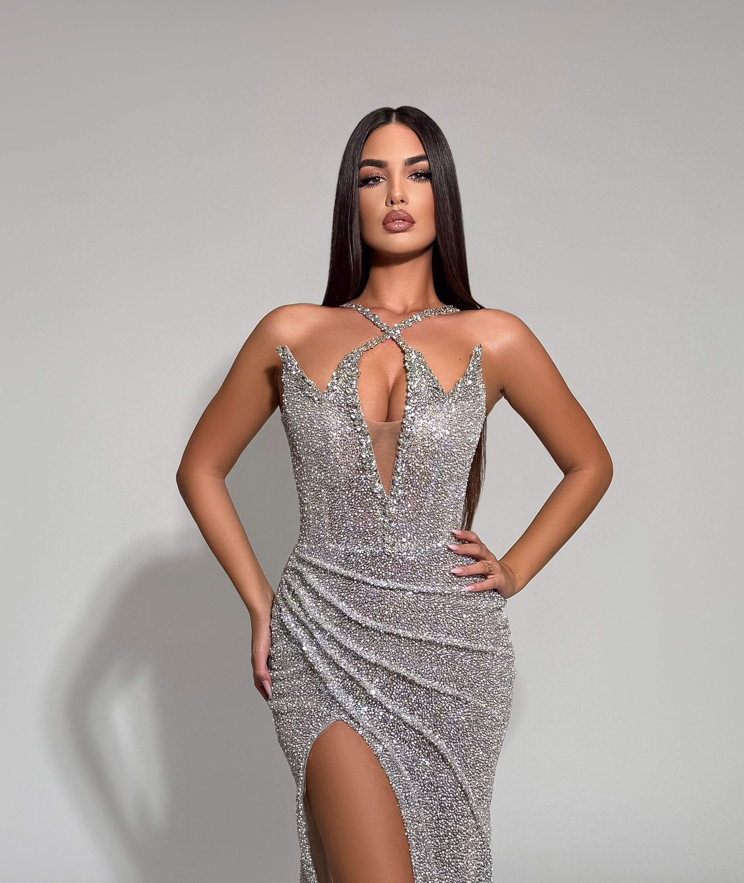 Shimmering silver gown with a cross-neck cutout design and crystal accents.