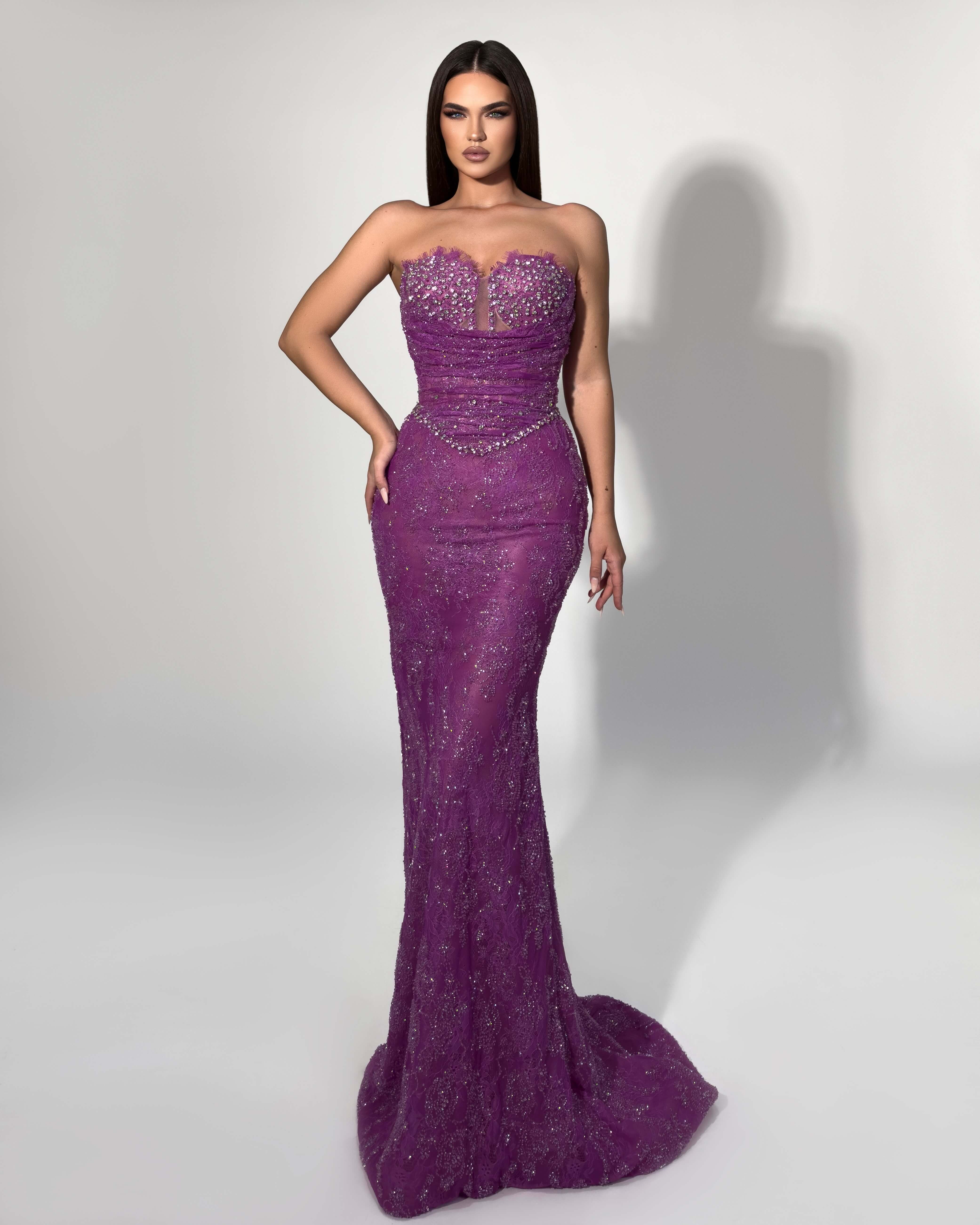 Radiate elegance in this stunning purple mermaid gown featuring allover crystal beading. The strapless sweetheart bodice showcases intricate embellishments, while ruched detailing at the waist creates a flattering silhouette. Sheer beaded fabric flows into a dramatic train. Perfect for galas, proms, and show-stopping evenings.