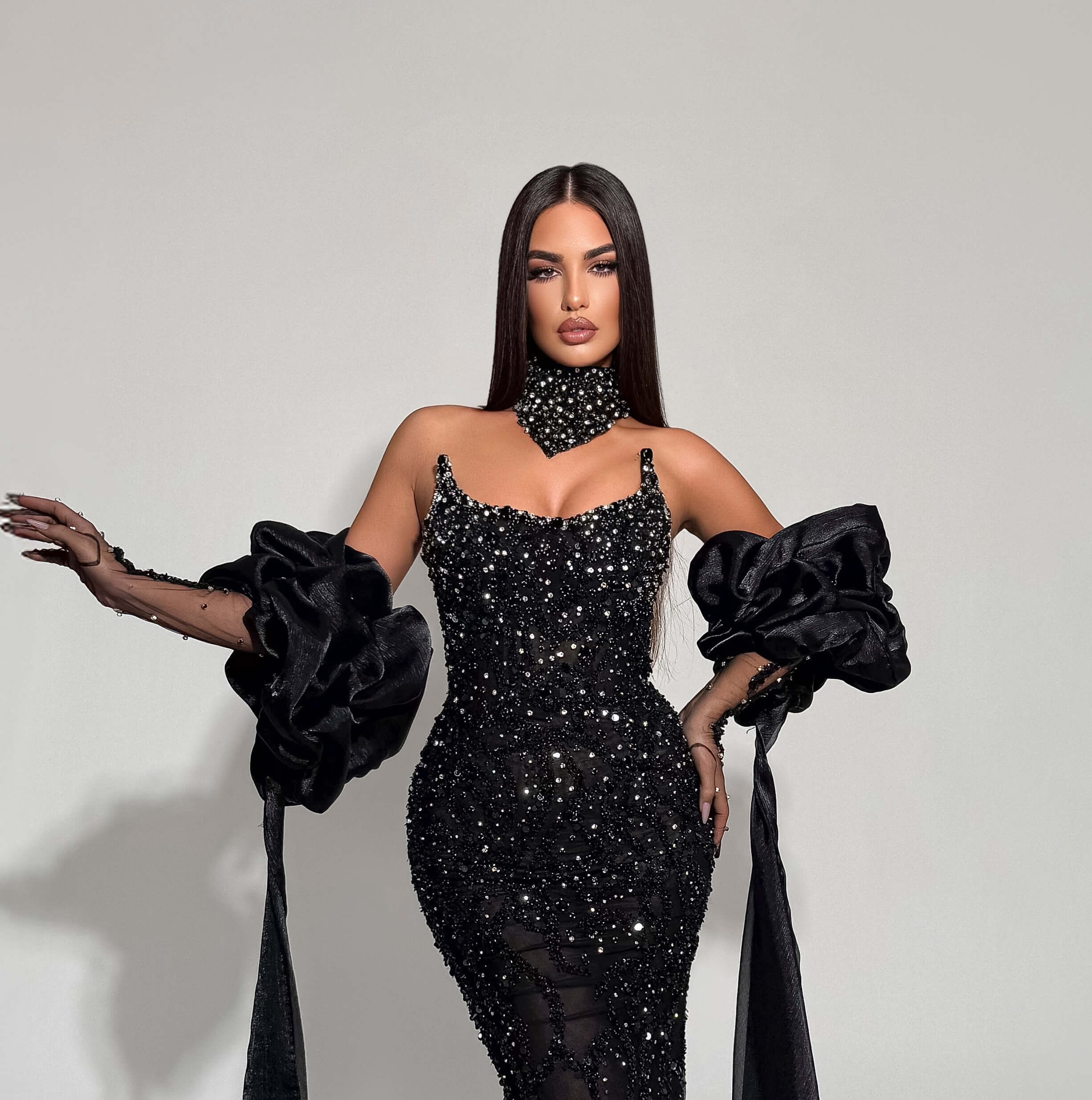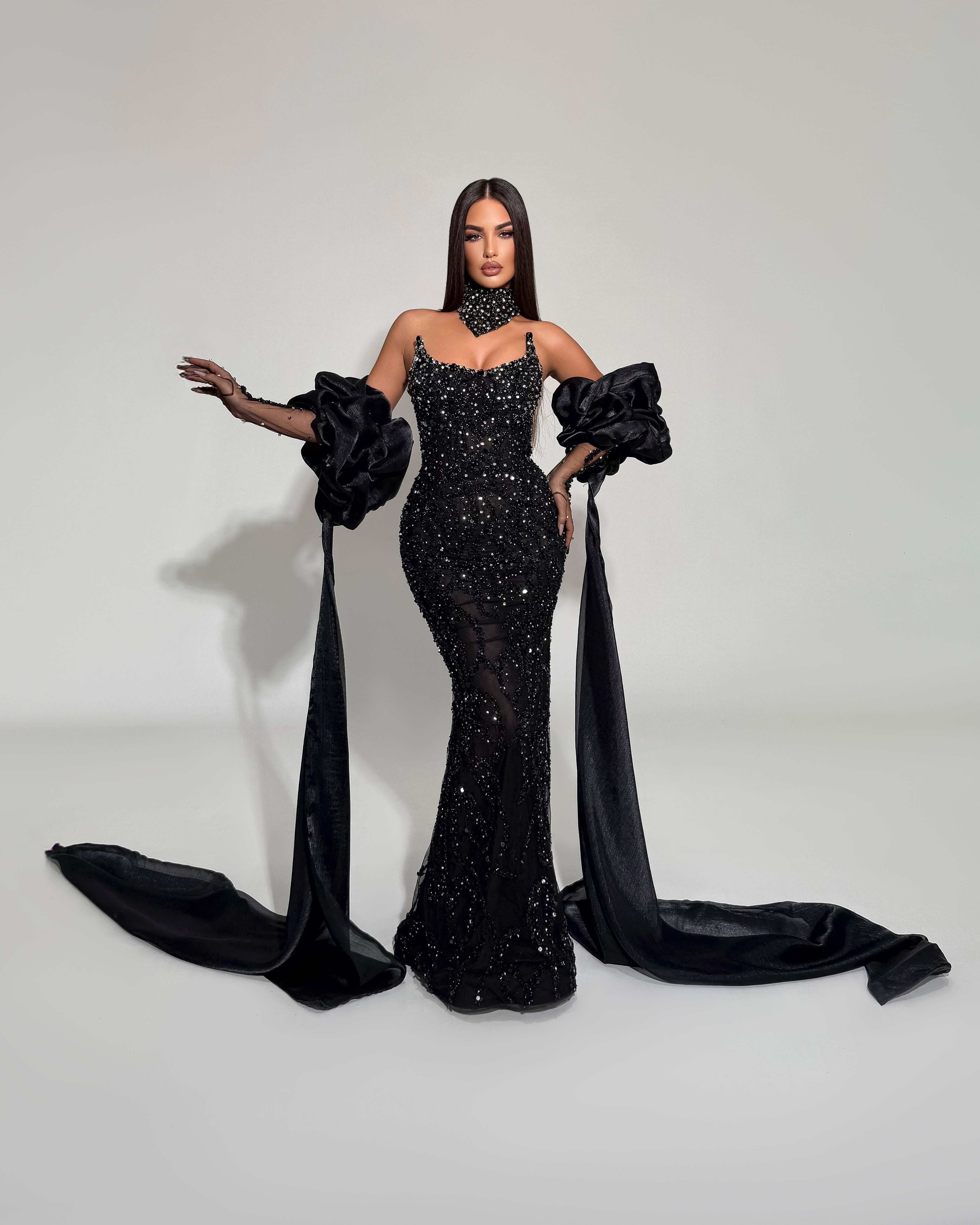 Striking black gown adorned with shimmering crystals and a sculpted neckline.