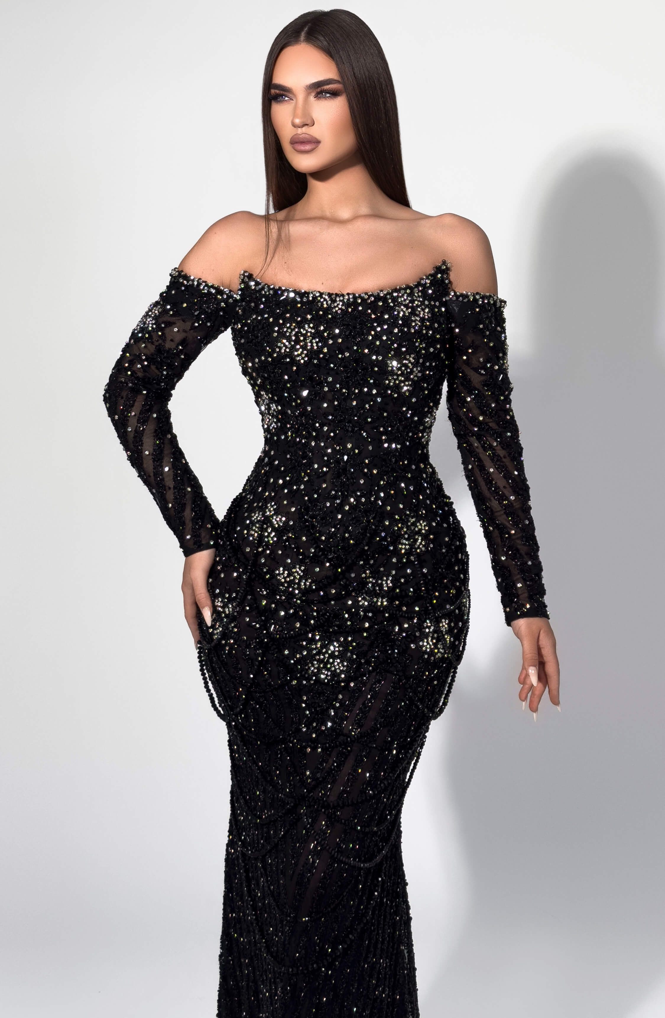 Make an unforgettable entrance in this hand-embellished gown. Thousands of shimmering crystals create a luminous silver finish, while the figure-sculpting silhouette and thigh-high slit deliver modern glamour. Designed for galas, black-tie events, and moments that demand show-stopping elegance.