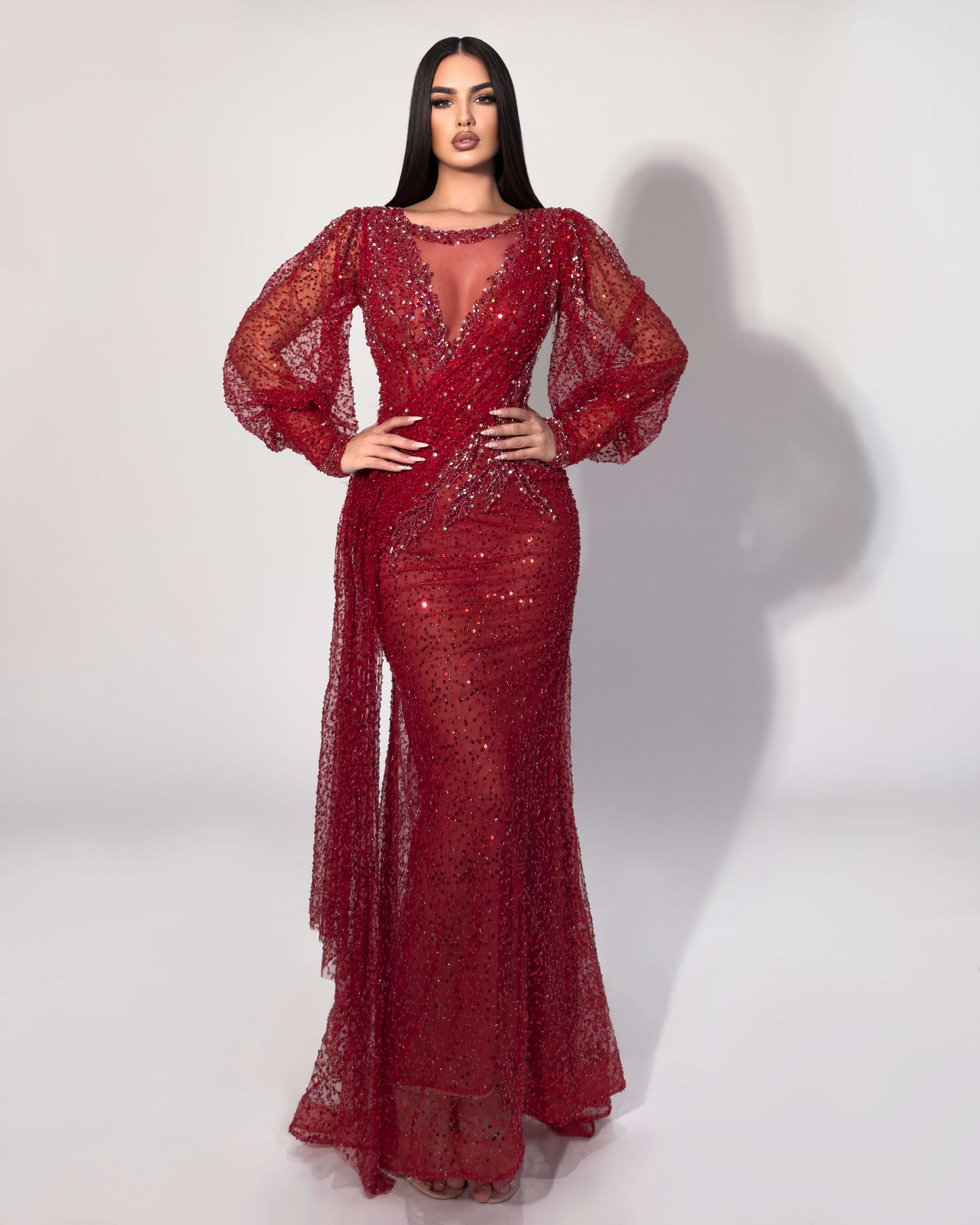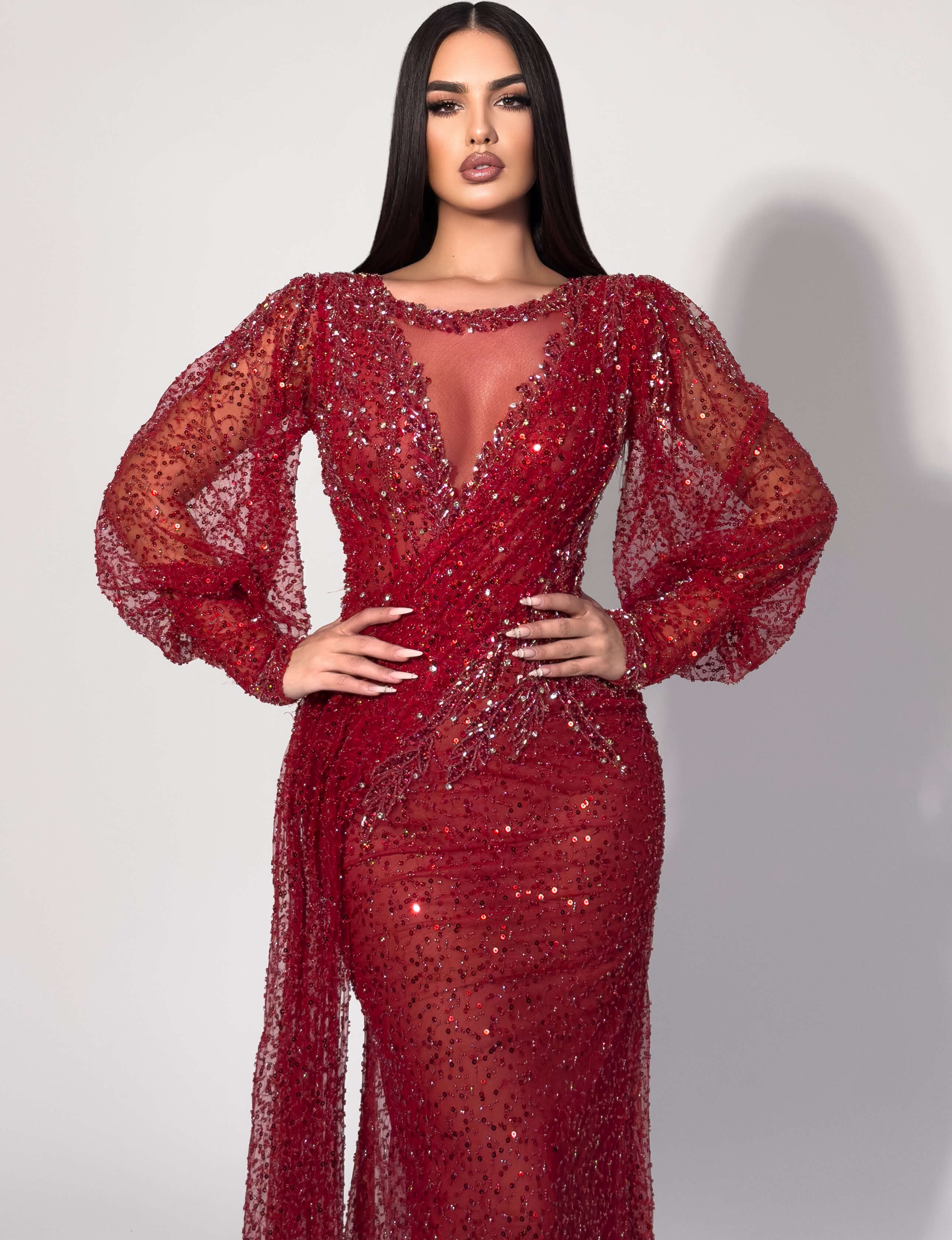 - Sheer illusion sleeves with all-over beaded embellishments