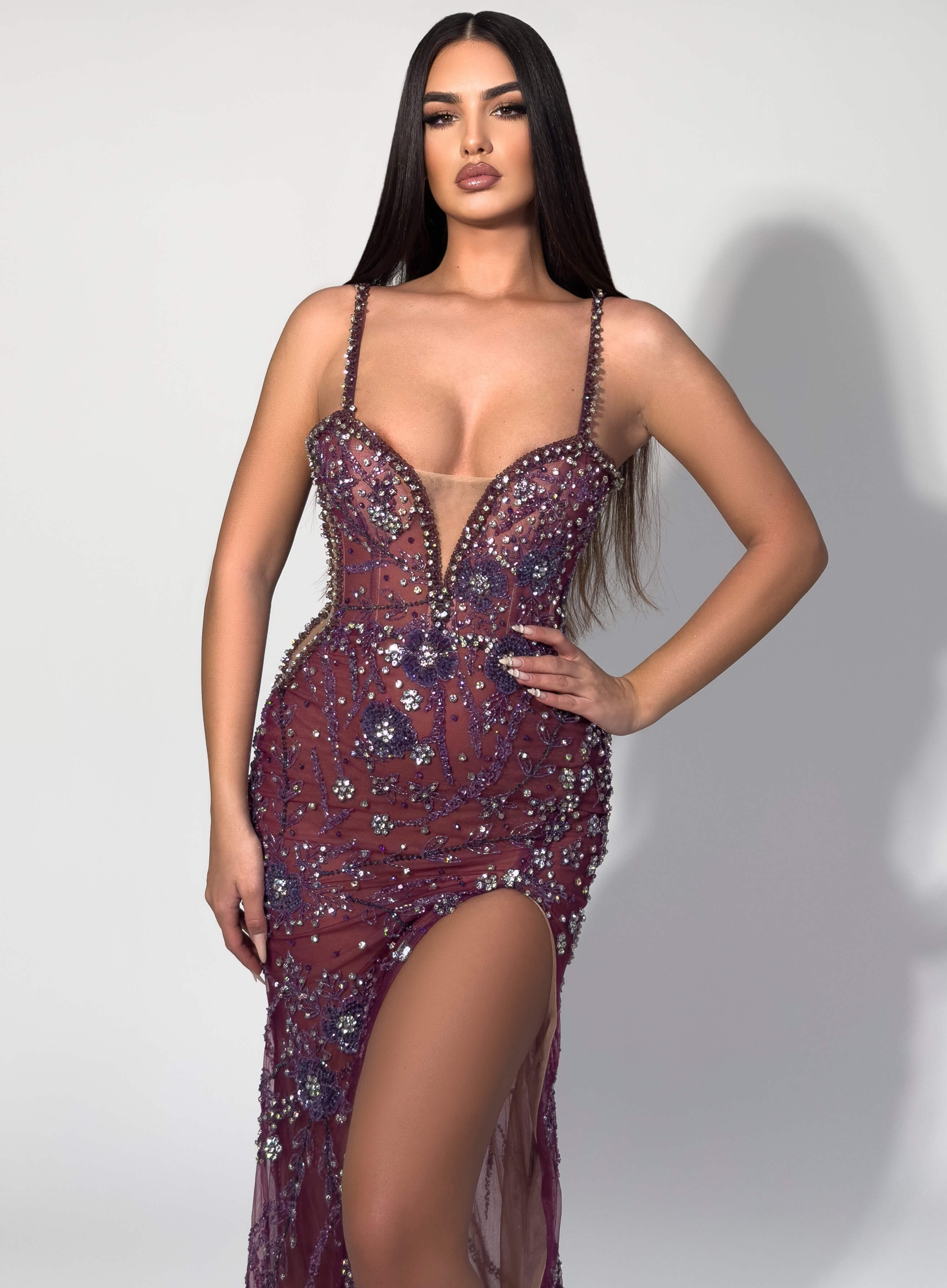 - Sheer illusion mesh with scattered crystal and bead detailing