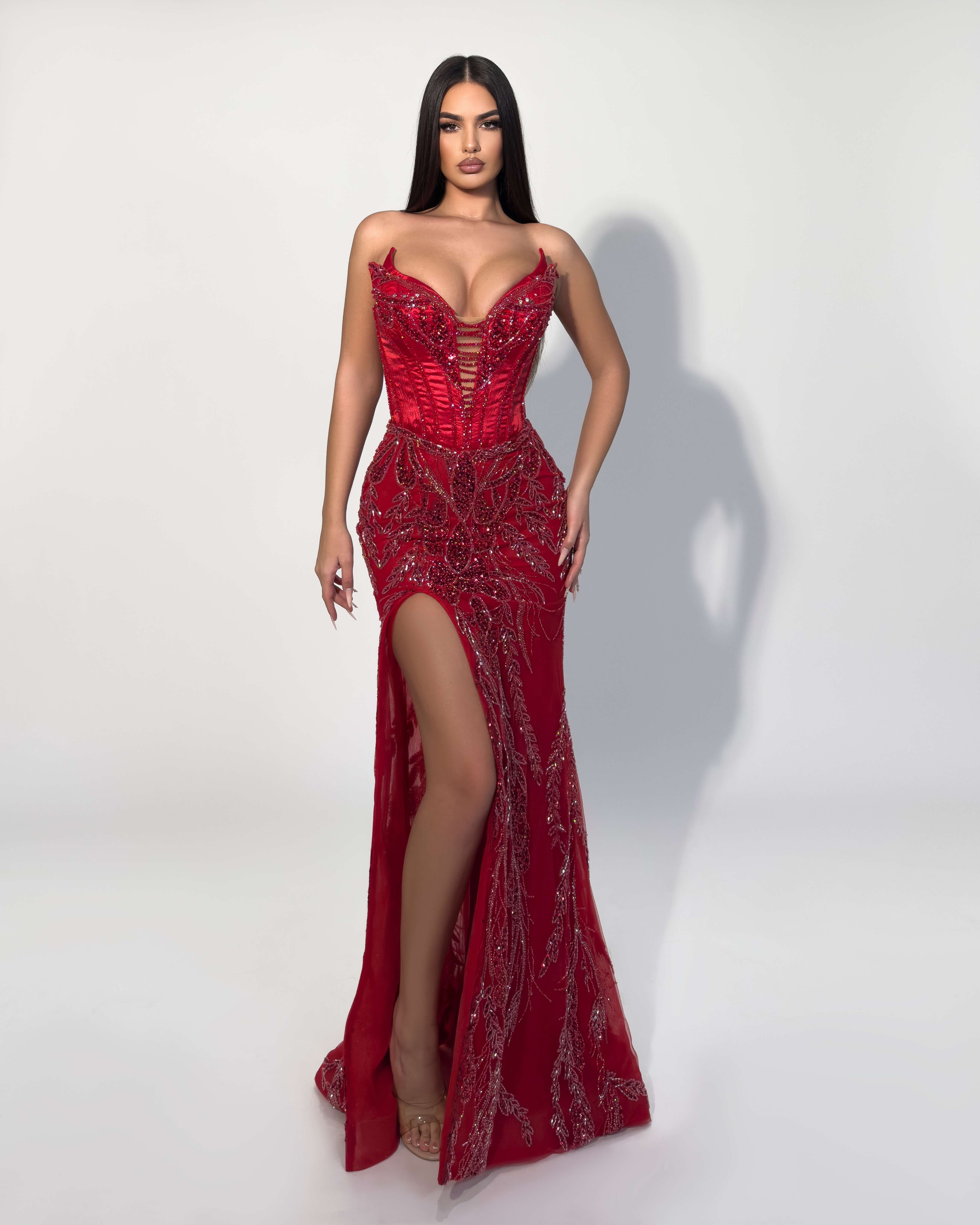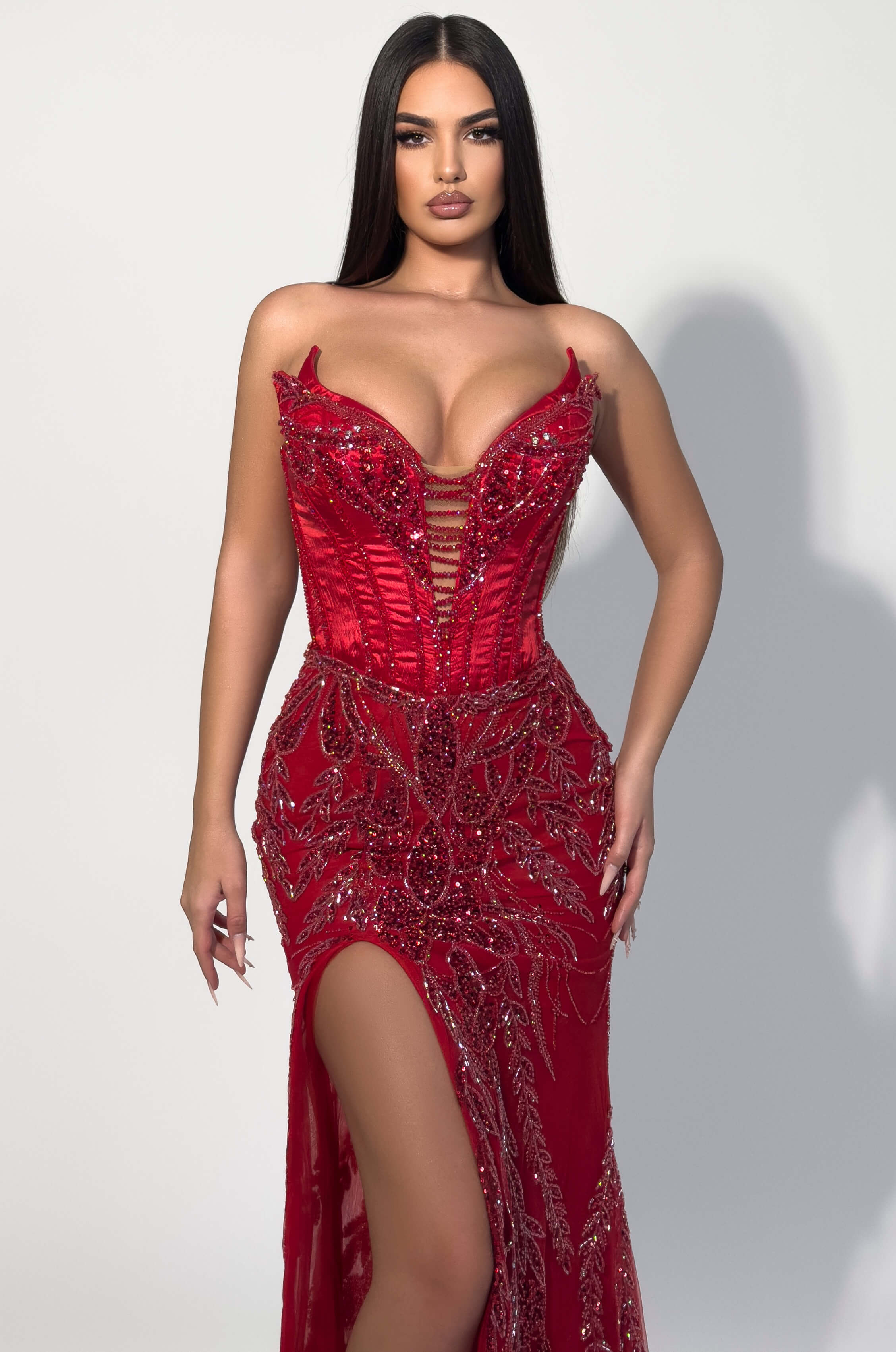 - Plunging sweetheart neckline with crystal-encrusted corset bodice