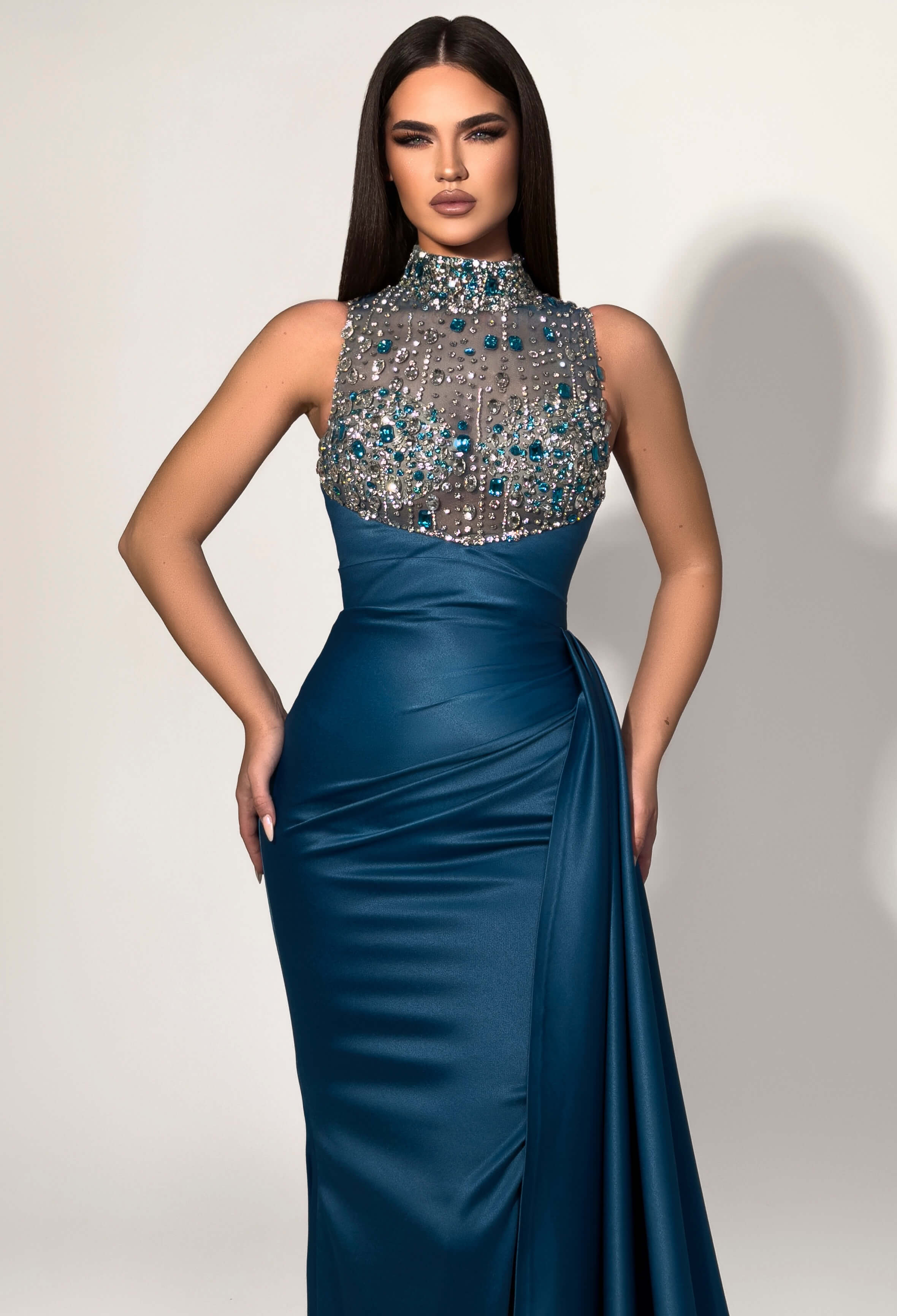 Sophisticated glamour defines this stunning high-neck gown in rich teal. The illusion bodice features intricate crystal and emerald-tone beading, while the luxurious satin skirt creates a sleek, figure-defining silhouette with a dramatic train and front slit. Perfect for galas, formal weddings, and elegant evening affairs.