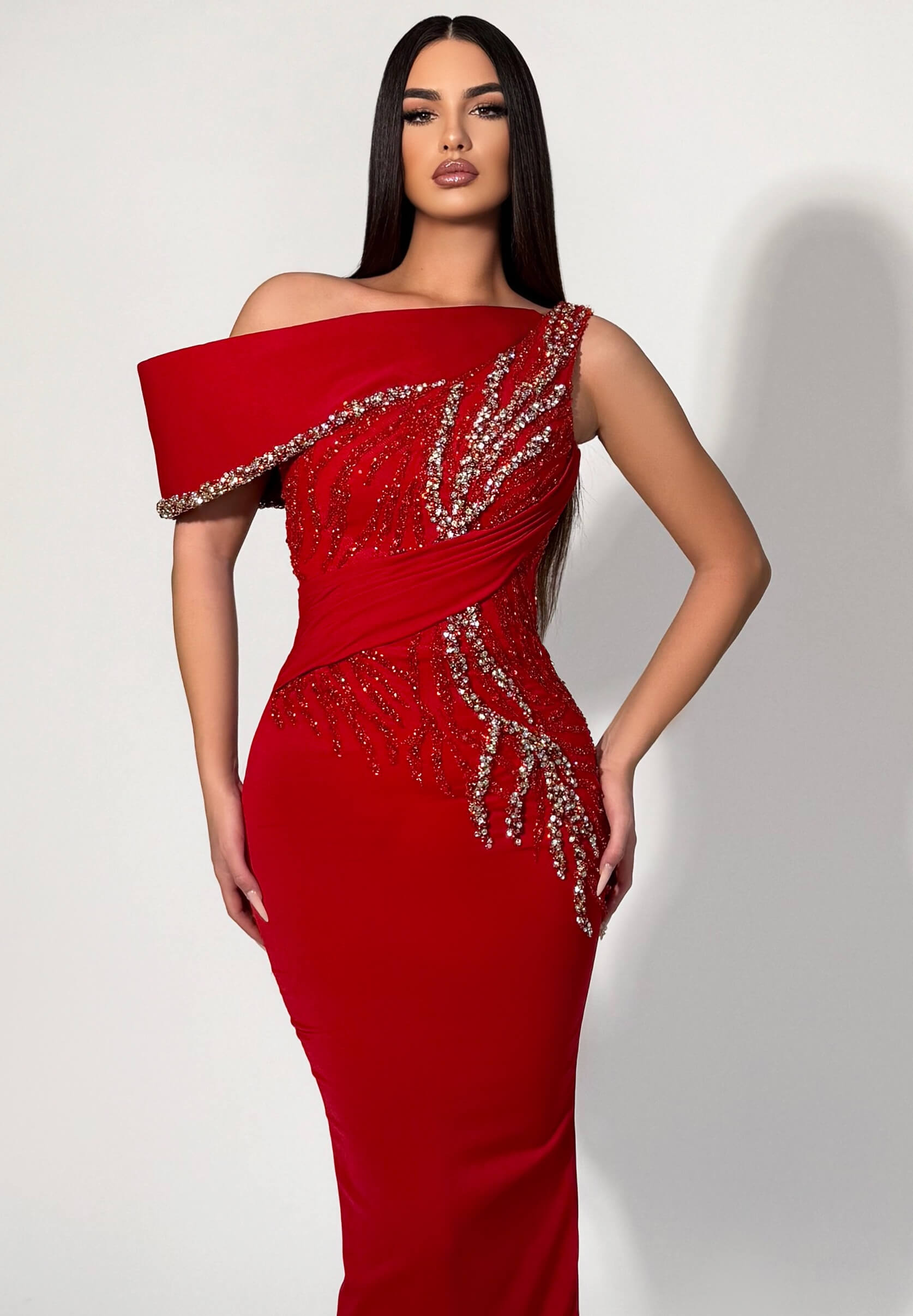 • Sleek red skirt with side crystal flame detail