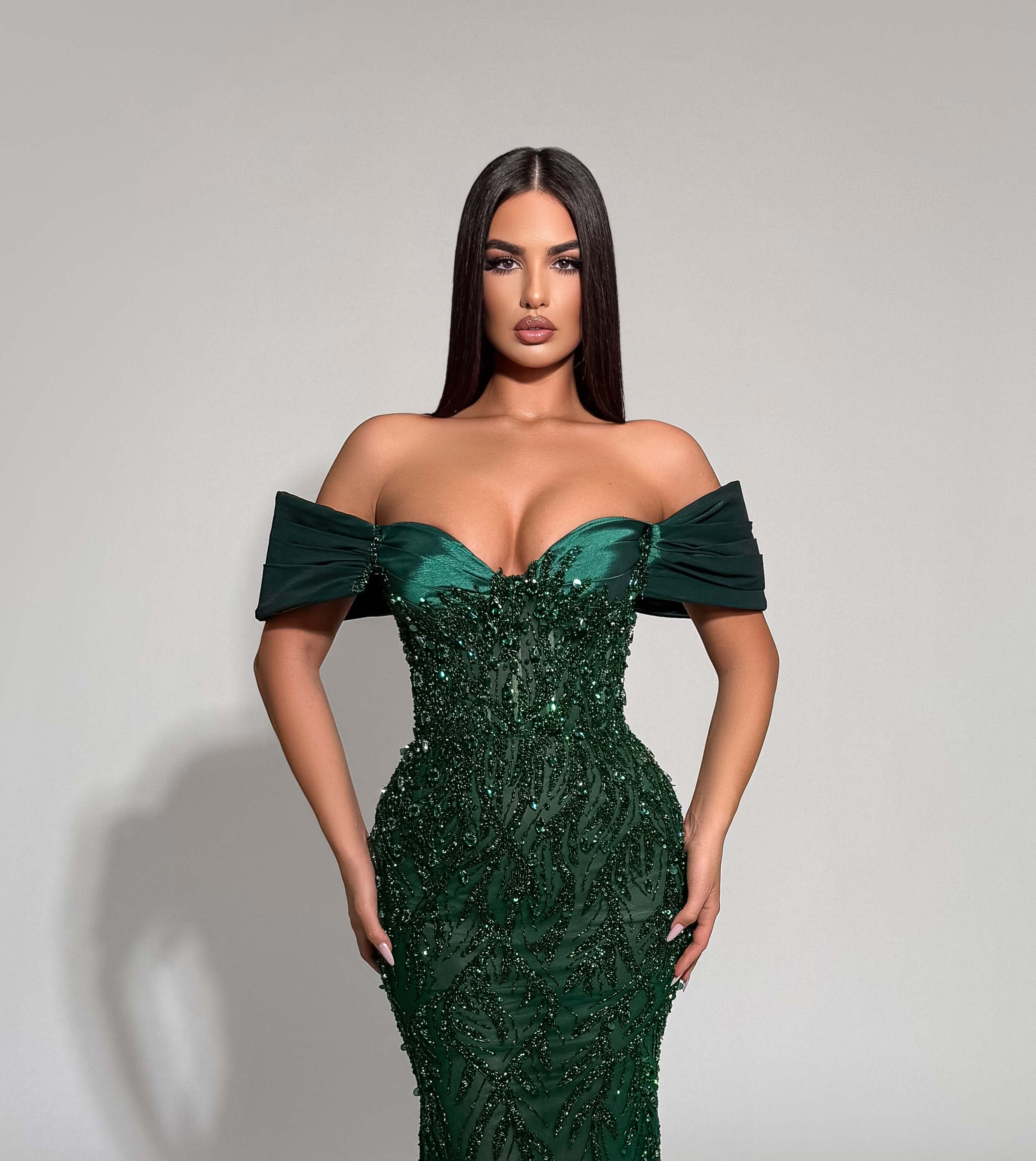 Luxurious emerald gown featuring an off-shoulder draped neckline and intricate hand-beaded details.