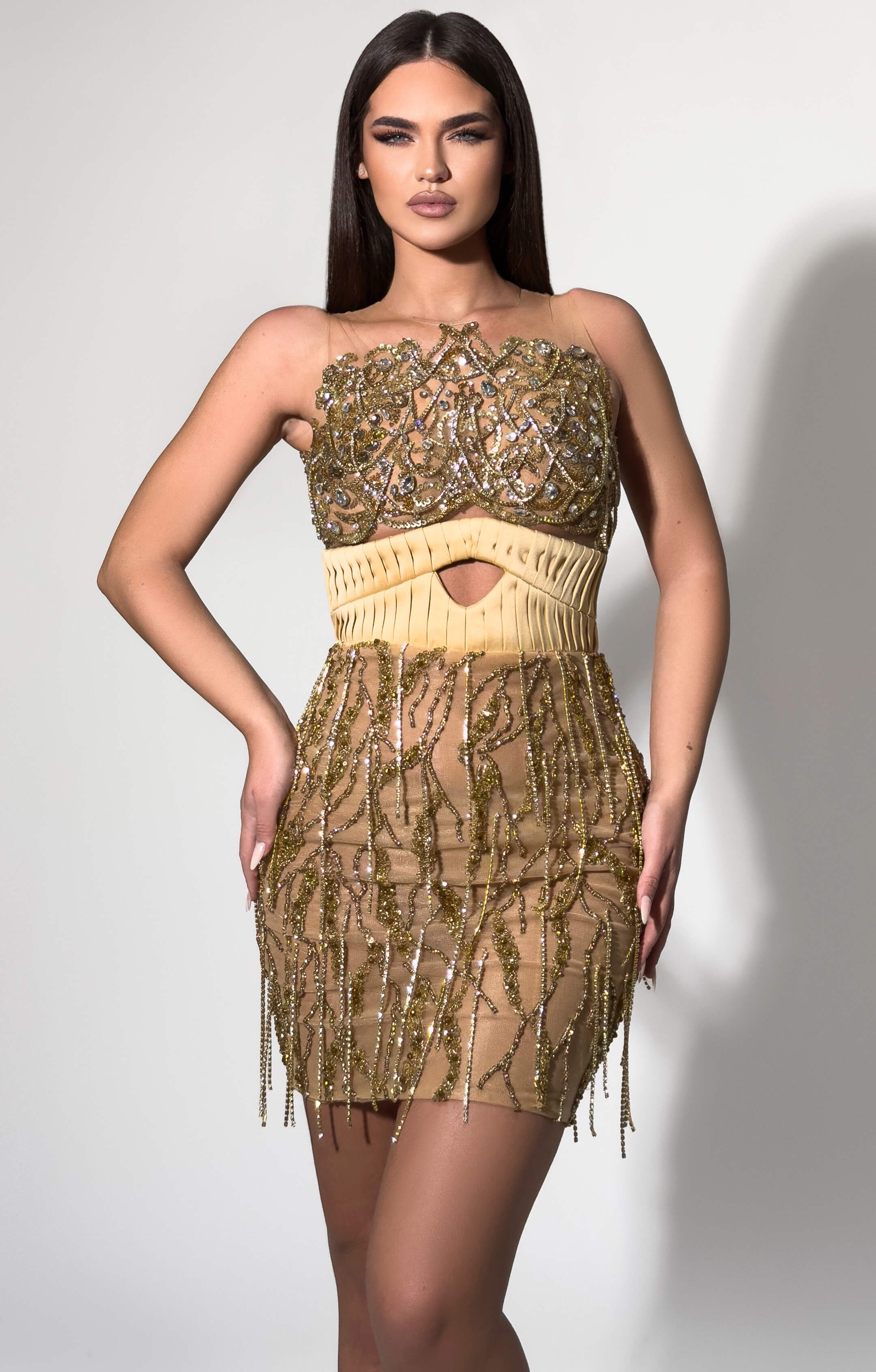 - Beaded mini skirt adorned with cascading fringe trim for movement and drama