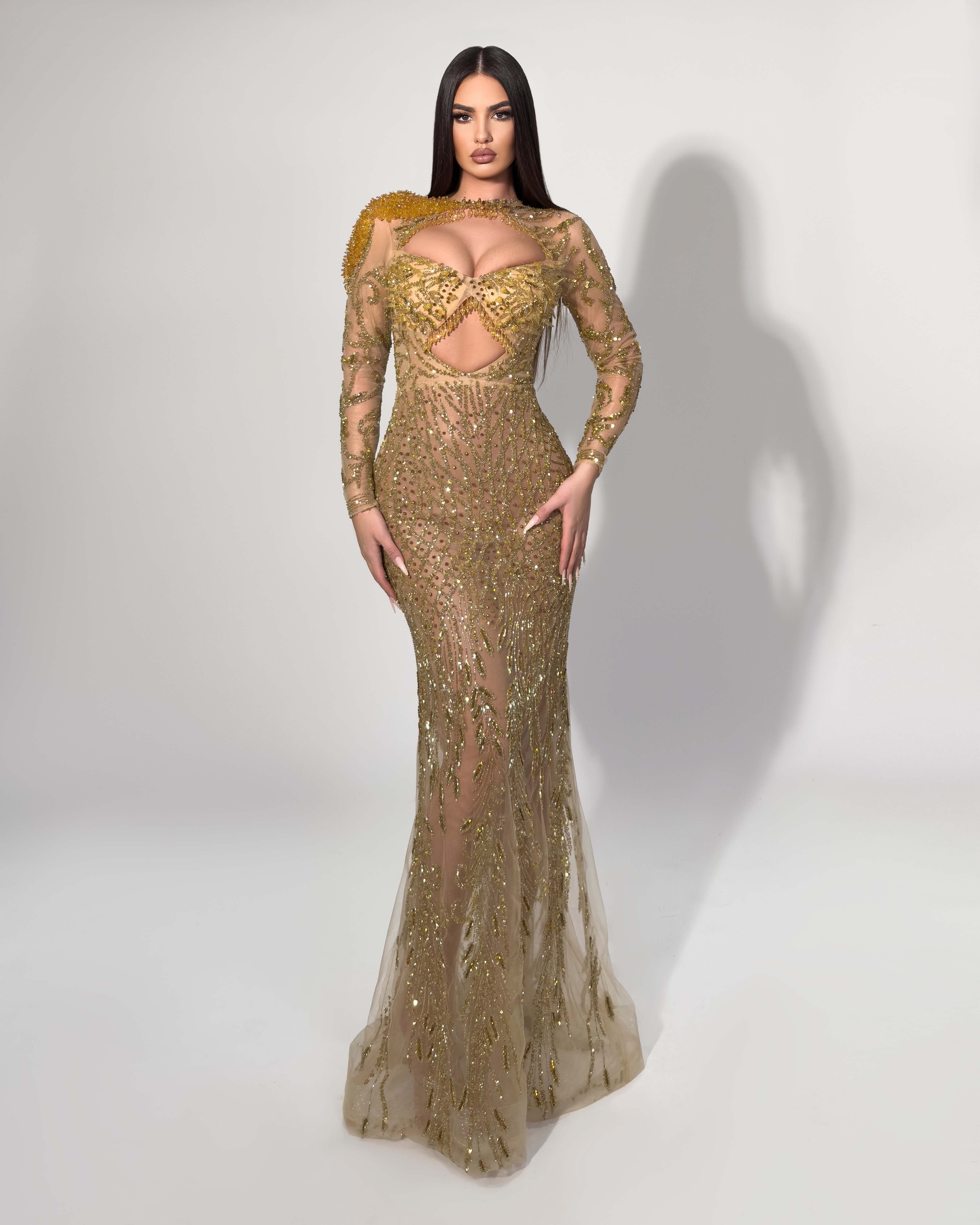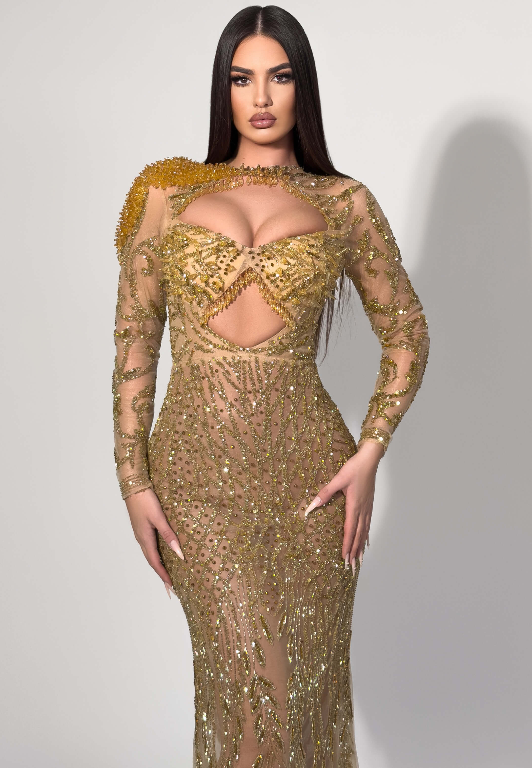• Sheer illusion long sleeves and neckline adorned with intricate gold beadwork