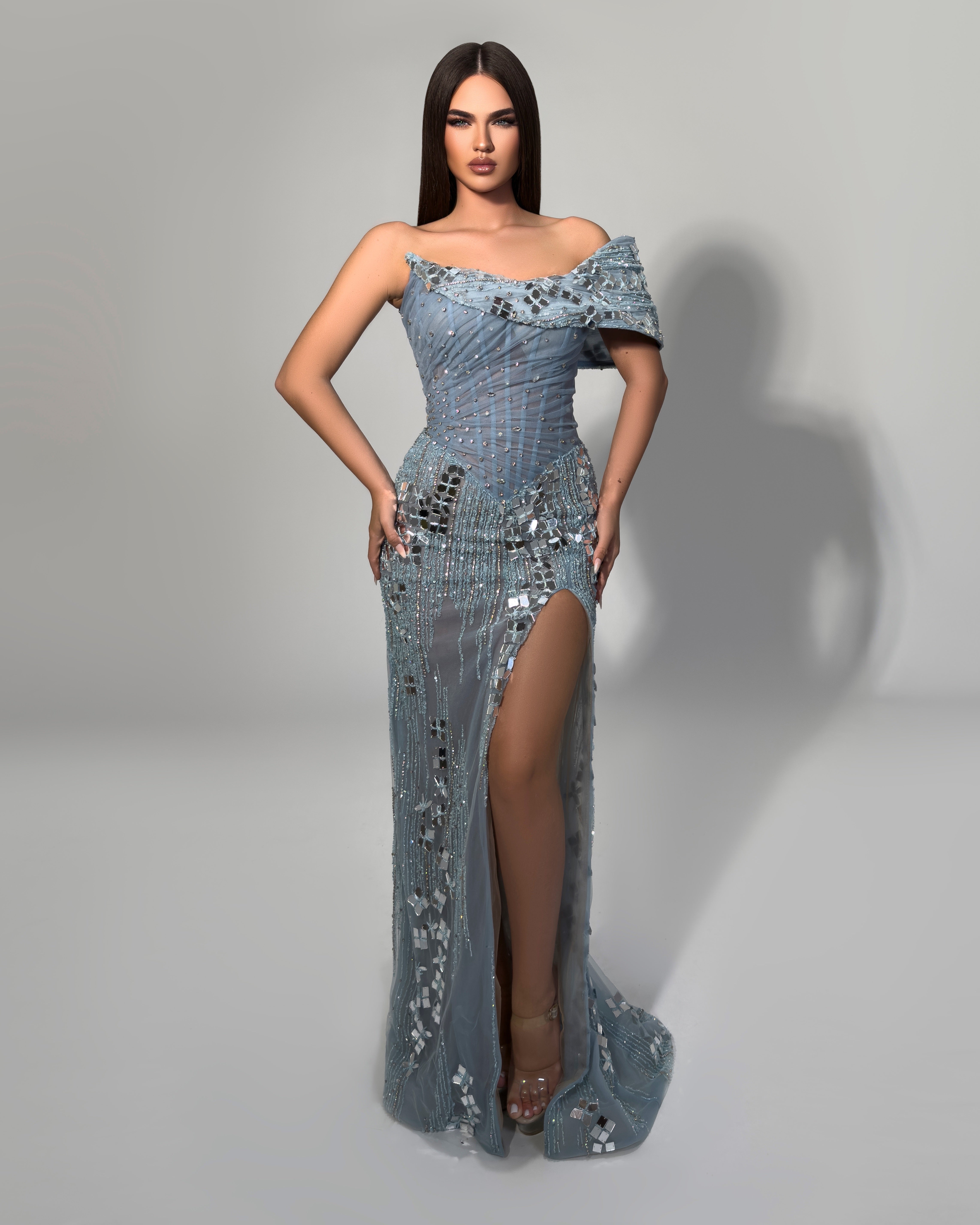 One shoulder design with hand placed mirror and bead detailing
