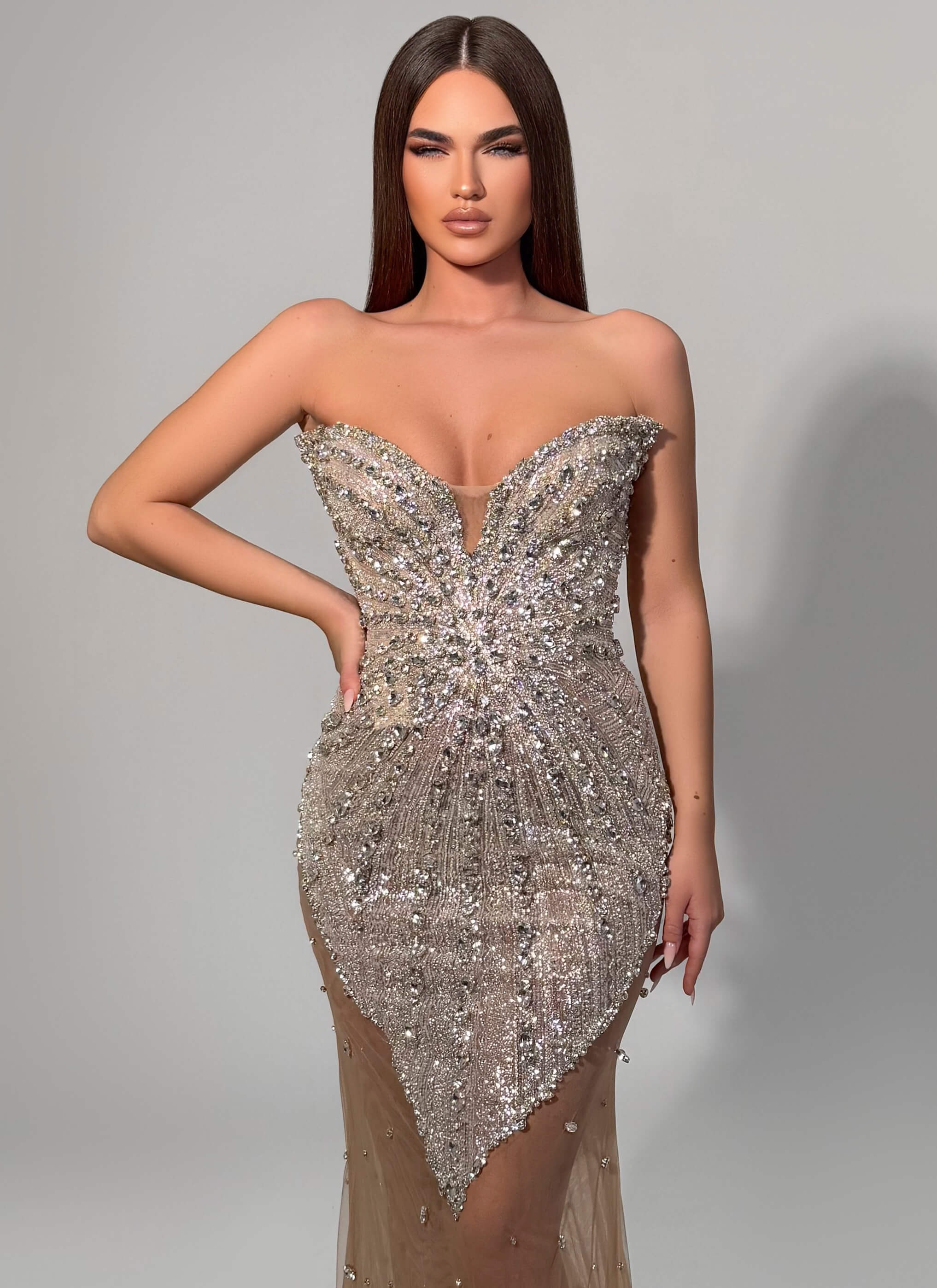 Captivating silver gown with intricate beaded embellishments throughout. Features a plunging sweetheart neckline with sheer illusion panels and a figure-hugging mermaid silhouette. Perfect for red carpet events and glamorous evenings.